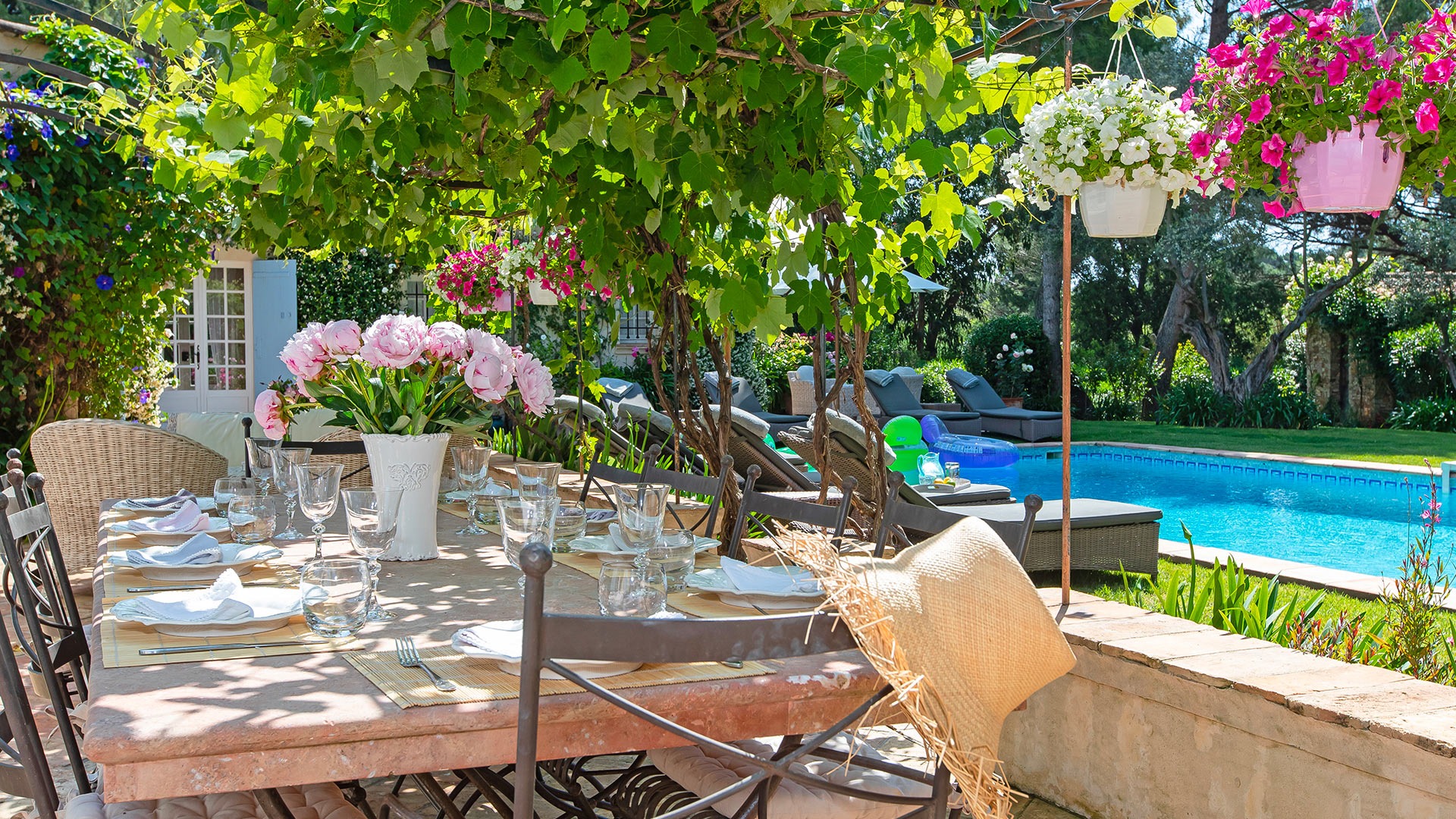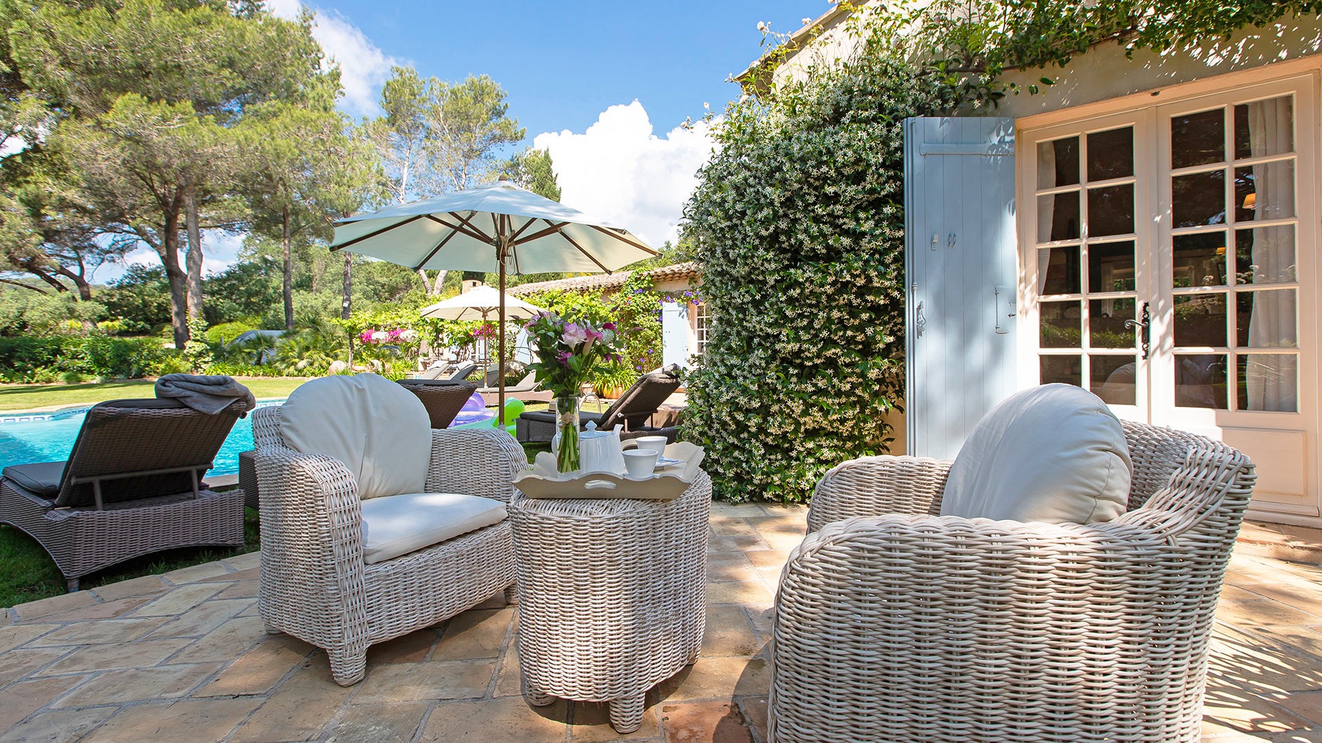 Un salon d’été et une grande terrasse ombragée sont parfaits pour profiter des douces soirées méditerranéennes.