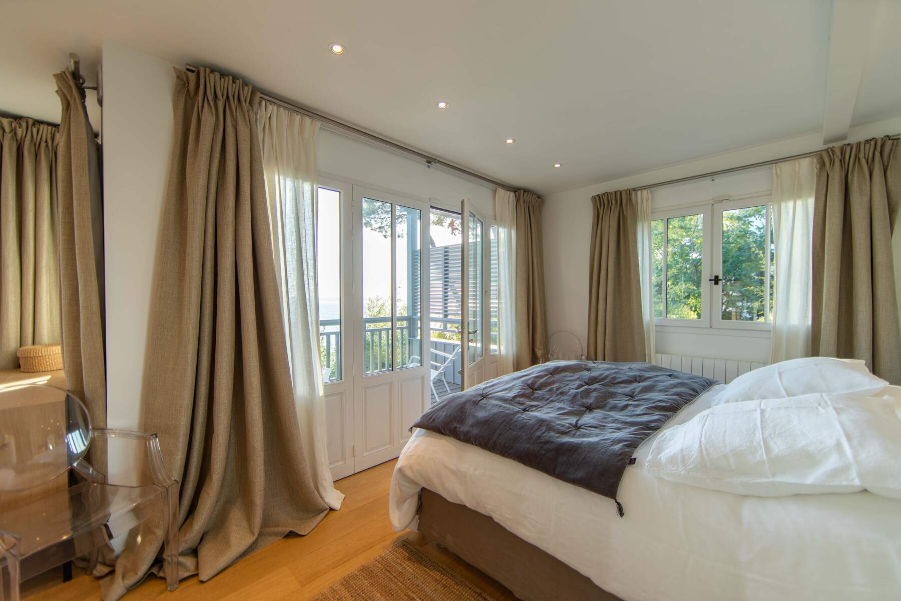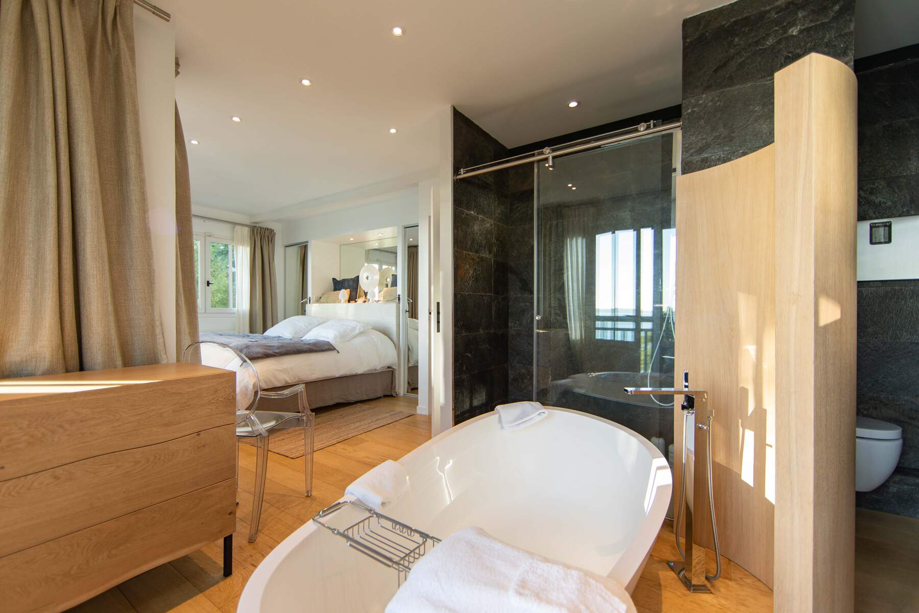 Location d’une villa de 200 m² avec 5 belles chambres et 4 salles de bain. En effet, la villa Dune du Cap est une charmante cabane directement pieds dans l’eau au Cap Ferret pour 10 personnes. La villa est décorée avec soin et un chic moderne qui la rends très agréable. Les pièces de vie sont claires et bien aménagées avec des matériaux modernes. Le petit côté design donne à cet intérieur la touche luxueuse pour un confort pratique. De plus, la cuisine est entièrement équipée et spacieuse.