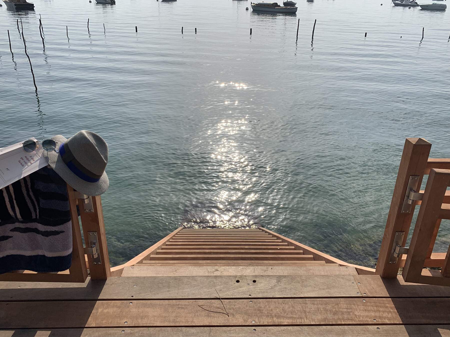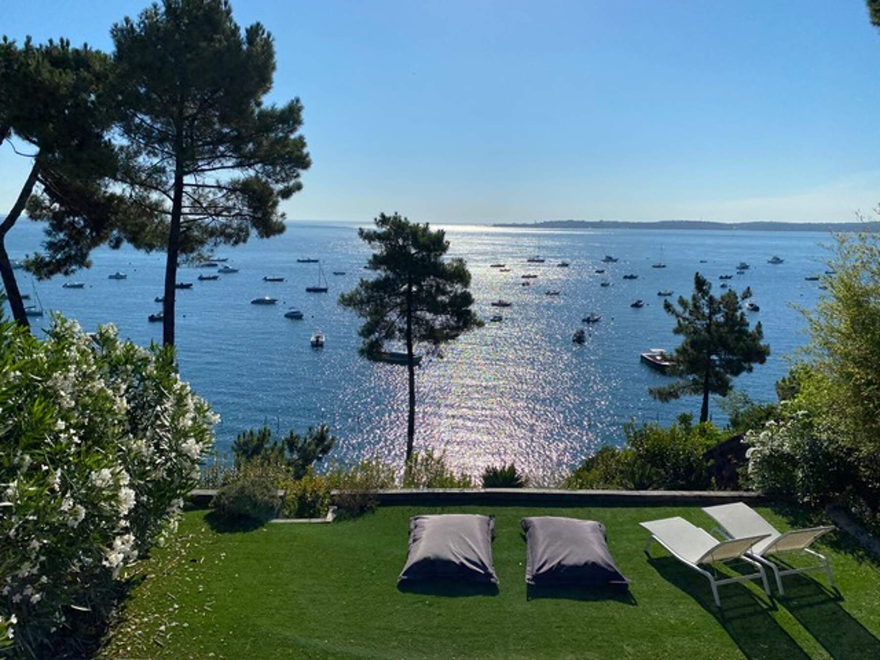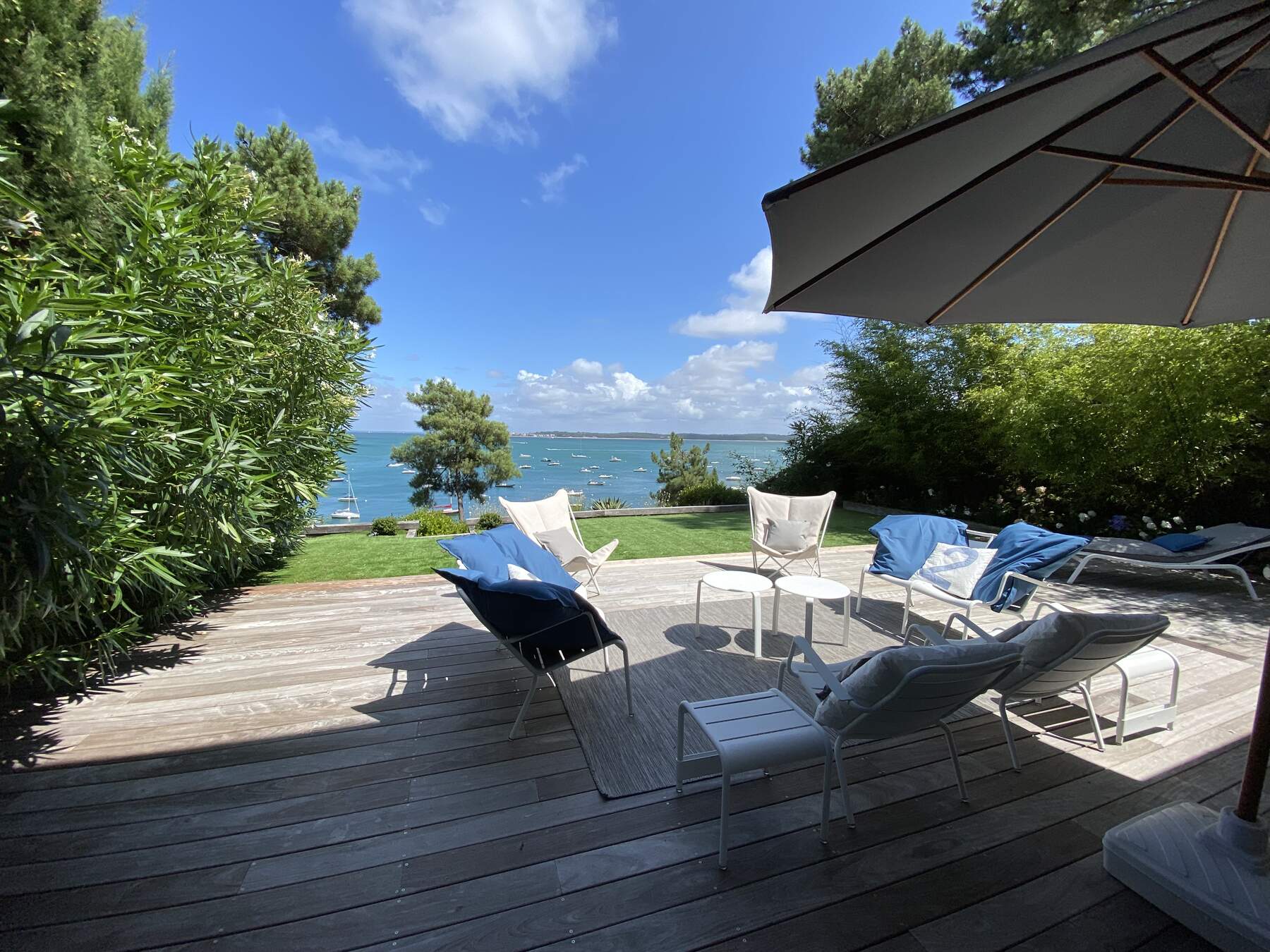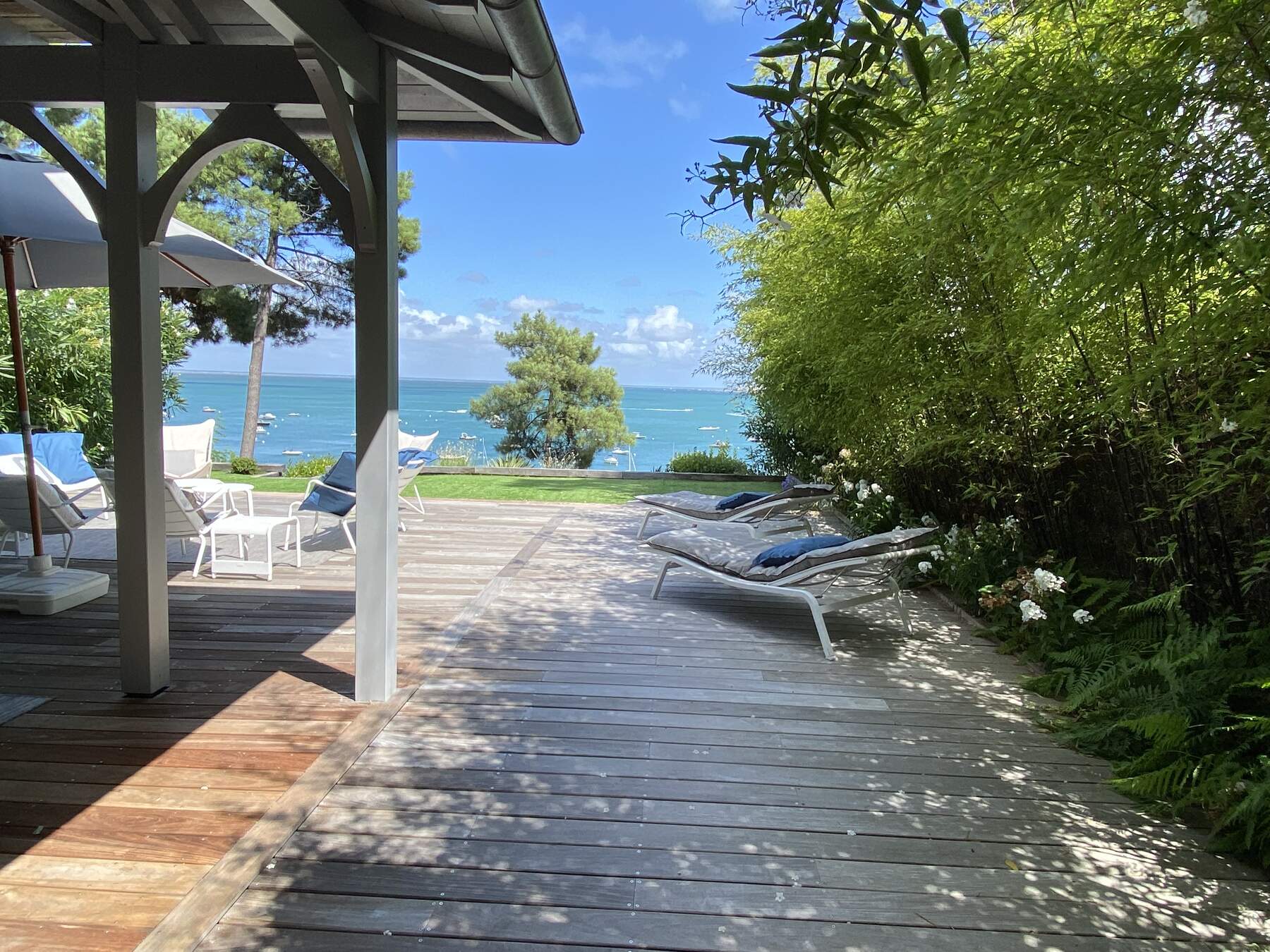 Un beau jardin qui donne directement à un petit ponton pour descendre dans l’eau.