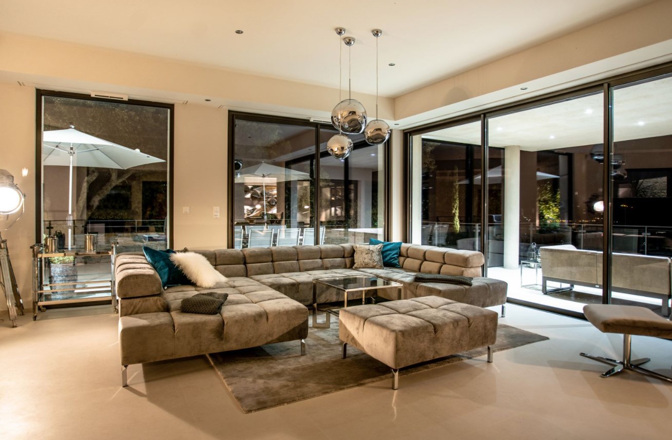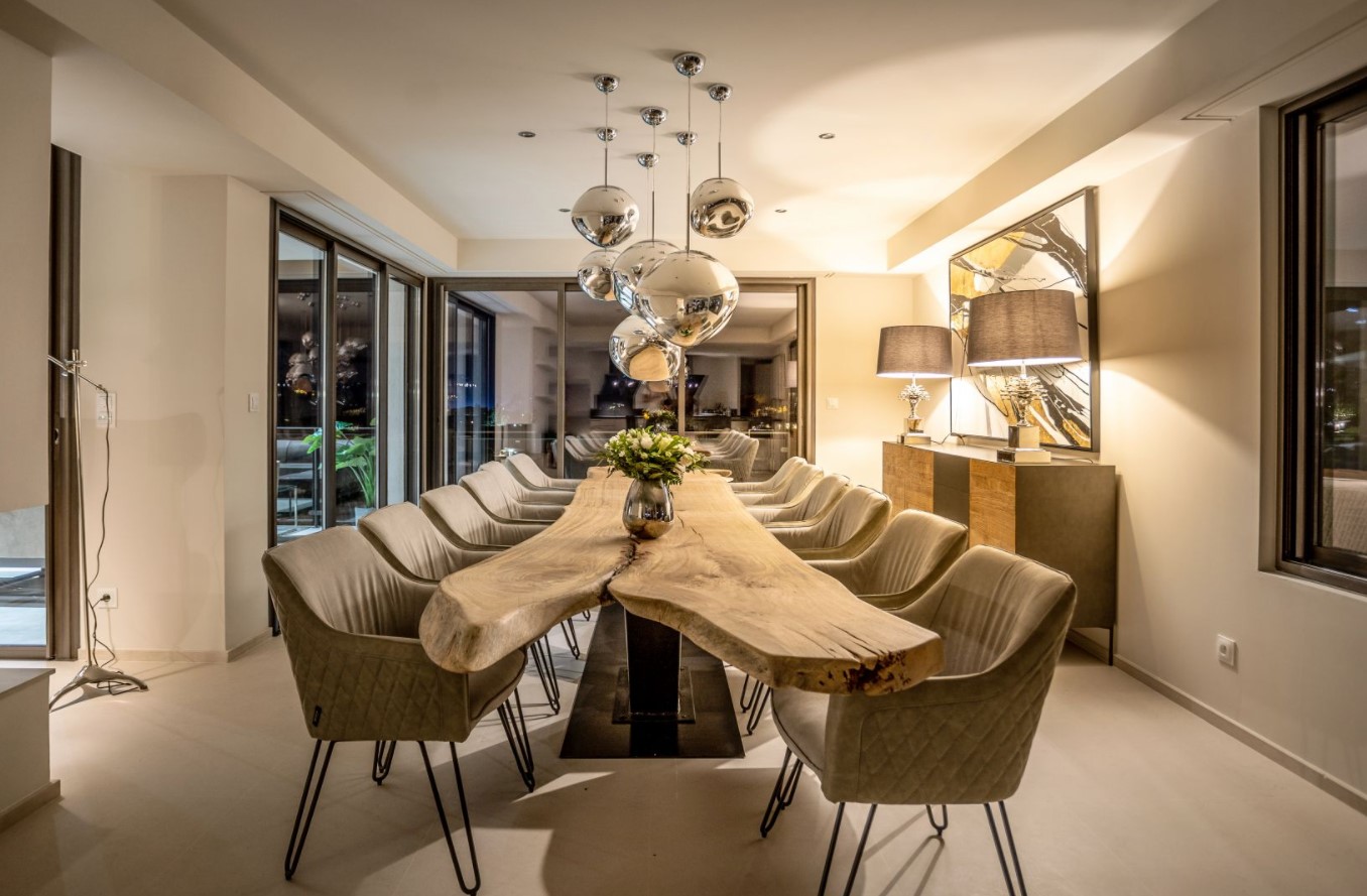 Cette villa de 680 m² a un charme intemporel avec du mobilier design. Construite sur 2 niveaux, cette villa dispose de 5 chambres et 5 salles de bain. Puis, un grand salon/ séjour avec cheminée open. De plus, une cuisine équipée comme une cuisine professionnelle s’ouvre sur l’espace repas avec une grande table en bois magnifique.