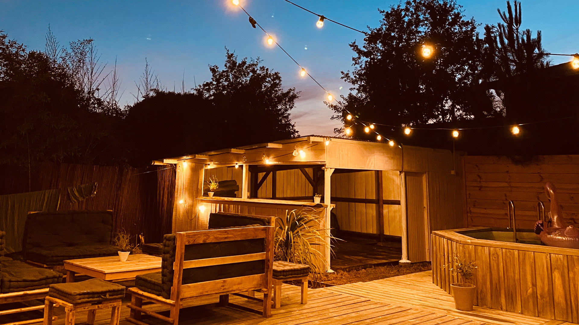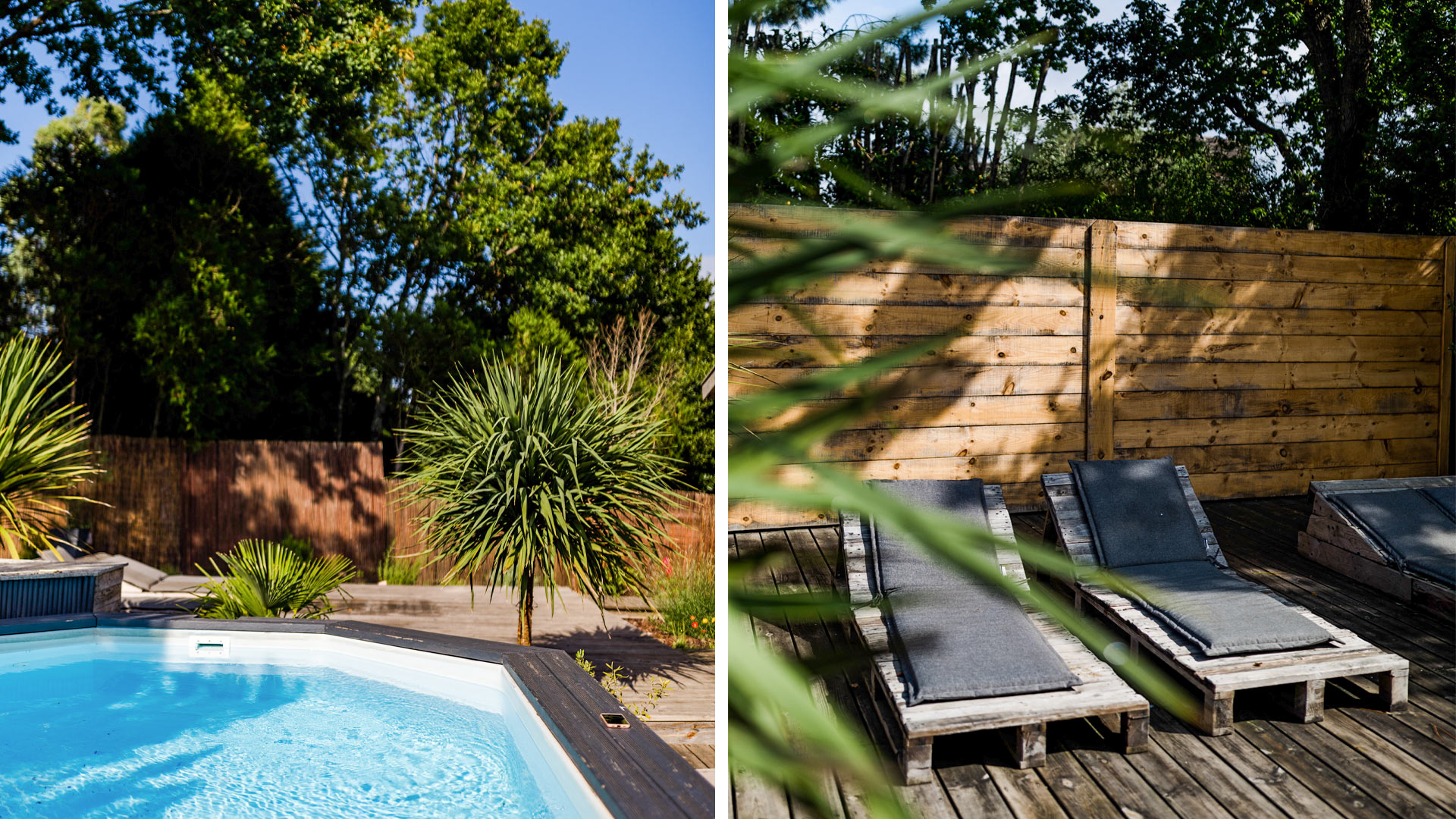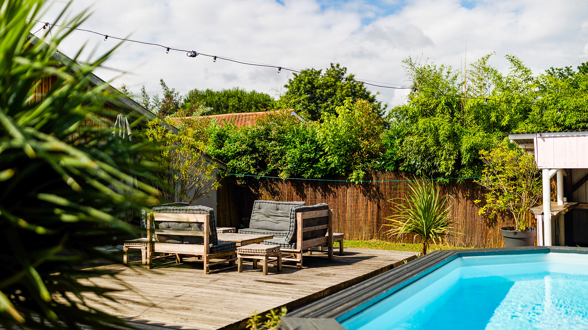 En effet, au cœur d’un jardin arboré de 1300 m² divisé en 2 avec la partie côté jardin ou côté terrasse. Certes, il est bon de profiter soit du côté jardin pour être au calme et lire un bon bouquin. Mais, le côté terrasse avec la piscine invite au bronzage les après midis ensoleillés. Puis, le soir, au calme, une partie de pétanque autour du verre de l’amitié est un bonheur pour toute la famille. La cabane dans le jardin est très pratique pour ranger vos surfs et vos affaires de plage. Un parking 5 voitures est à votre disposition.