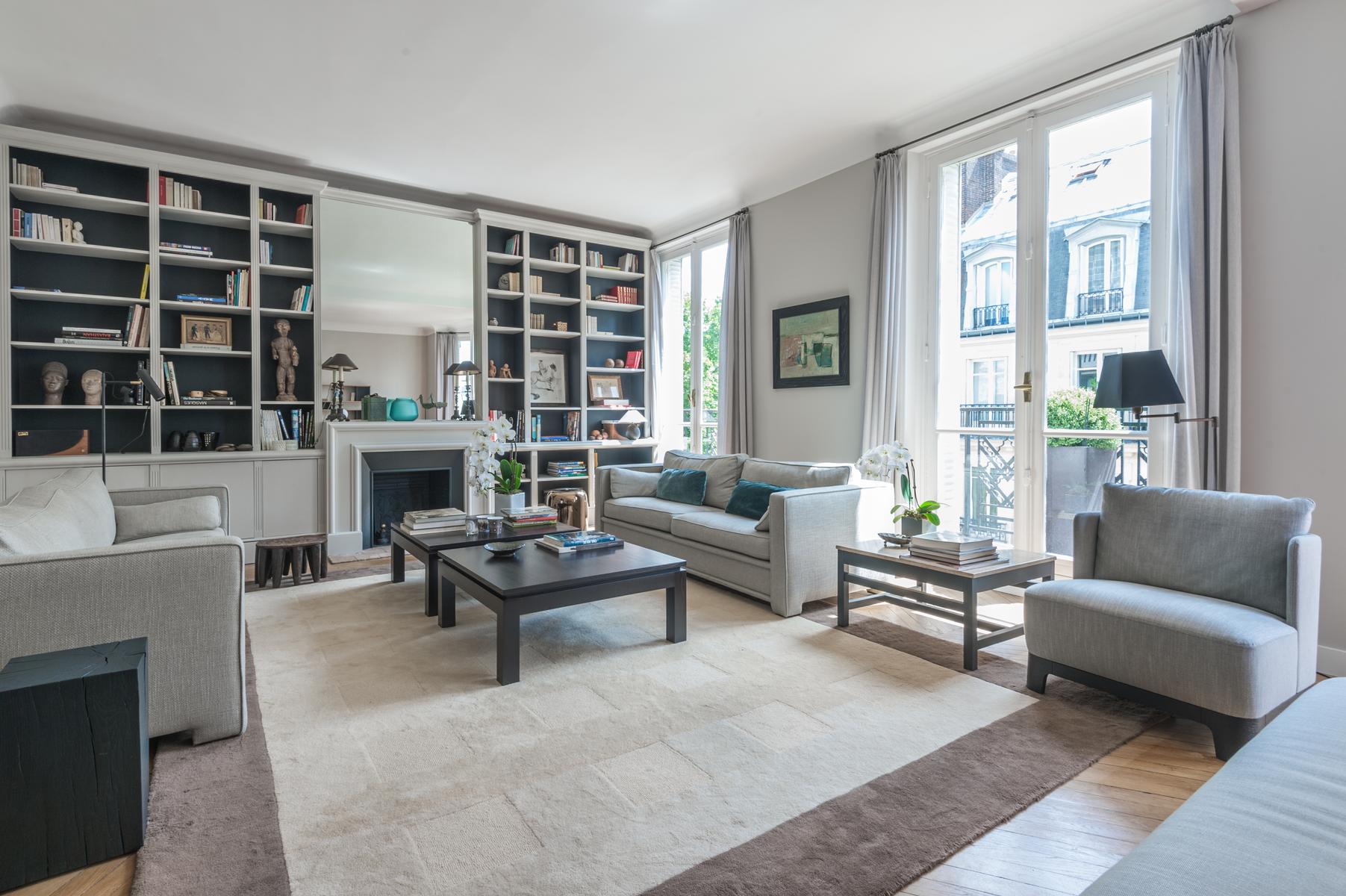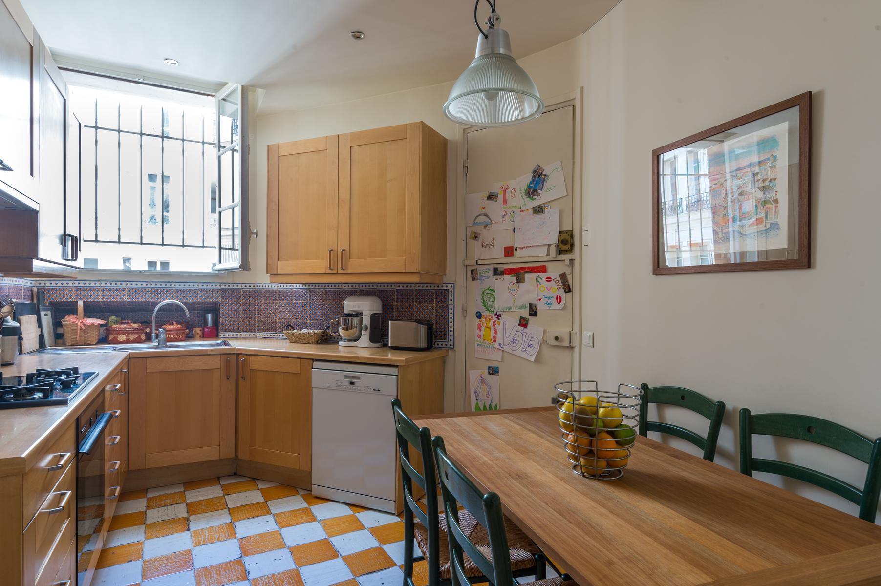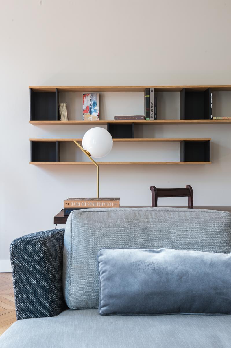 Proche de l’autre côté de la Seine et des commerces de La Défense, cette maison neuilly est paisible et calme. En entrant au quatrième étage, vous trouverez le salon sur la gauche – avec des portes-fenêtres, de grandes bibliothèques et un groupe de canapés gris. Un bureau contemporain est posé sur le parquet, et à droite, la cuisine a un aspect champêtre, avec des carreaux au sol et une table à manger en bois.