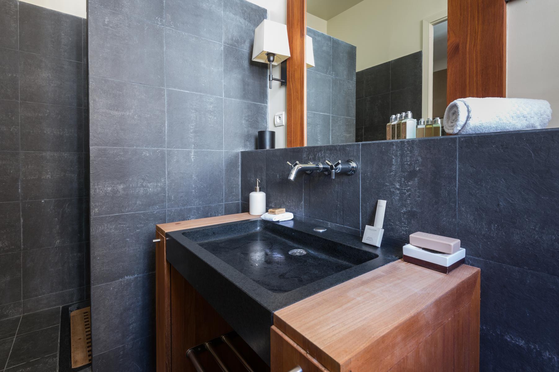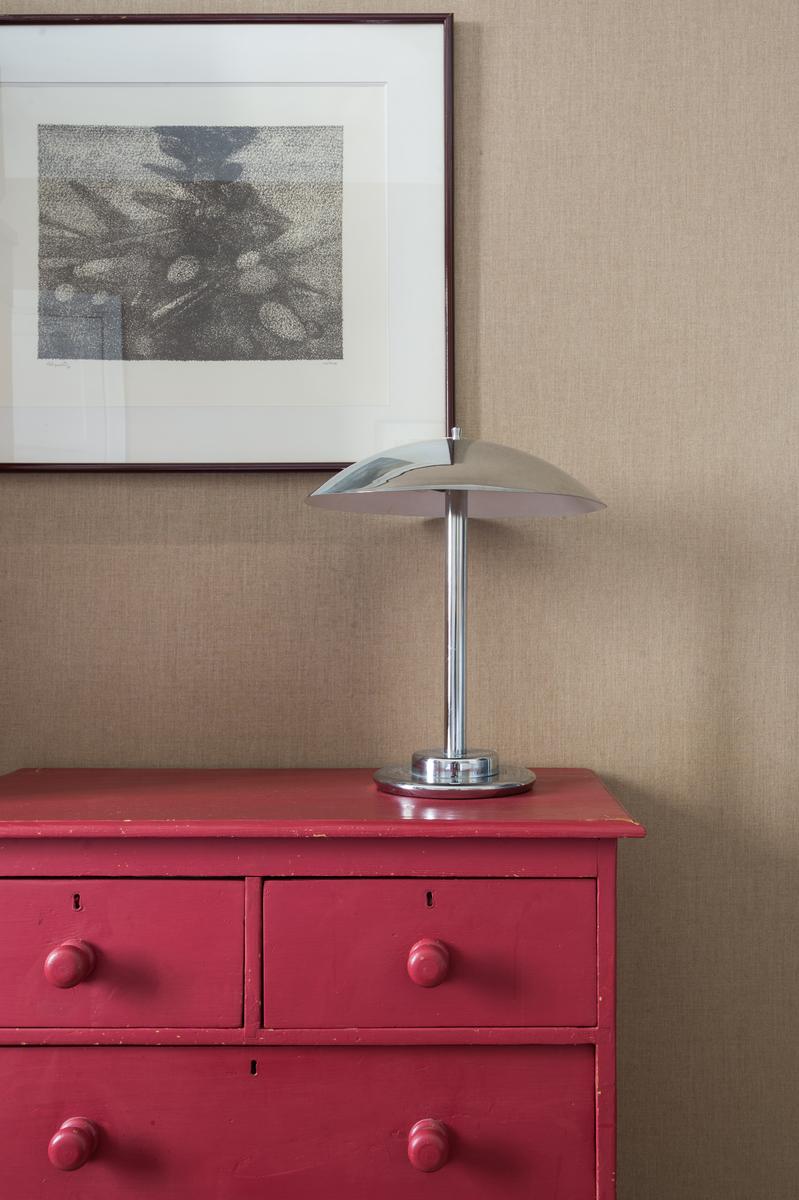 Il y a de la place pour six autres dans la salle à manger peinte à la moutarde, et à gauche vous trouverez la chambre des maîtres. Une chaise pourpre et une commode en bois font face au lit queen-size, tandis que la salle de bains a une palette naturelle. Au bout du couloir, la deuxième chambre a des murs taupe et un bureau à côté de la fenêtre. L’art encadré est suspendu entre les deux lits simples, et il y a des tuiles d’ardoise dans la salle de bains contemporaine.