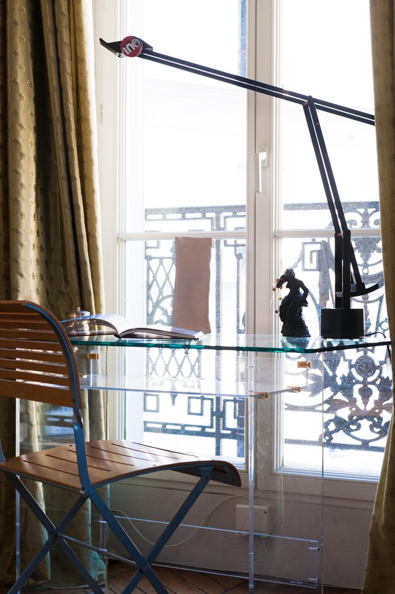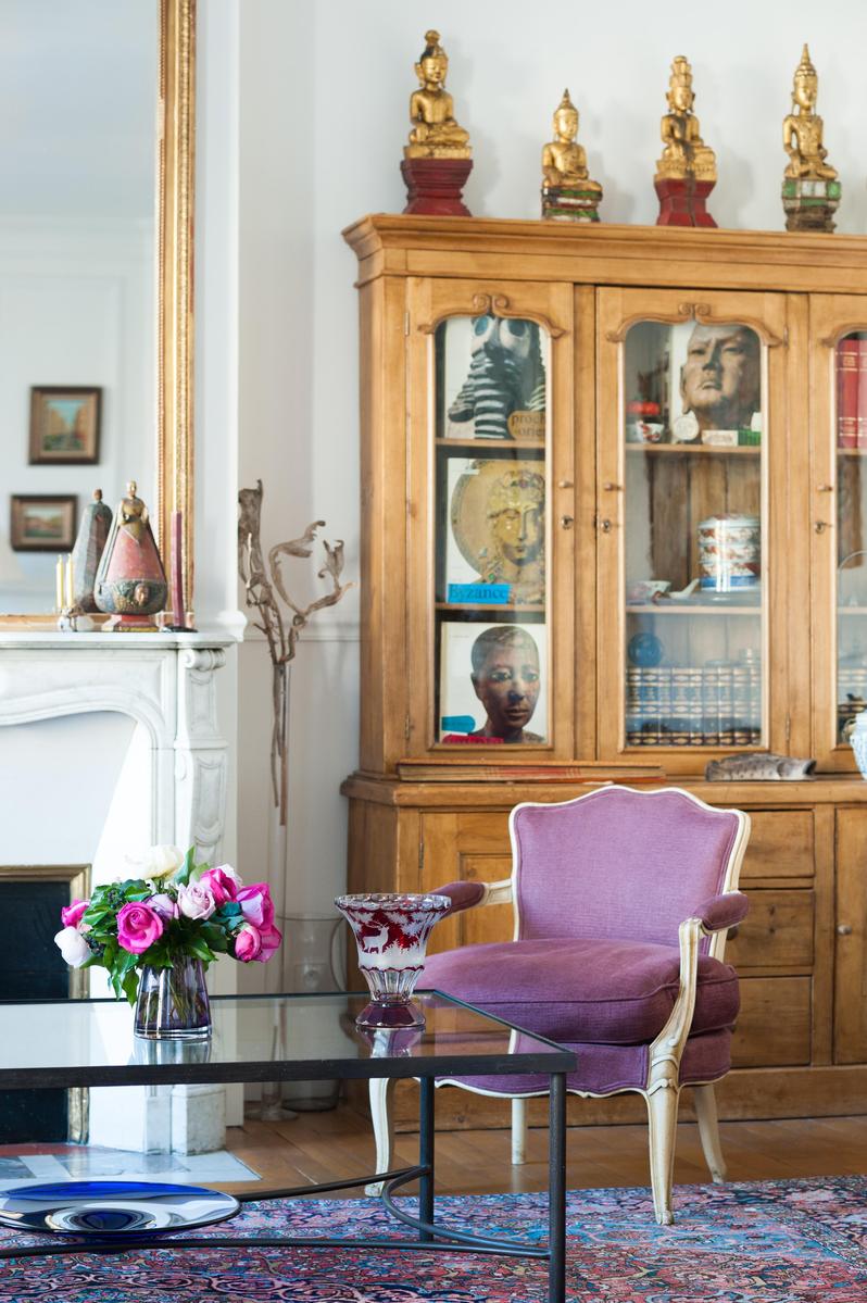 Avec ses proportions spacieuses et ses plâtres complexes, c’est l’appartement parisien dans toute sa splendeur. Mais l’Orient est là aussi, dans les tapis tissés à la main, les livres qui remplissent les étuis, les meubles en terre cuite et les boîtes à bonbons incrustés de fougères et de fleurs plumeuses. Le salon a été accroché avec des peintures à l’huile expressives, avec des sièges à la table à manger ou sur un canapé en cuir chocolaté, et il y a plus de perchoirs dans la cuisine. Les deux chambres sont doubles, avec des murs en albâtre blanc, et le maître est particulièrement agréable avec des bois miellés et deux fenêtres donnant sur le fer forgé.