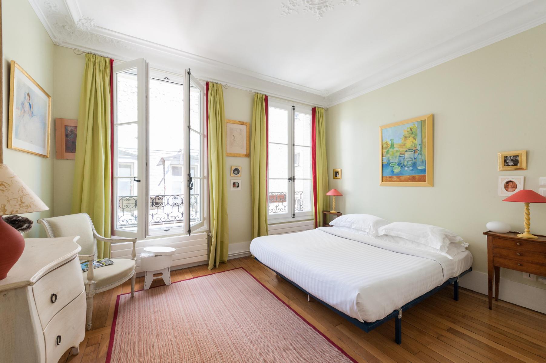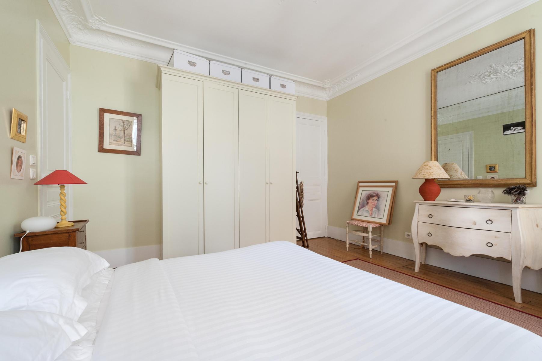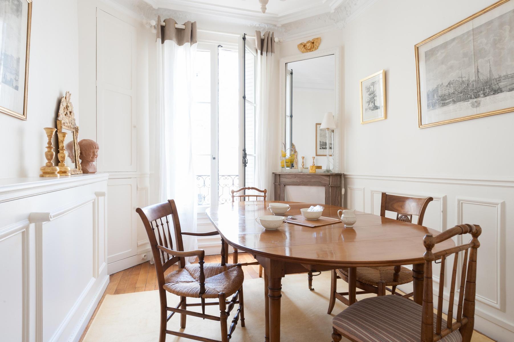 Le sens du style raffiné de l’Avenue de Tourville signifie qu’il y a des éléments d’époque à chaque tournant – la table basse du salon repose sur des pieds Queen Anne, s’incurvant en ligne avec le canapé imprimé chintz. Le manteau de cheminée blanc moulé met en scène le thé de la salle de dessin, surplombé par le paysage pastoral peint à l’huile traditionnelle, et même les verres à vin – dont les tiges sont des piliers de la déesse grecque – sont opulents. Si vous souhaitez faire un tour en ville, pouvons-nous vous recommander une promenade le long des rives de la Seine voisine ? Revenez à la maison par la rue Cler pour goûter à des boutiques avec beaucoup de caractère et d’héritage, avant de retourner s’allonger dans l’un des luxueux canapés.