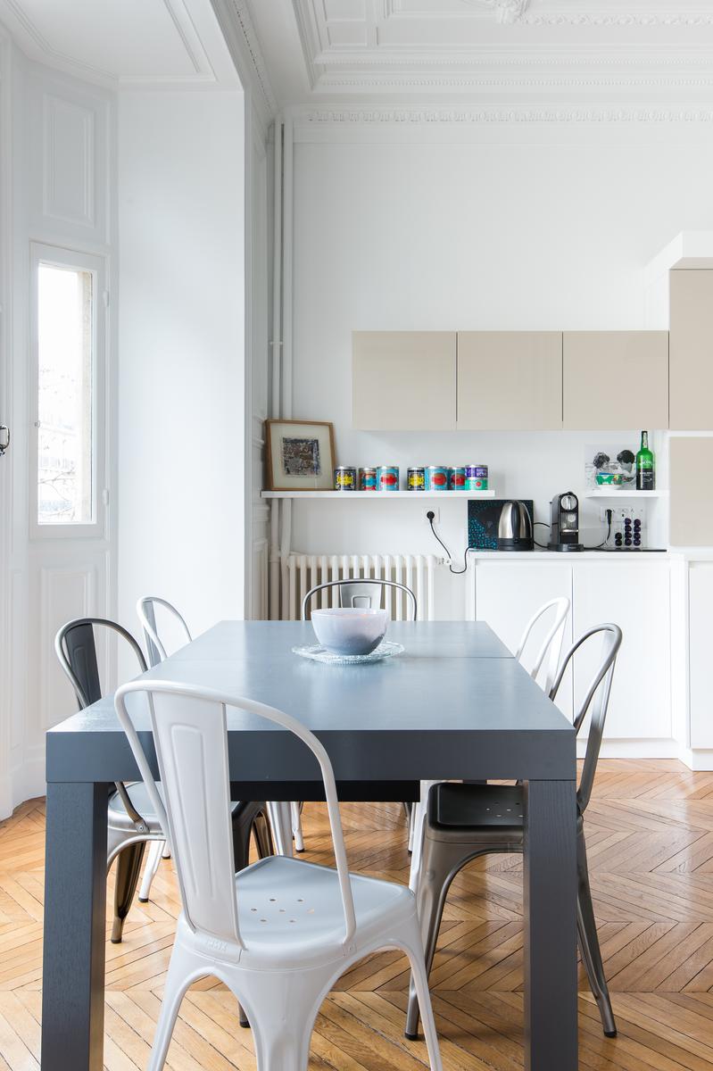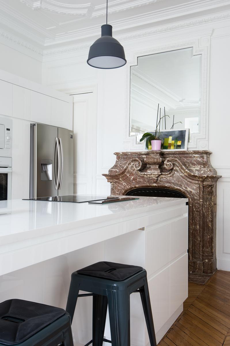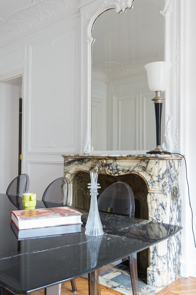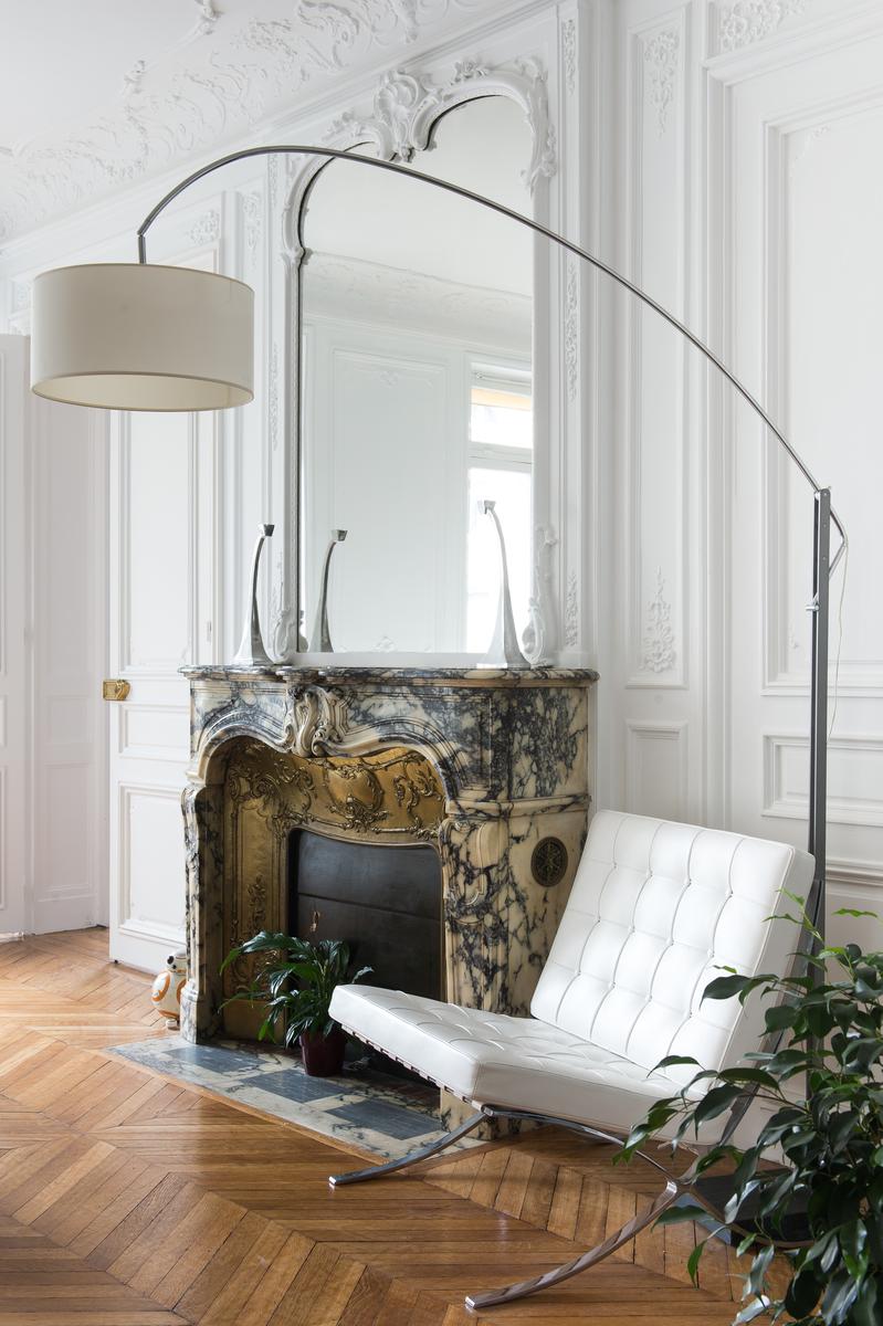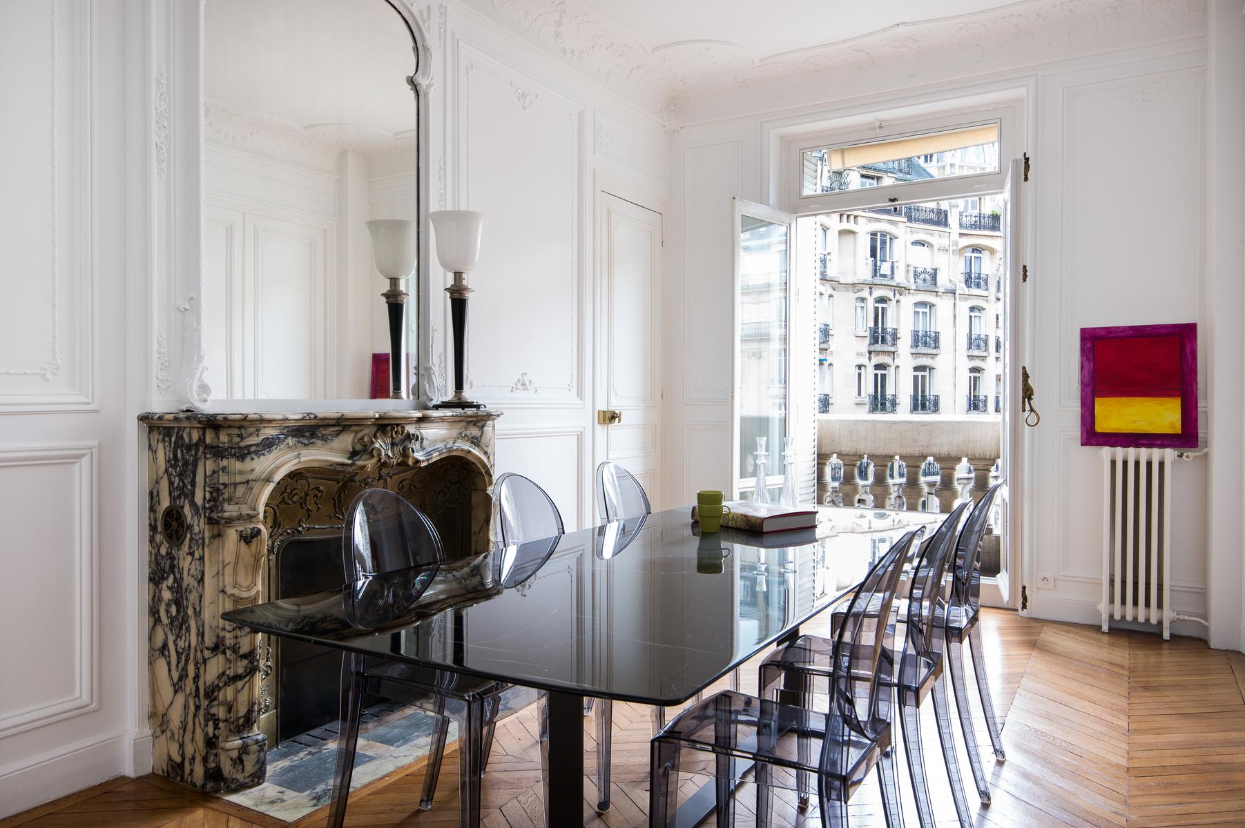 De son ameublement blanc épuré à ses cheminées ornementales aux miroirs, Avenue de Wagram III éblouit. Tout droit devant l’entrée, vous trouverez le salon, où un canapé-lit en cuir blanc et une chaise Barcelona sont assis sur le parquet. La porte de droite mène à la cuisine contemporaine très brillante, tandis que celle de gauche mène à la salle à manger, qui possède une table noire (avec chaises fantômes) et une cheminée décorative en marbre.