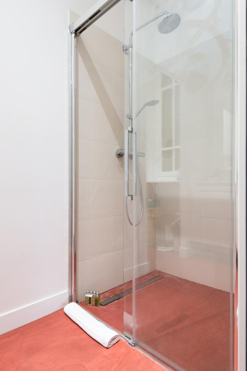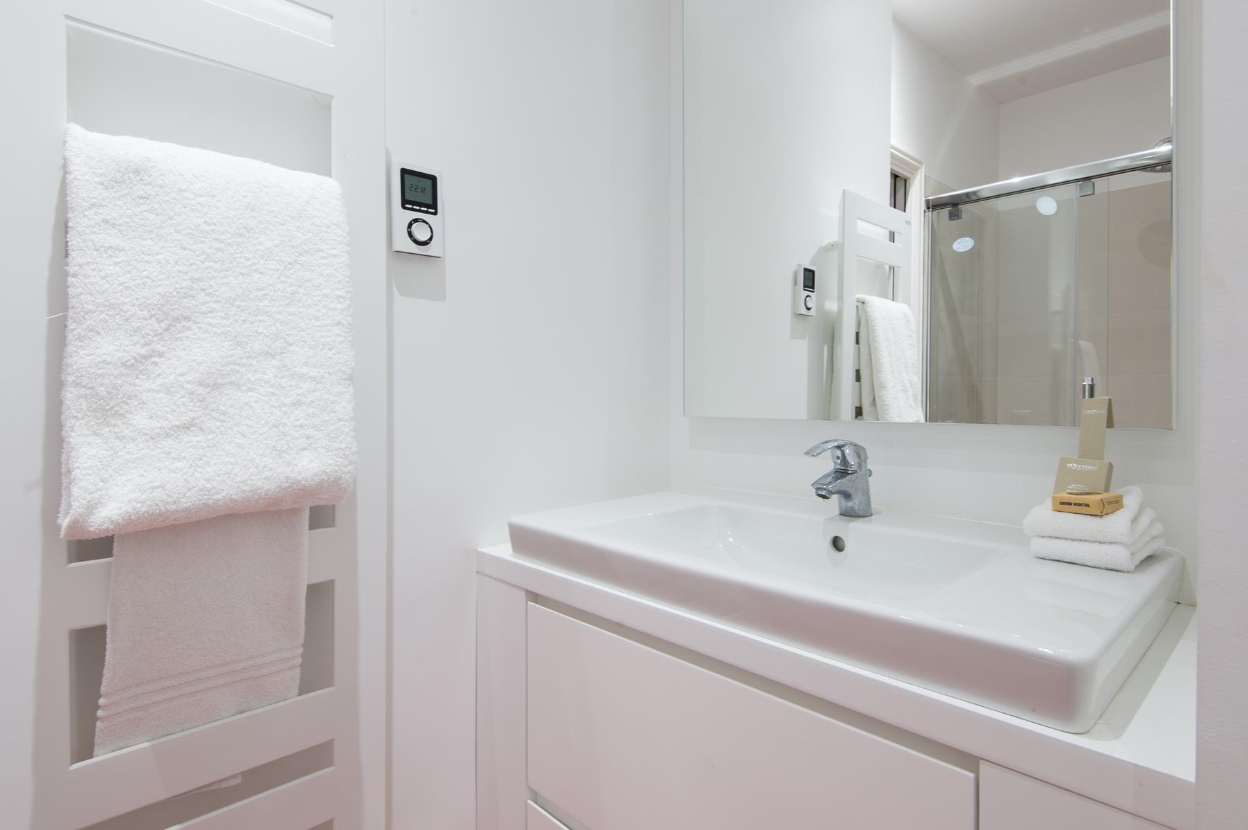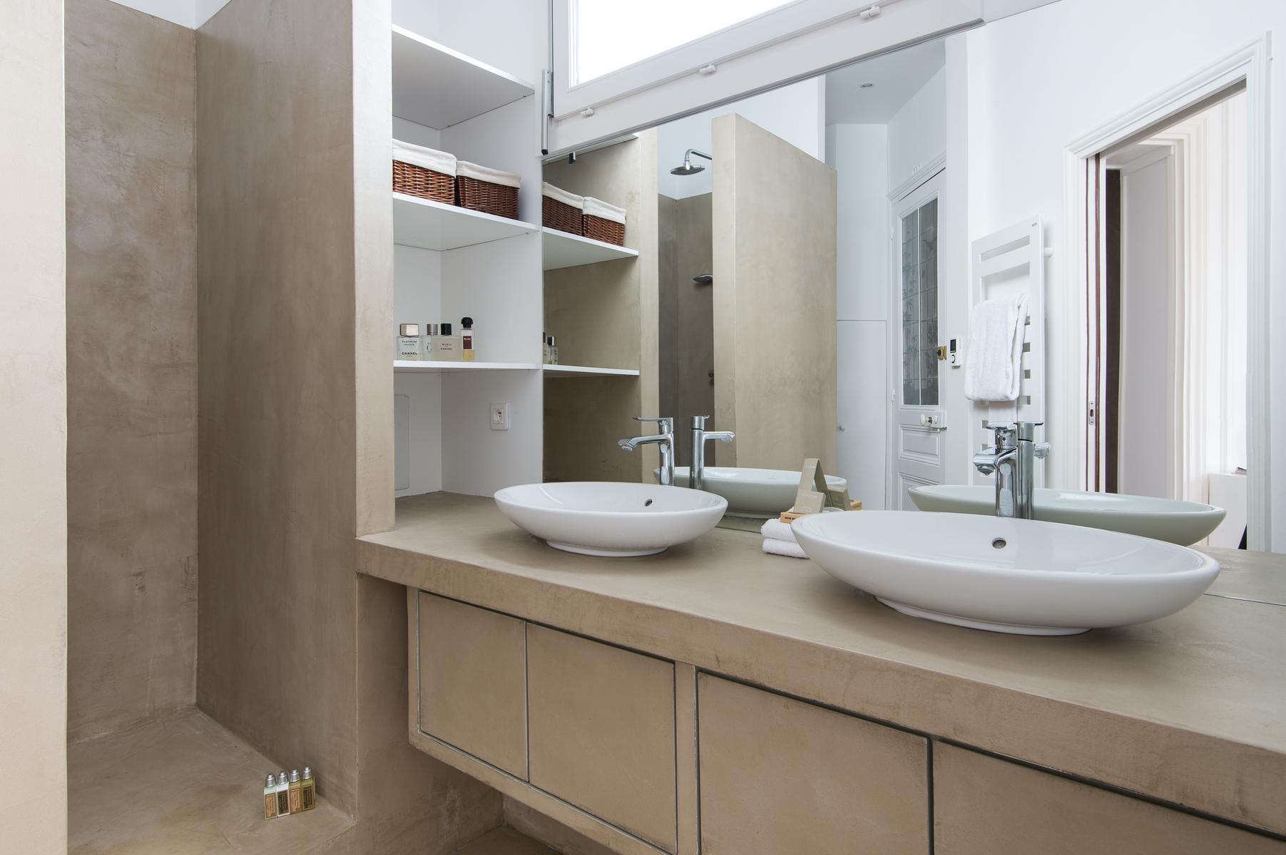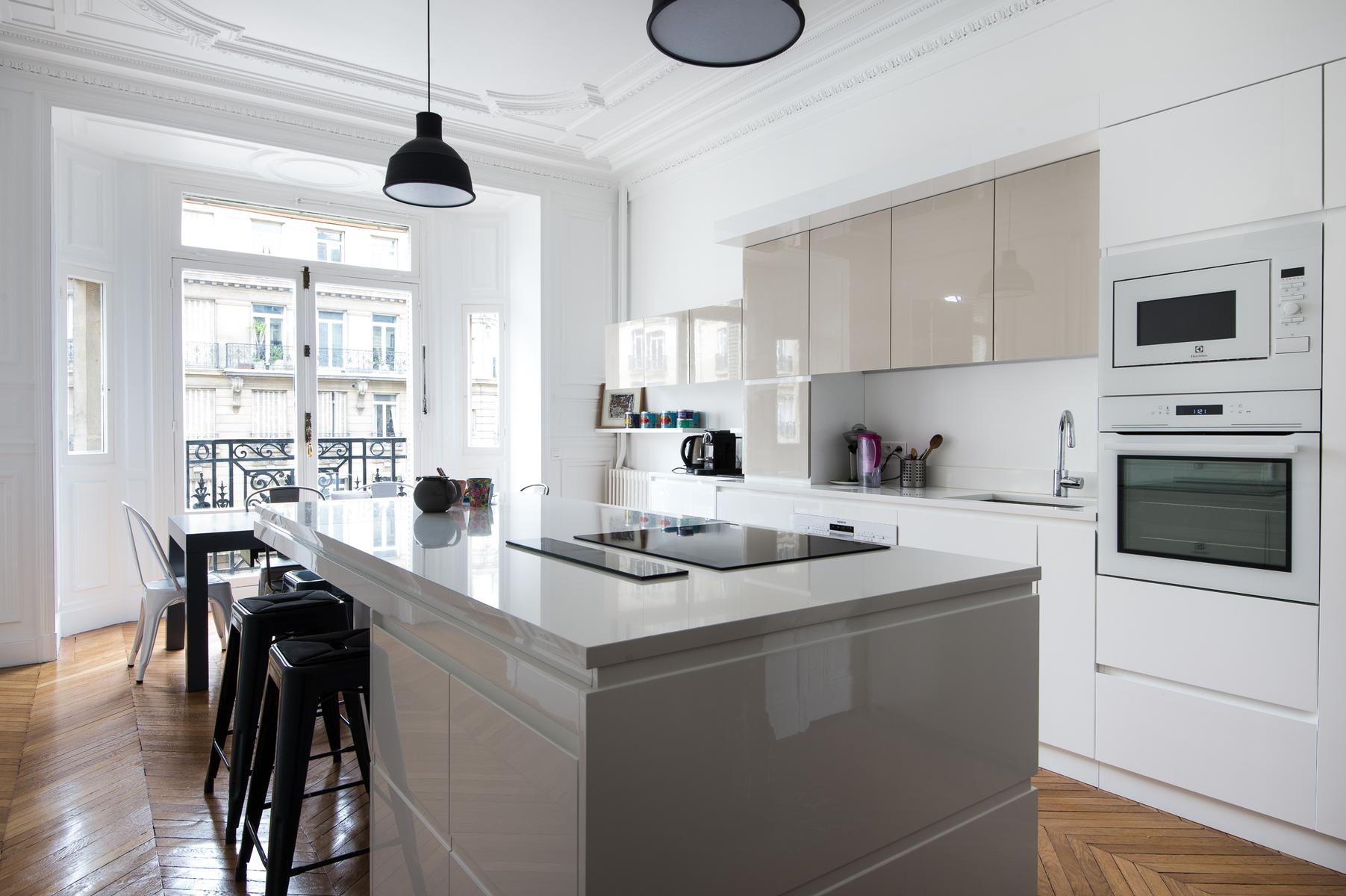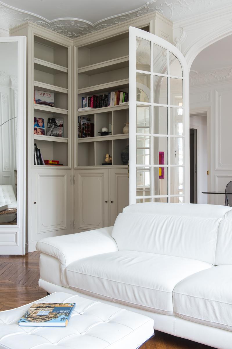 De son ameublement blanc épuré à ses cheminées ornementales aux miroirs, Avenue de Wagram III éblouit. Tout droit devant l’entrée, vous trouverez le salon, où un canapé-lit en cuir blanc et une chaise Barcelona sont assis sur le parquet. La porte de droite mène à la cuisine contemporaine très brillante, tandis que celle de gauche mène à la salle à manger, qui possède une table noire (avec chaises fantômes) et une cheminée décorative en marbre.