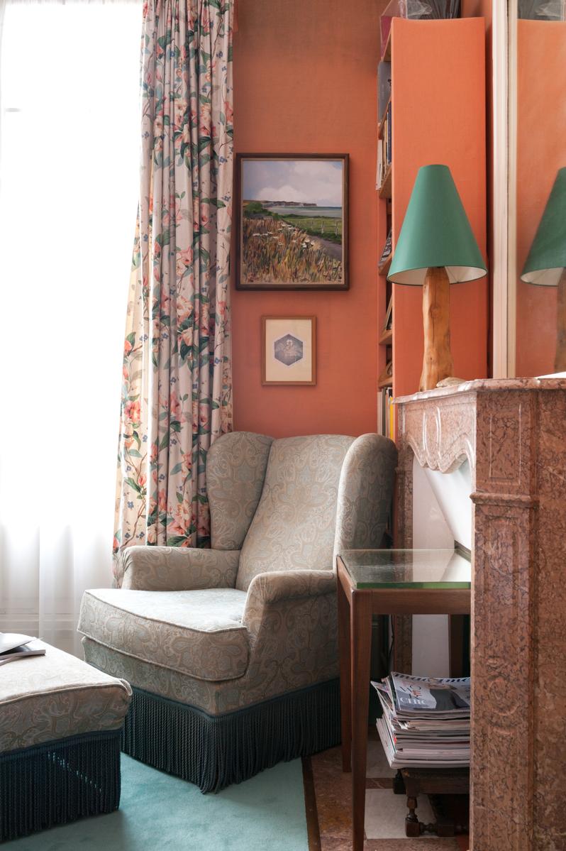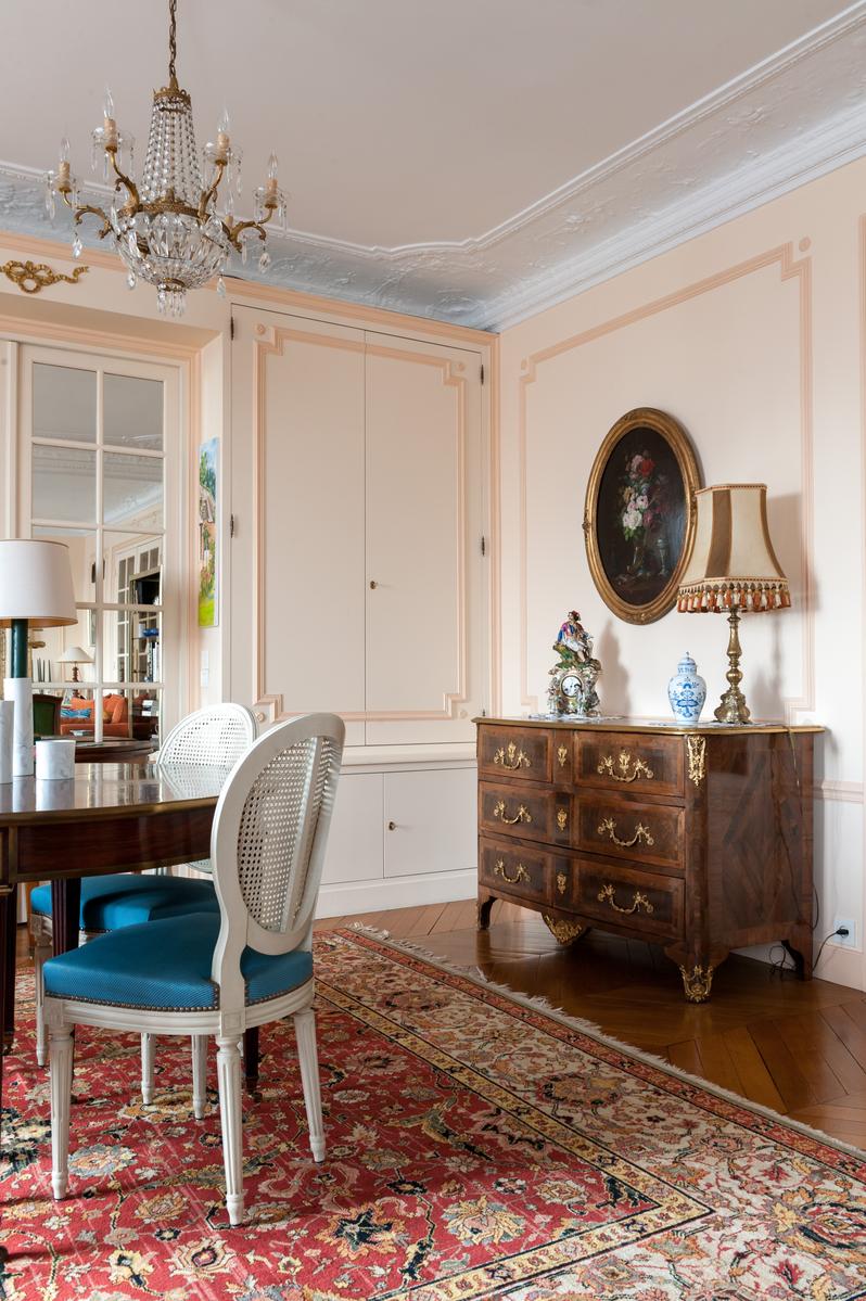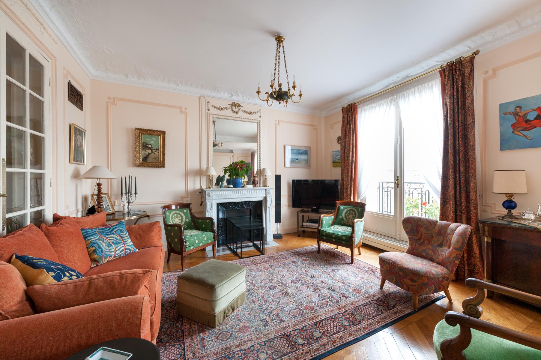 Au sixième étage d’un imposant édifice, l’avenue du Général Leclerc est ornement sculptée. Le salon est orné de planchers à chevrons et de murs moulurés, et une collection de chaises anciennes et un canapé souple sont disposés autour du foyer. Juste au-delà, la table à manger laquée se trouve sous un grand chandelier, et les fenêtres françaises offrent une vue sur la rue verdoyante. Alésia est un endroit tranquille, avec des marchés quotidiens à la rue Daguerre et de nombreux parcs à proximité. La seule entrée publique aux Catacombes se trouve aussi à quelques pas de la porte.