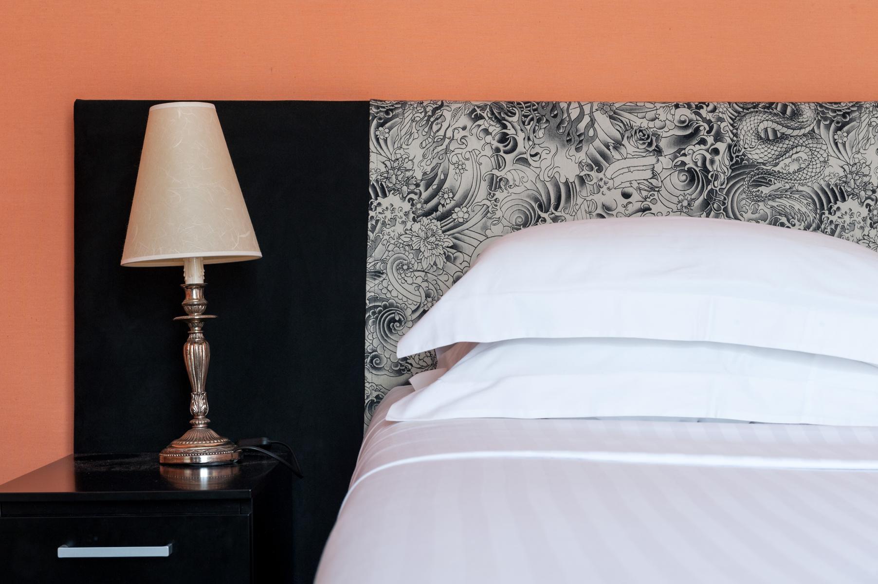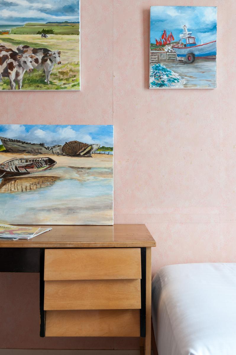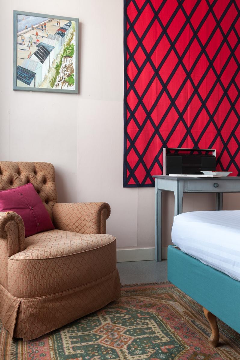 Juste à côté du salon, vous trouverez quatre chambres audacieuses et lumineuses. La chambre des maîtres a des murs en terre cuite et un tapis turquoise, et il y a un lustre extravagant et un miroir décoratif au sommet de la cheminée. La jolie chambre à deux lits jumeaux est brossée de tons de pêche et de rose pastel, et les salles de bains sont tout aussi audacieuses. L’une est encadrée de murs orange-brûlé, une autre est bordée de tuiles rouge vif, et la salle de bains est équipée d’une baignoire peinte en couleur pâle pour des soirées de rêve.