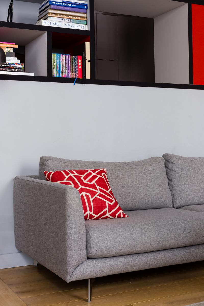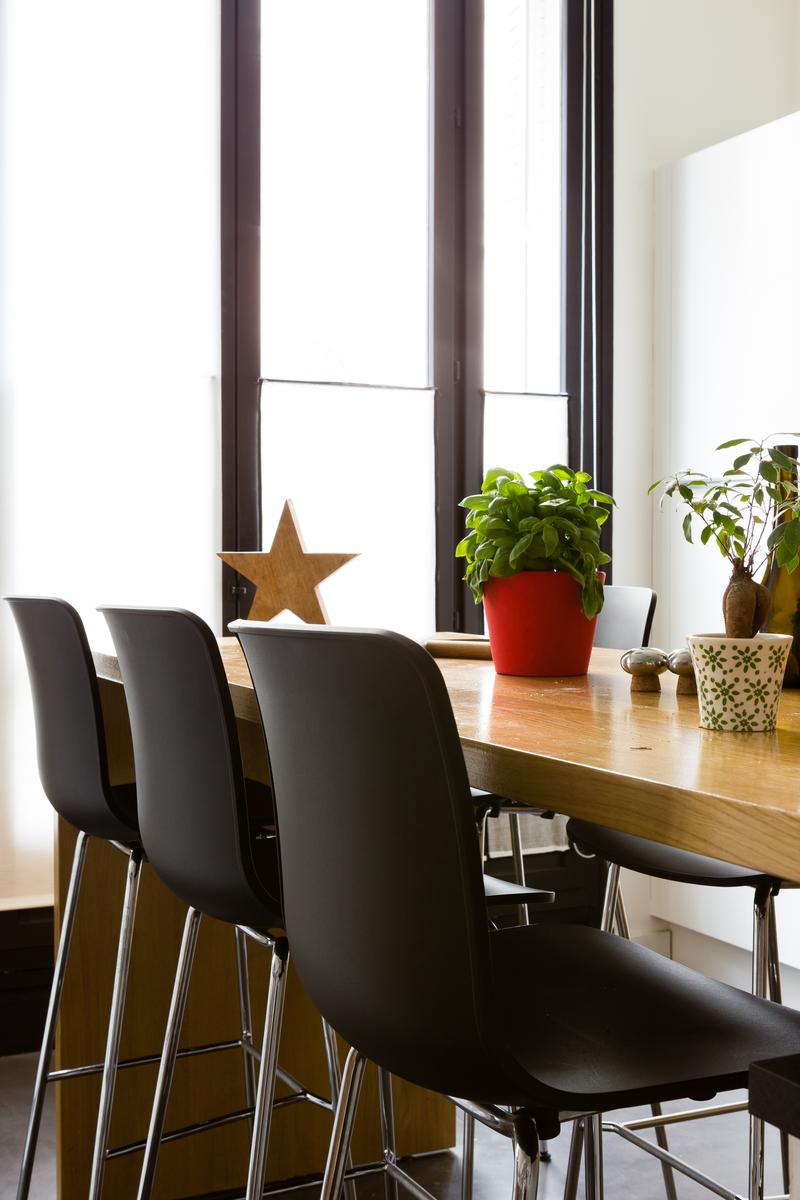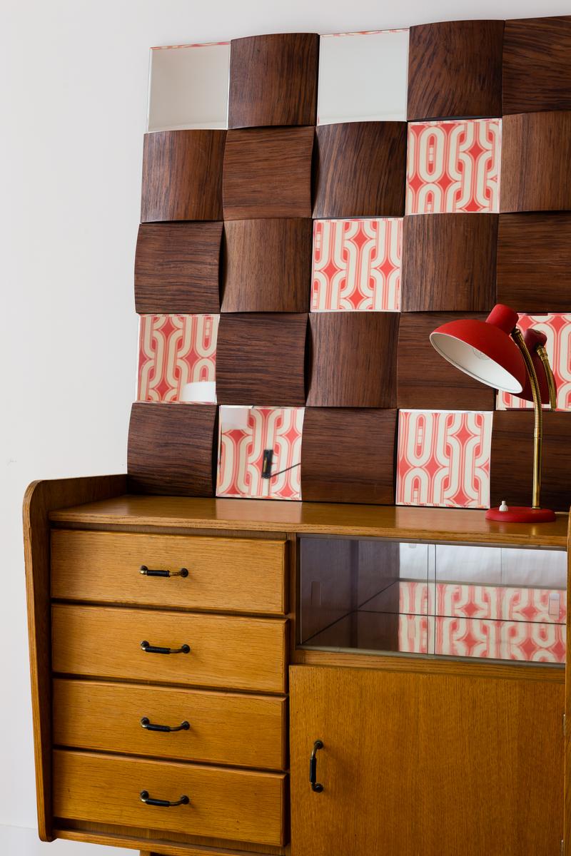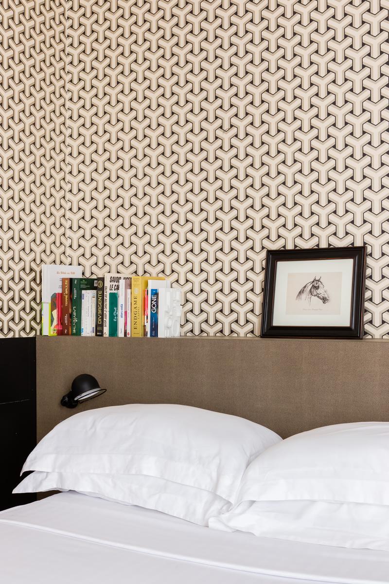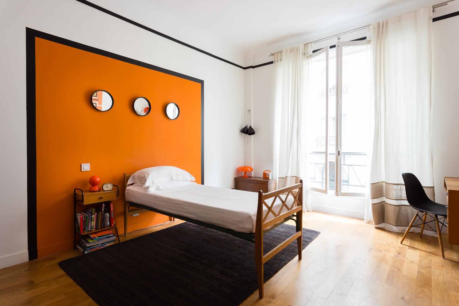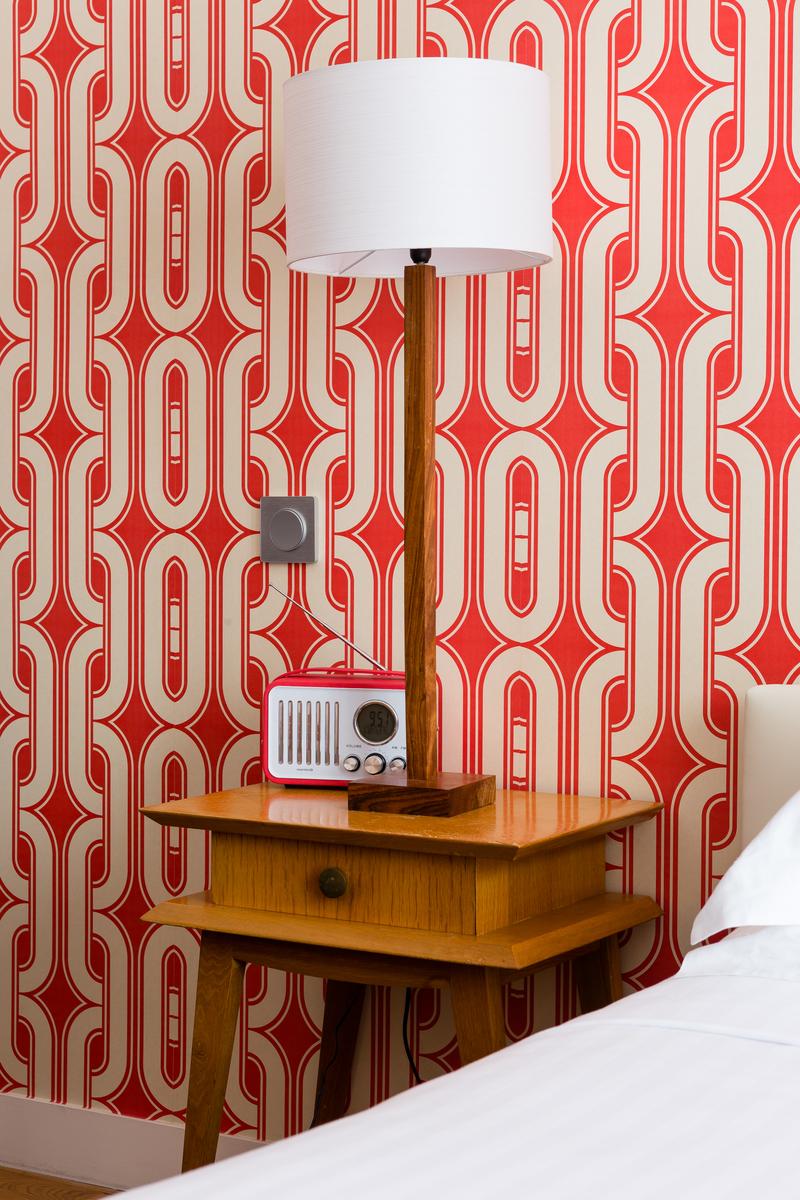 This well-located home is more than vibrant inside. You’ll come first to the open-plan living area, just on the left. This room has soft-grey walls and sofas and an understated family table, but there are eye-catching dashes of scarlet (the bookshelves, the contemporary dining chairs) too. Beyond the glass wall is the smart, monochrome kitchen where you’ll find a wooden breakfast bar. Next, the stairs in the entrance hall lead up to the first floor, where there’s a toilet room and two bathrooms directly to the left. Opposite that are the first four bedrooms, made distinctive by their diverse colour palettes and geometric wallpaper.
