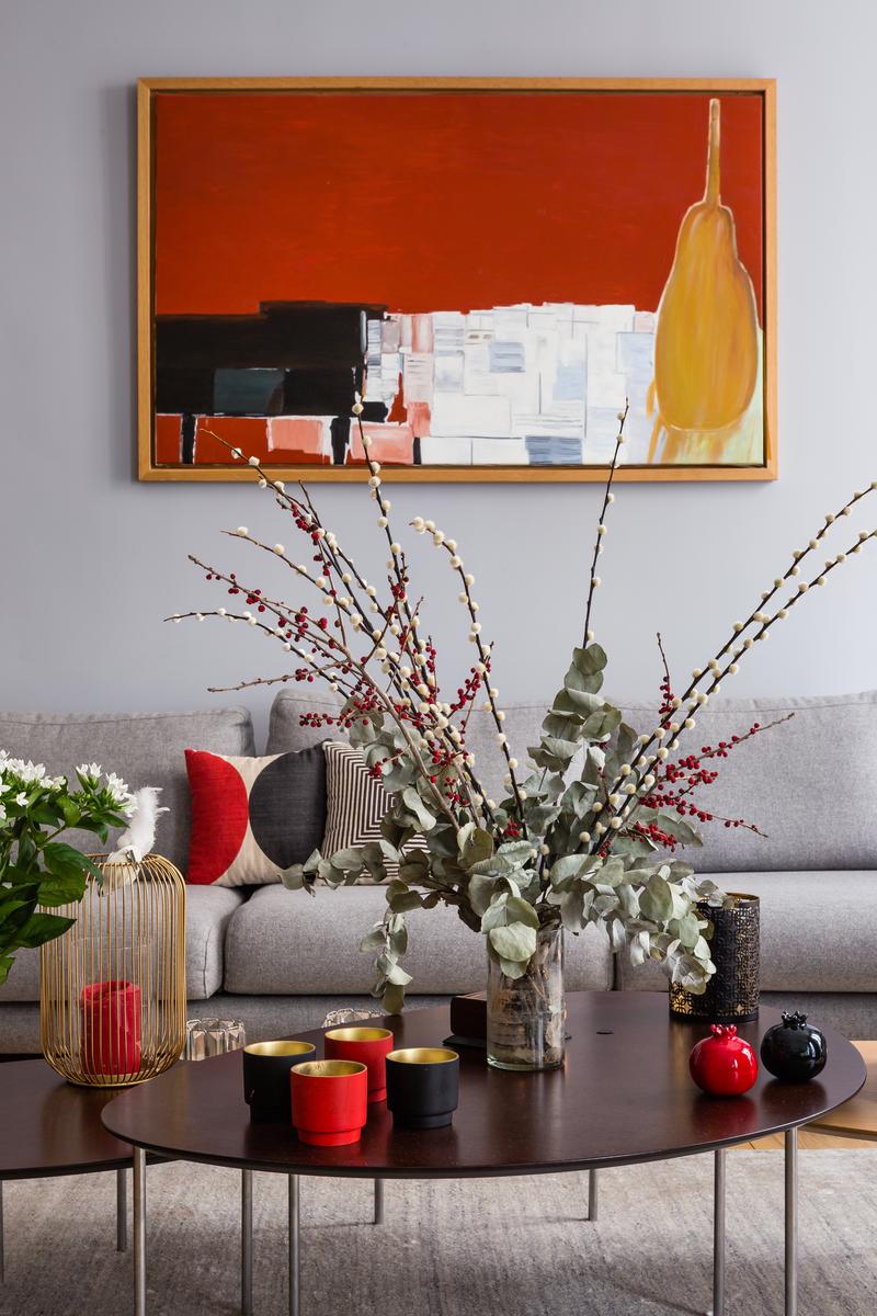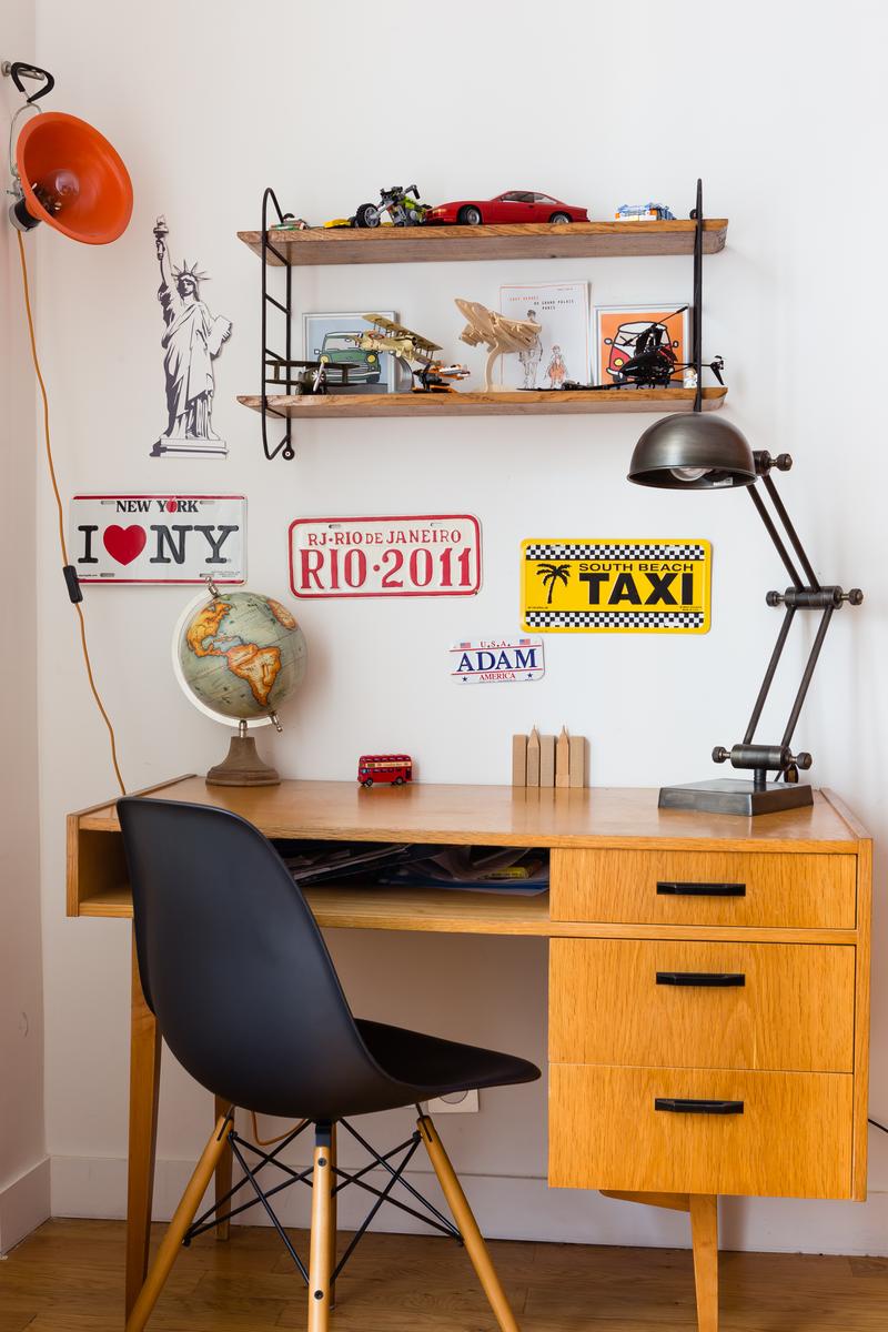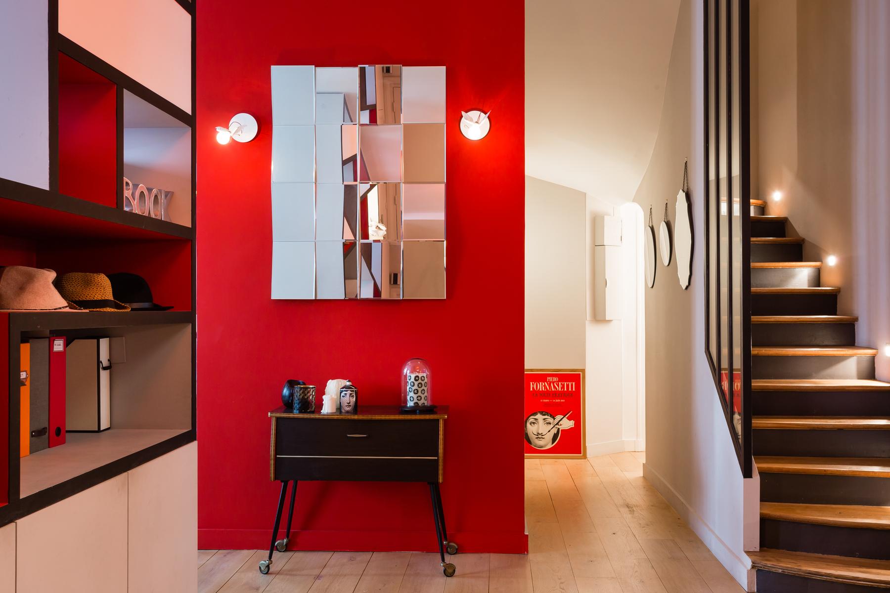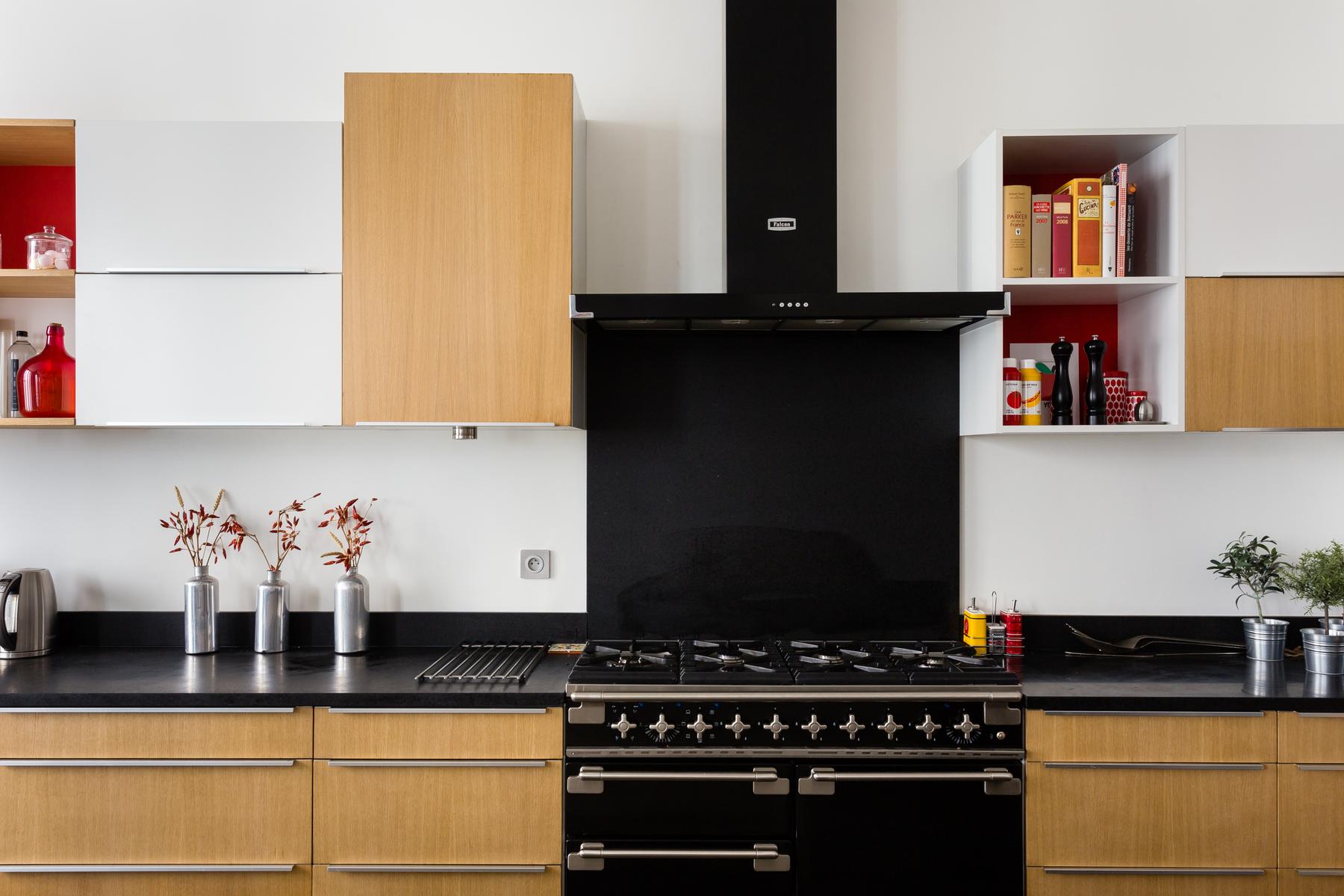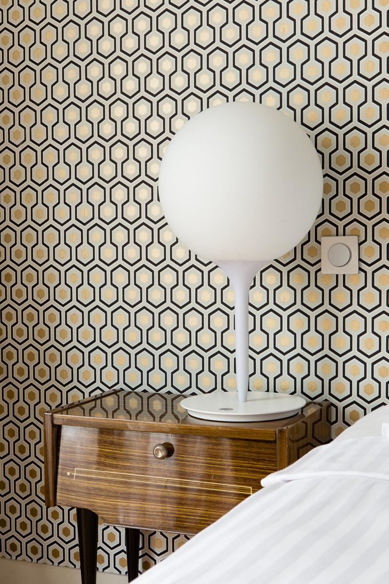 This well-located home is more than vibrant inside. You’ll come first to the open-plan living area, just on the left. This room has soft-grey walls and sofas and an understated family table, but there are eye-catching dashes of scarlet (the bookshelves, the contemporary dining chairs) too. Beyond the glass wall is the smart, monochrome kitchen where you’ll find a wooden breakfast bar. Next, the stairs in the entrance hall lead up to the first floor, where there’s a toilet room and two bathrooms directly to the left. Opposite that are the first four bedrooms, made distinctive by their diverse colour palettes and geometric wallpaper.