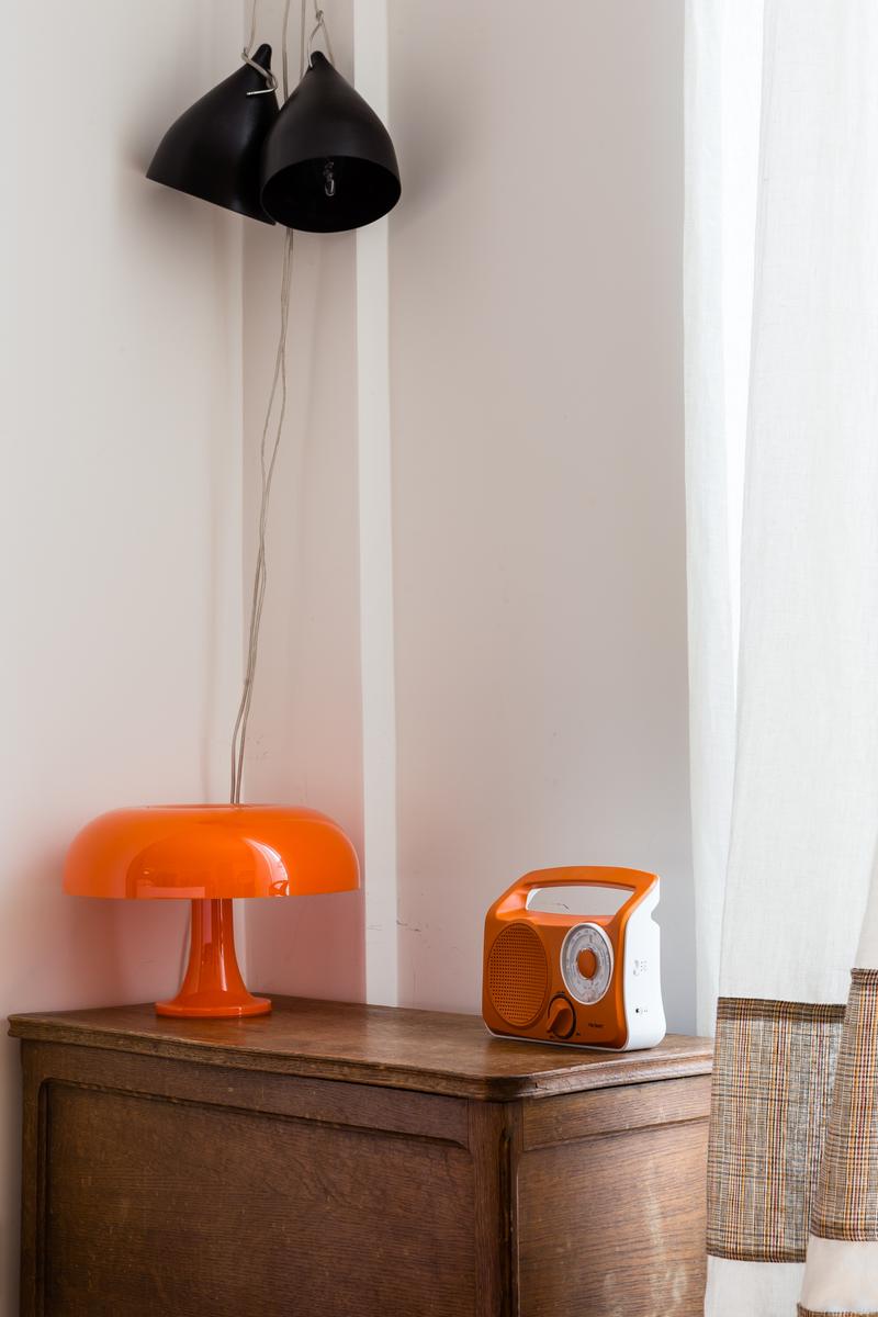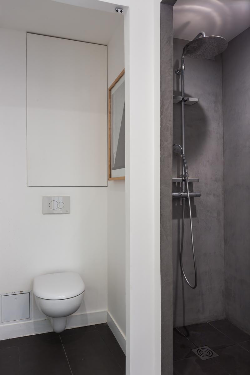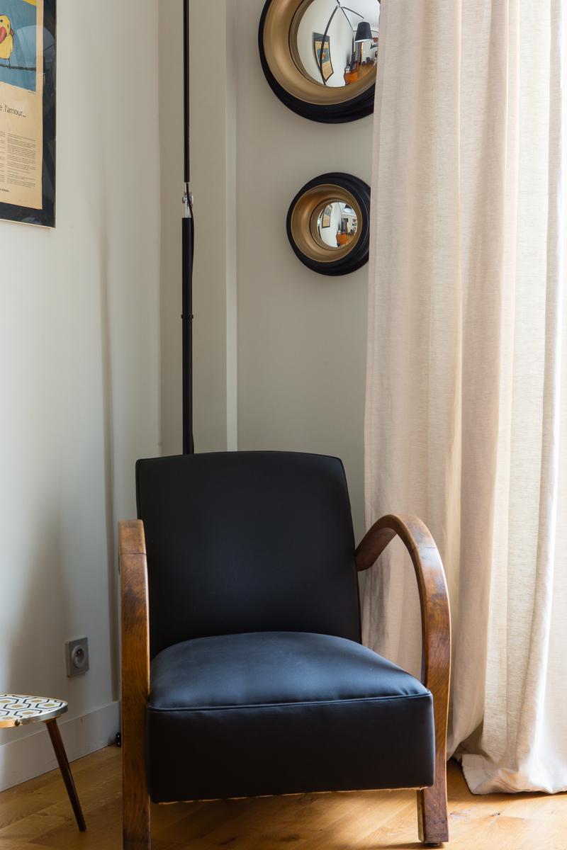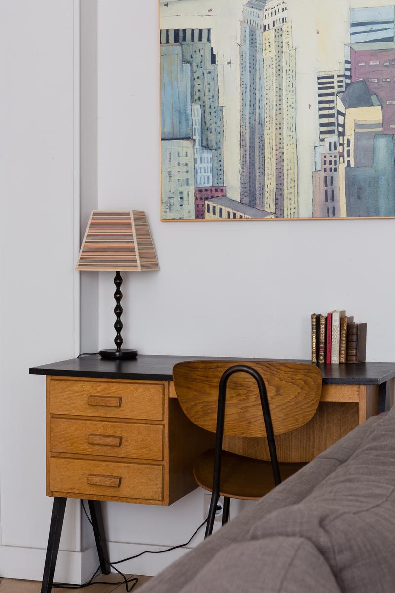 On the right there’s another bathroom and the dapper master bedroom, which has a super king size bed and a collection of moody vintage furnishings. And that’s not all. The other staircase in the entrance hall (before the toilet room) leads down to a second sitting room, a sophisticated nook full of artworks and books.