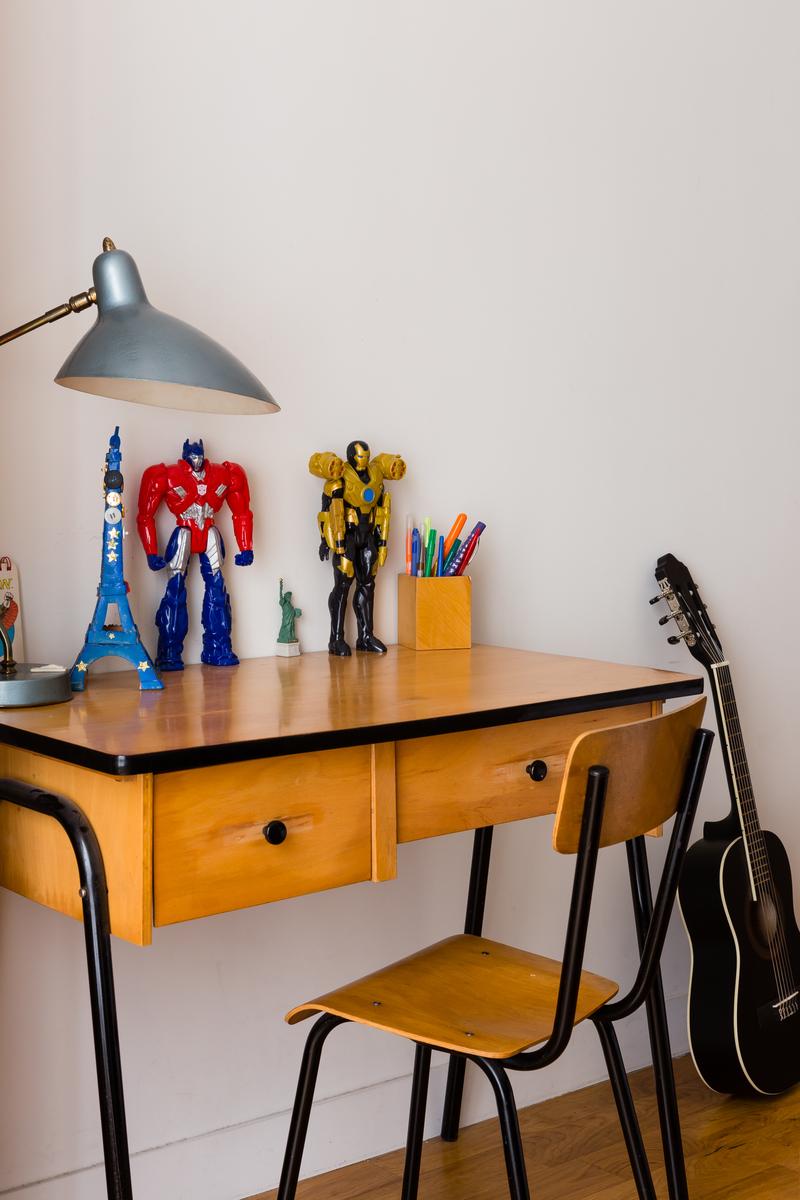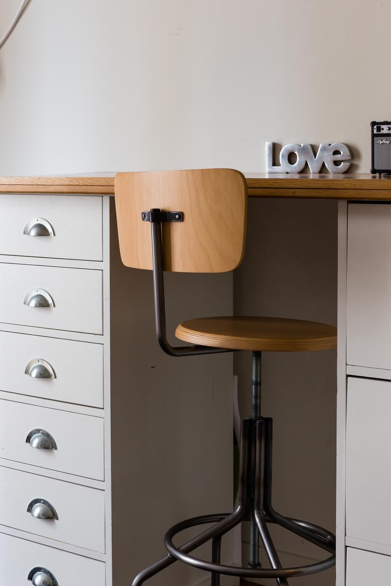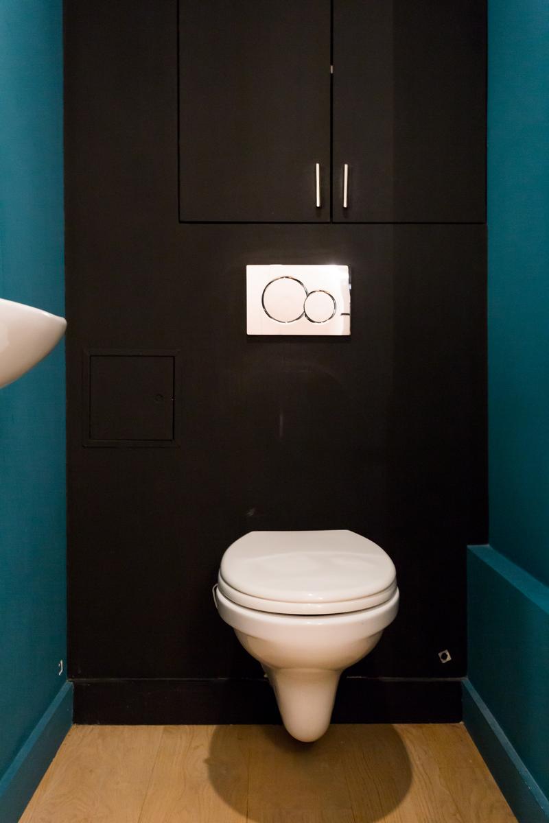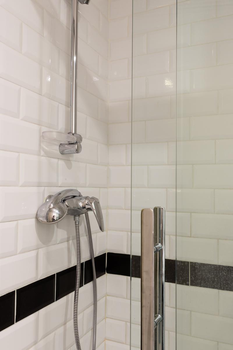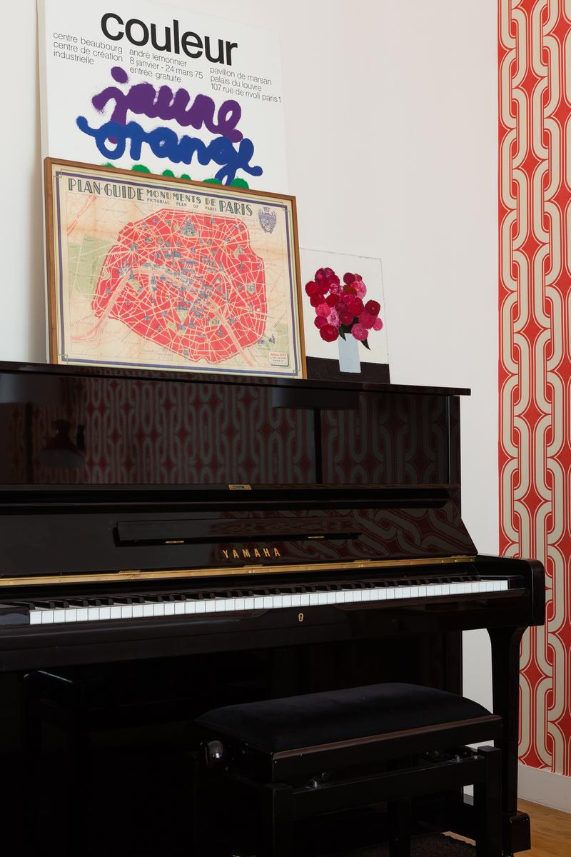 On the right there’s another bathroom and the dapper master bedroom, which has a super king size bed and a collection of moody vintage furnishings. And that’s not all. The other staircase in the entrance hall (before the toilet room) leads down to a second sitting room, a sophisticated nook full of artworks and books.