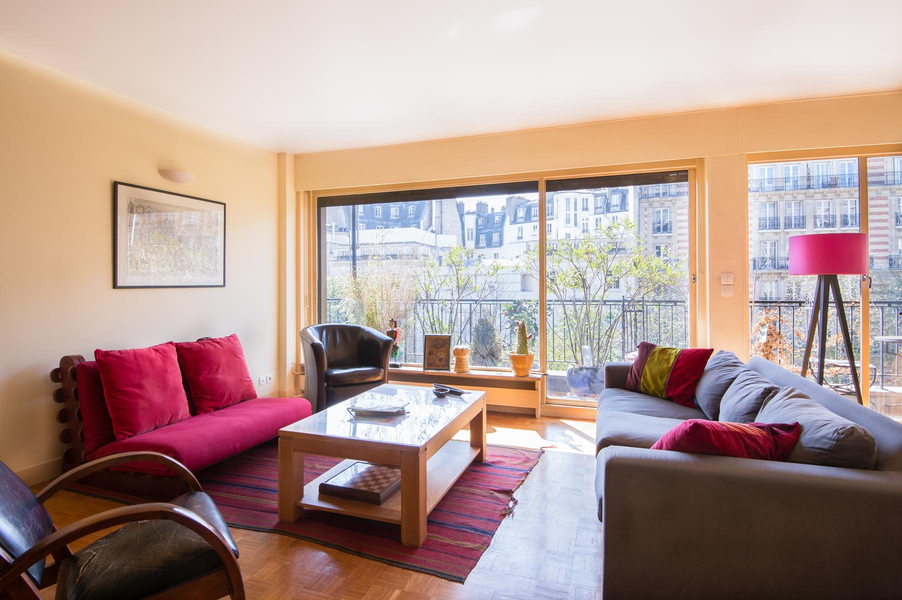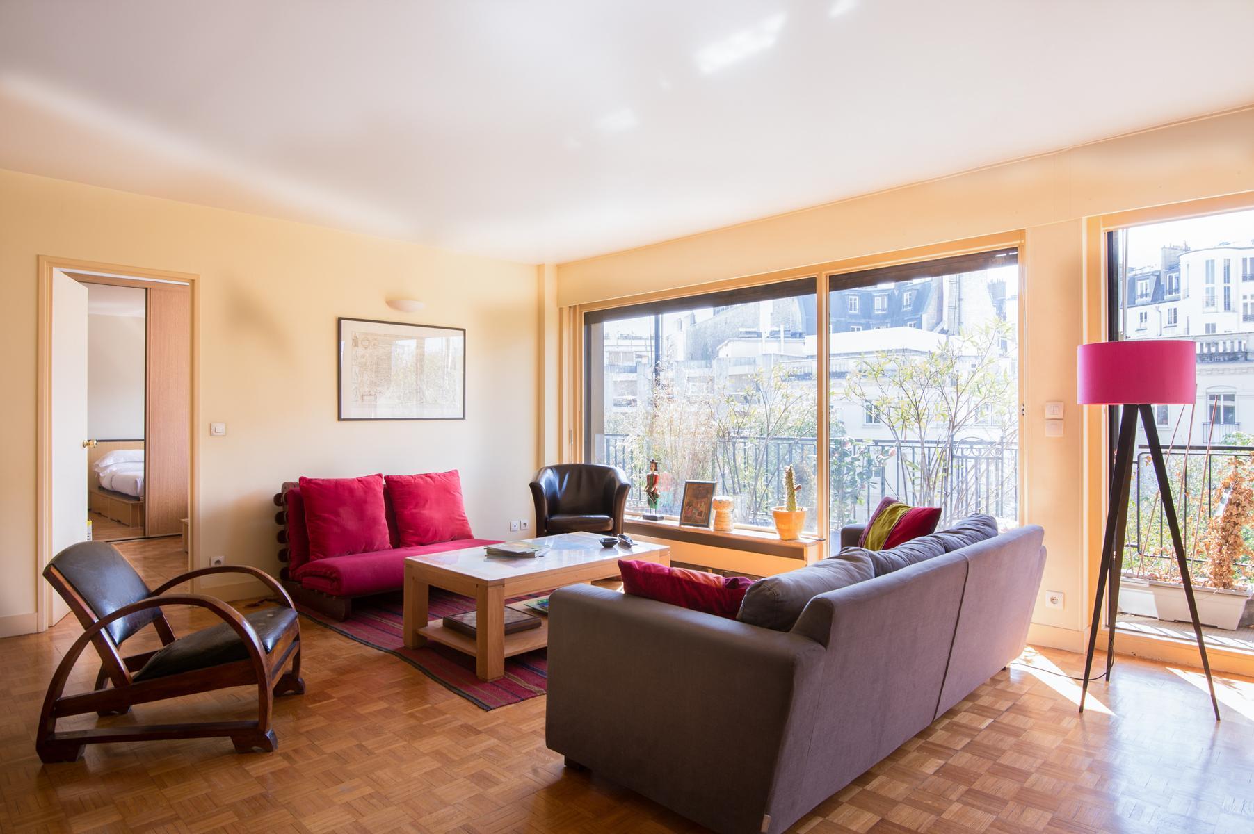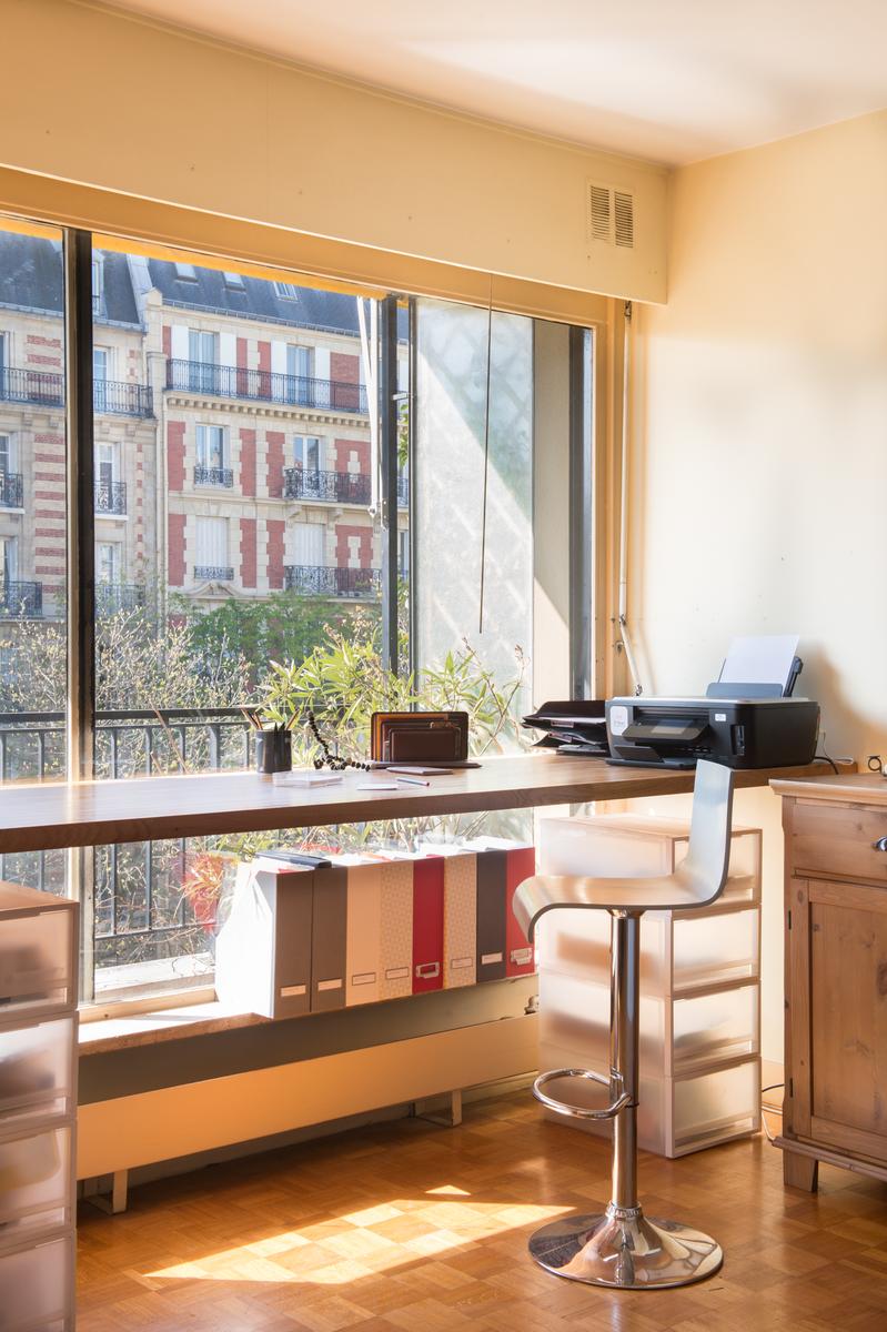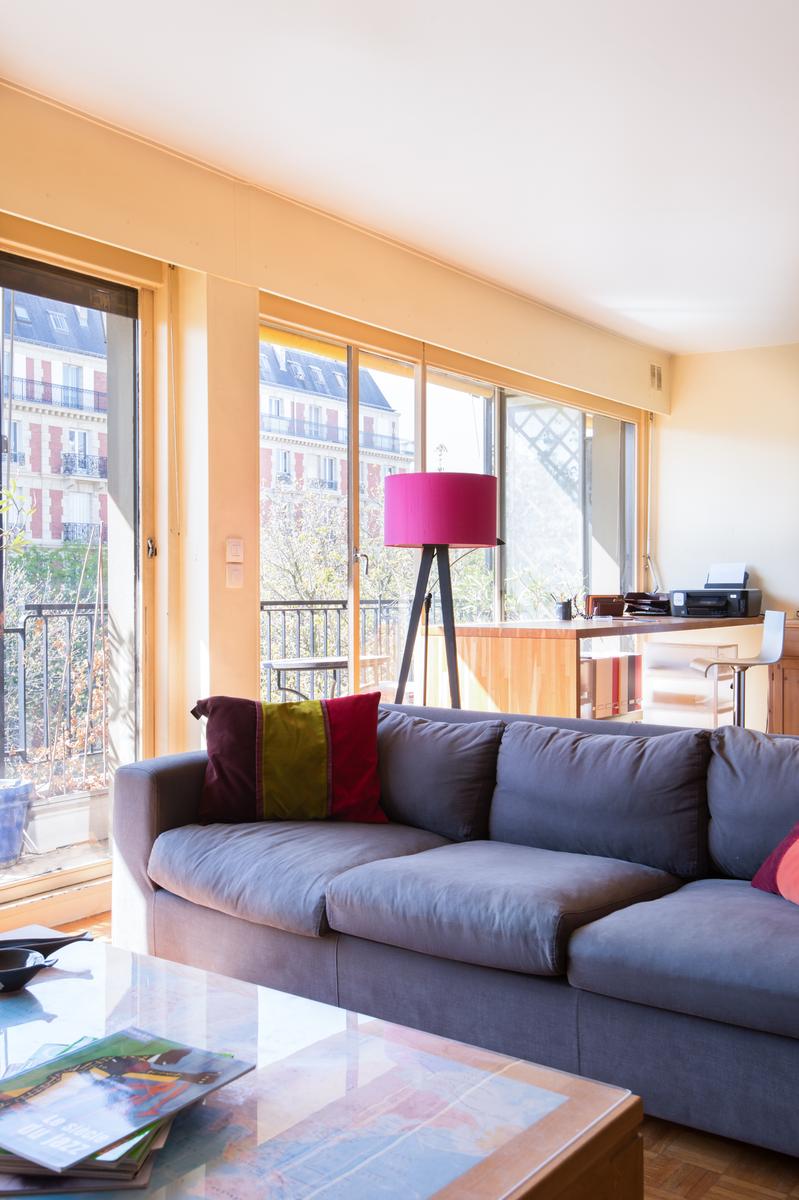 Vous entrez dans le Boulevard Arago, au quatrième étage d’un immeuble des années 70, dans un espace de vie à aire ouverte. La combinaison de fenêtres sur toute la hauteur, de murs en magnolia et de planchers de bois verni donne à cette maison un éclat chaleureux. Sur le balcon, qui s’étend sur toute la longueur de l’appartement, vous pouvez prendre le petit-déjeuner al fresco.