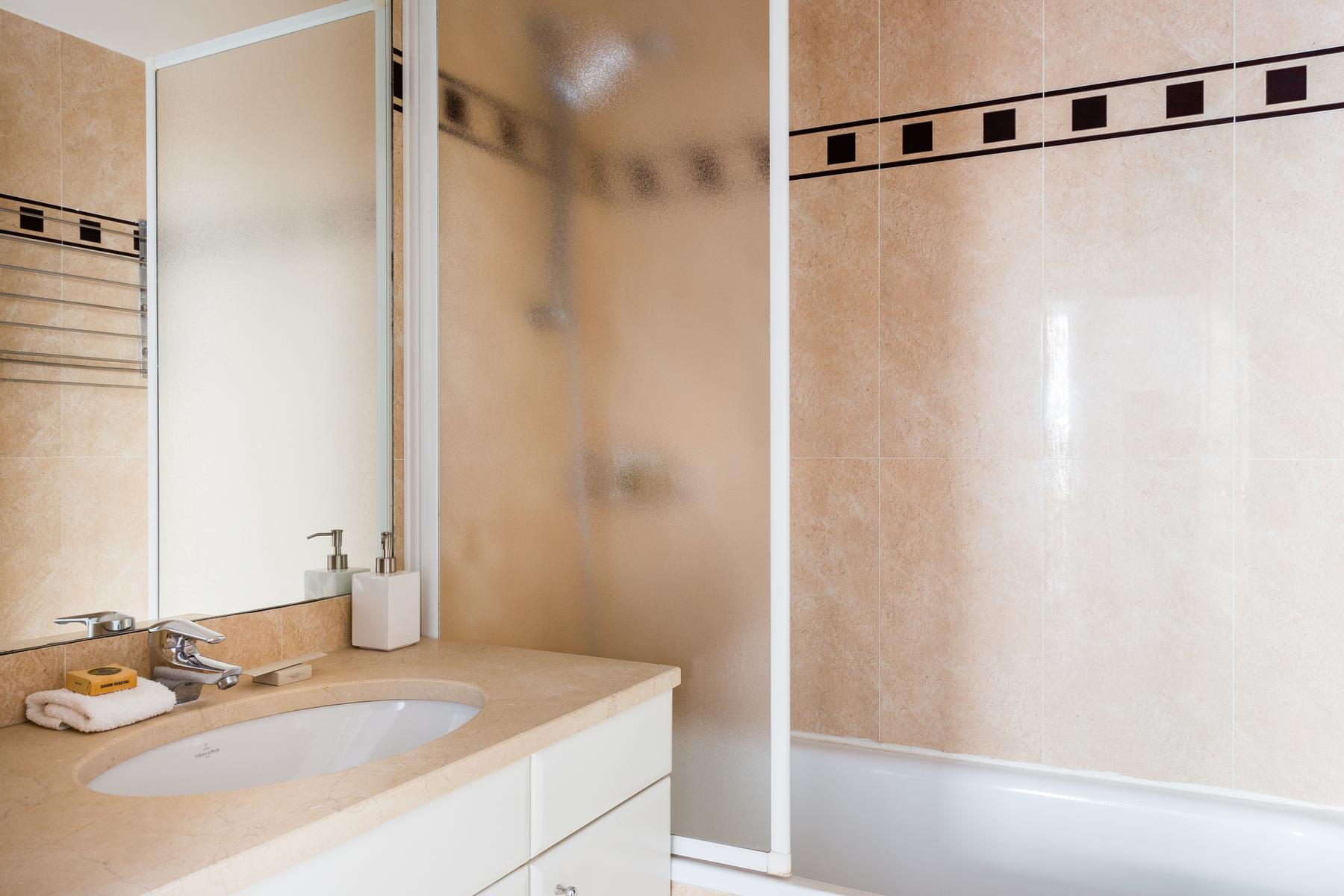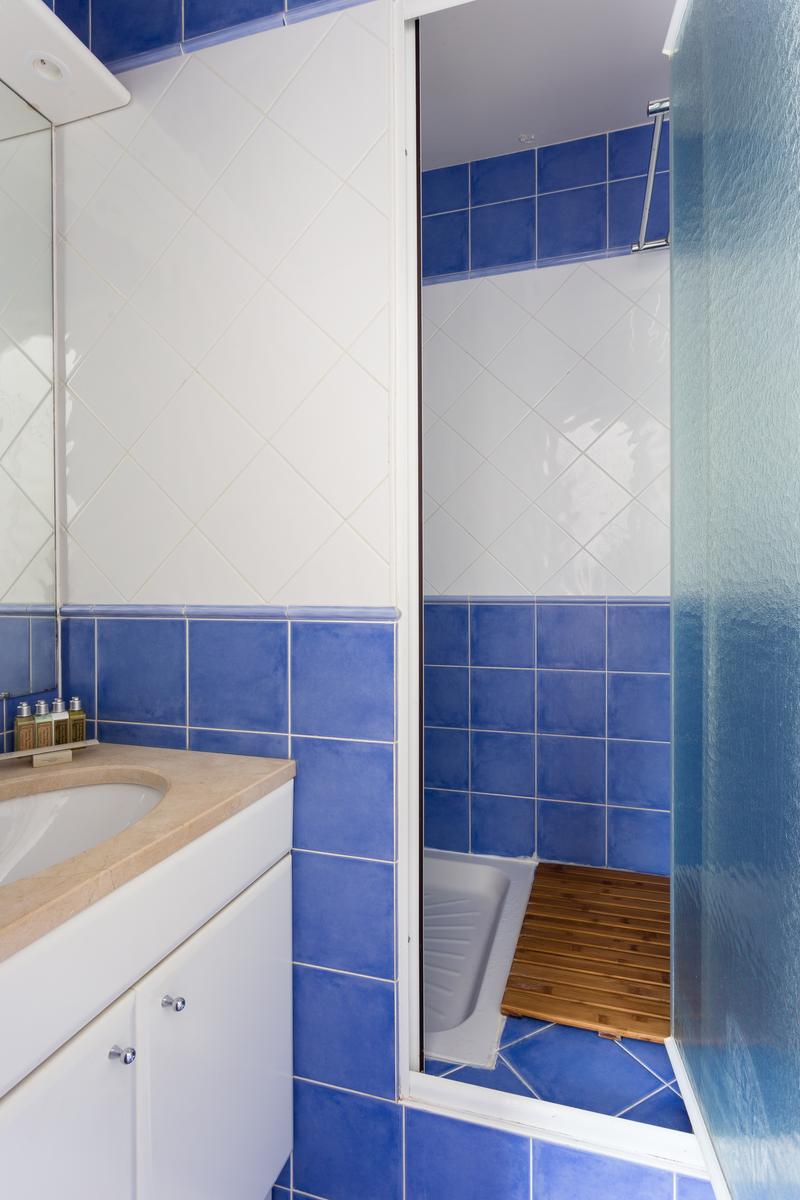 Une rue classique du Marais, où de grands arbres ombragent des boutiques et des cafés animés, mène à cette maison. Vous entrez au quatrième étage, dans un couloir. A droite, vous trouverez une salle de toilette et la cuisine, son bar à déjeuner entouré de tabourets imprimés. A gauche, il y a une salle de bain et la deuxième chambre à coucher, qui est simplement meublée et sereine.