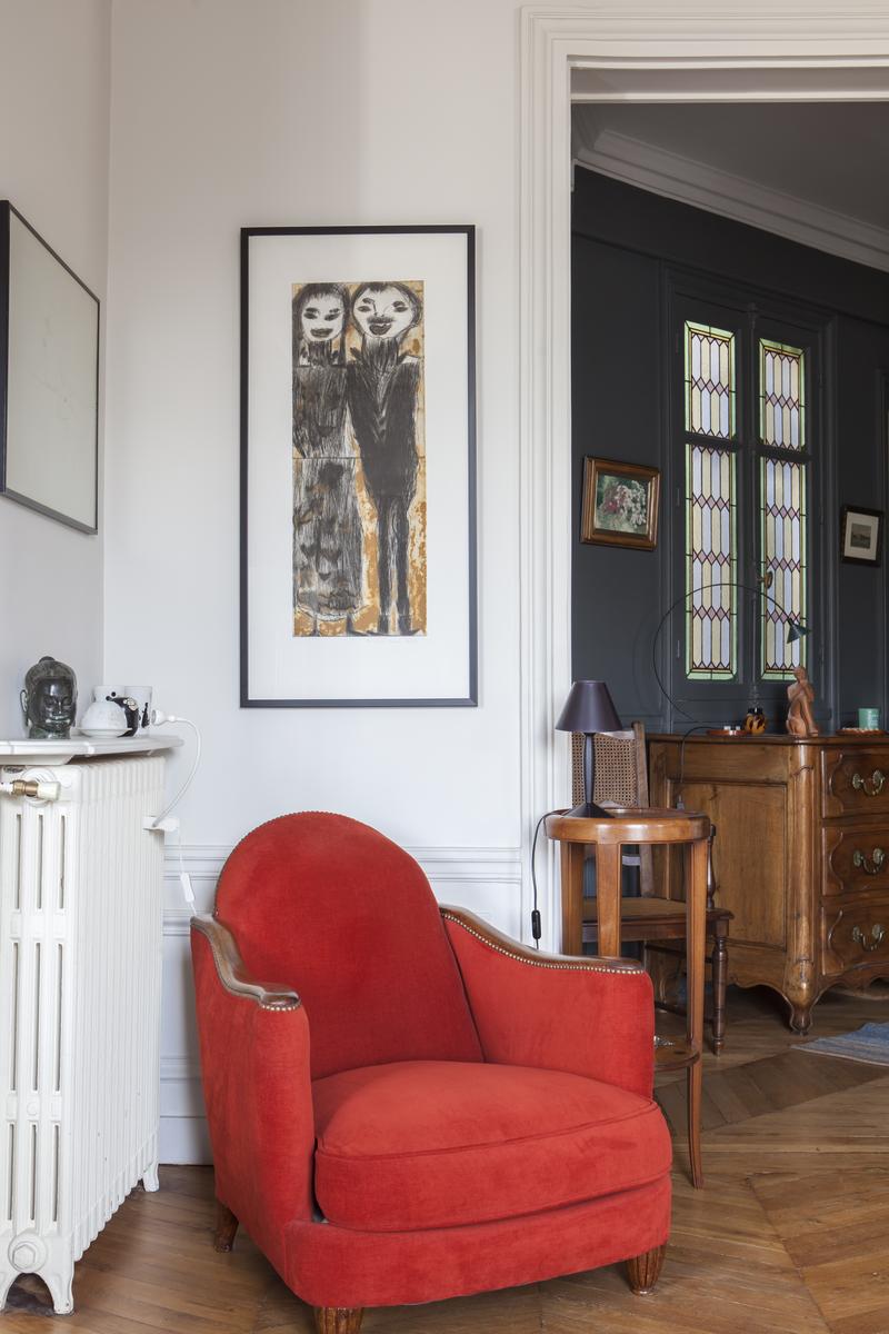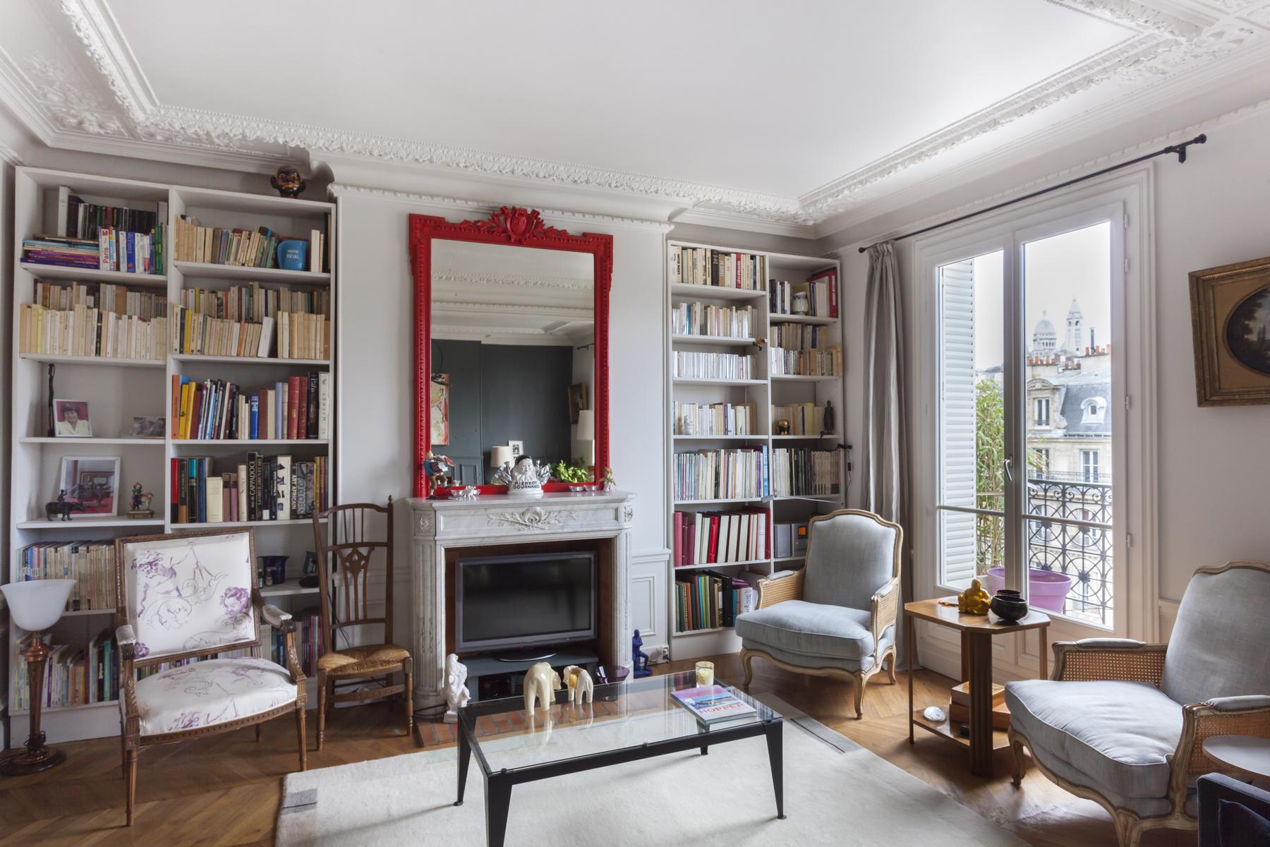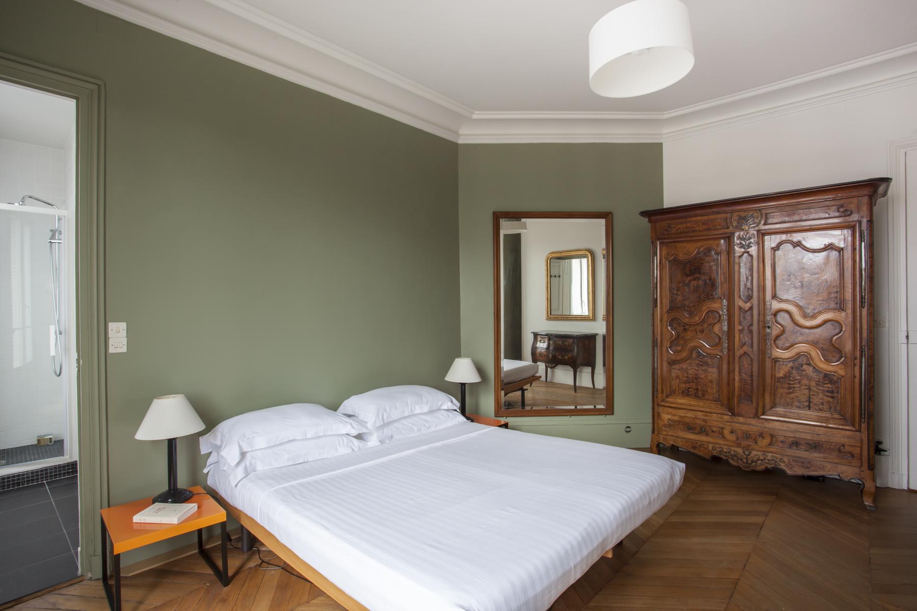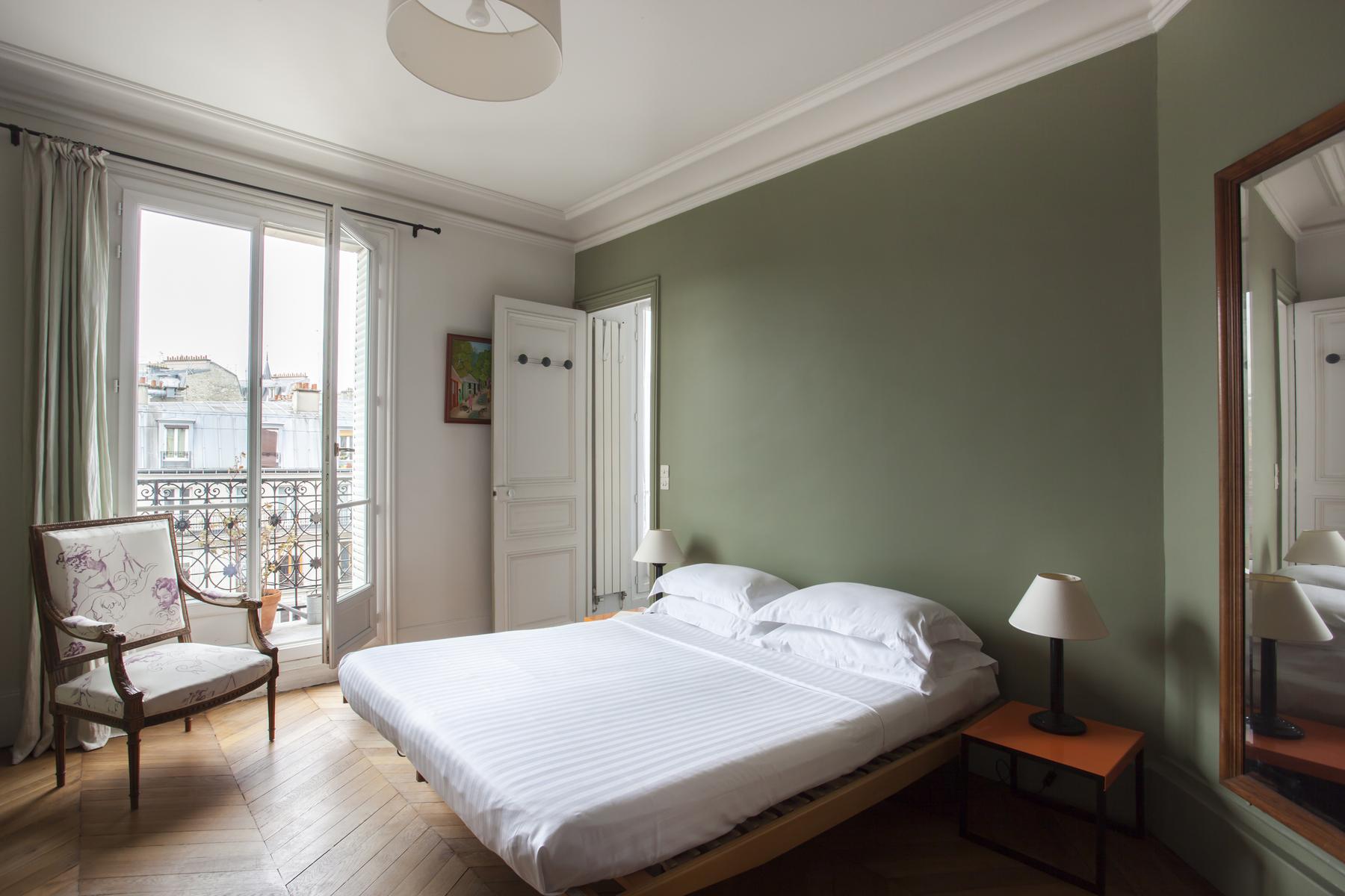 De retour dans le hall d’entrée, le salon est droit devant. D’un côté, il y a un coin salon bordé de livres, où un canapé et plusieurs fauteuils anciens s’assoient autour d’une table basse en verre et métal. Au-delà, sous une œuvre d’art moderne, il y a une table à manger avec des chaises rouges. Il y a aussi un balcon avec vue sur le Sacré-Coeur. Et puis, à côté, il y a la chambre des maîtres verte, qui a un lit queen-size et une salle de bain avec baignoire et douche.