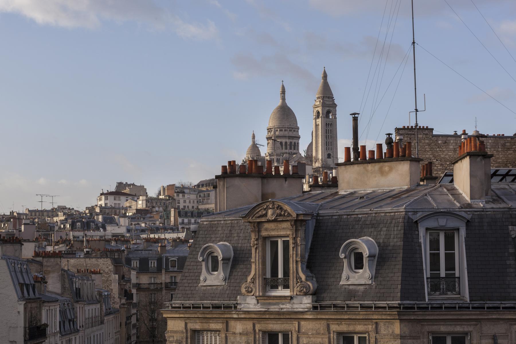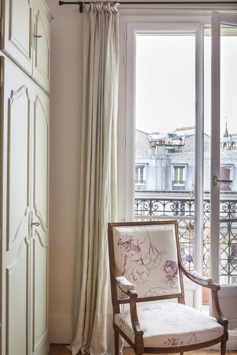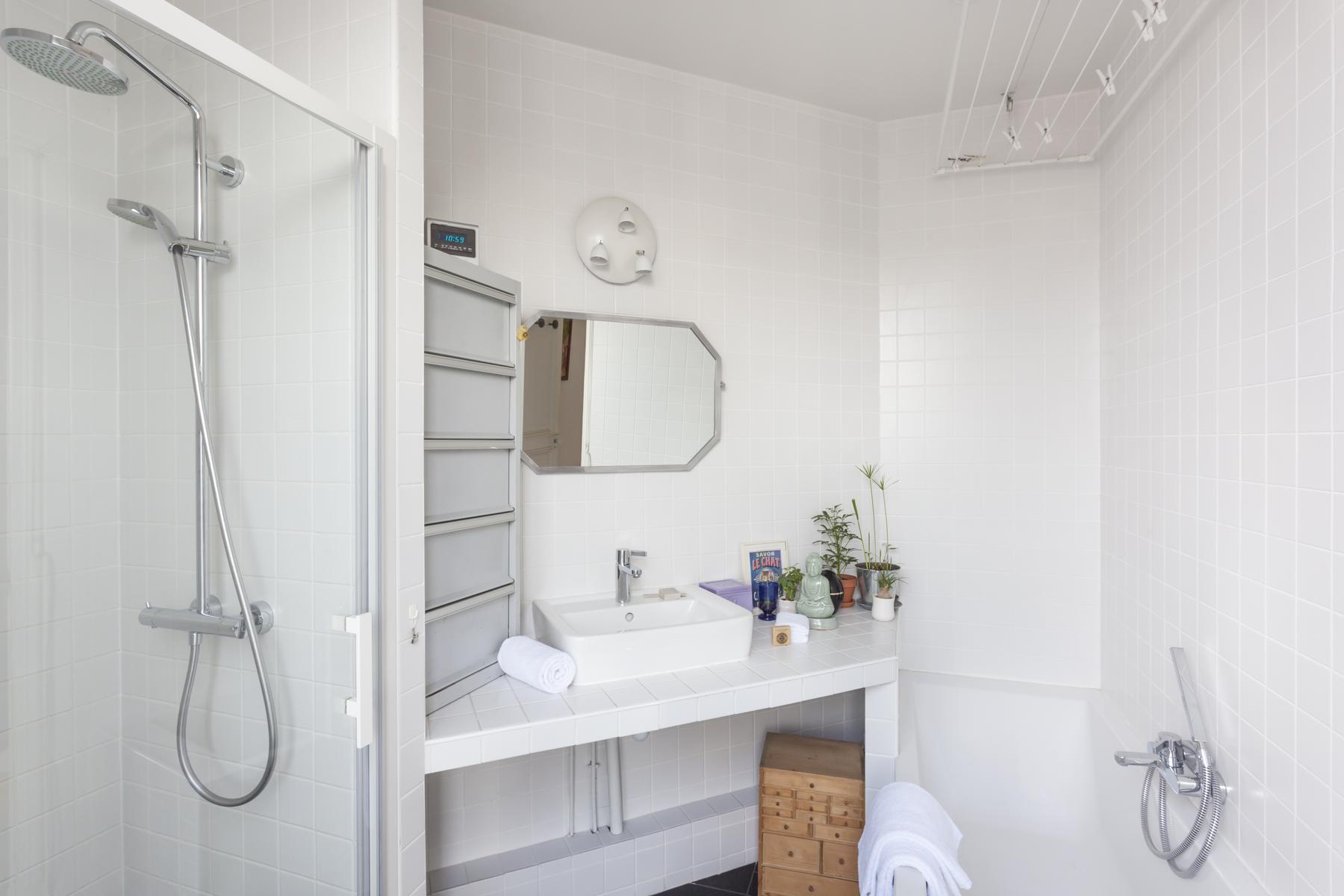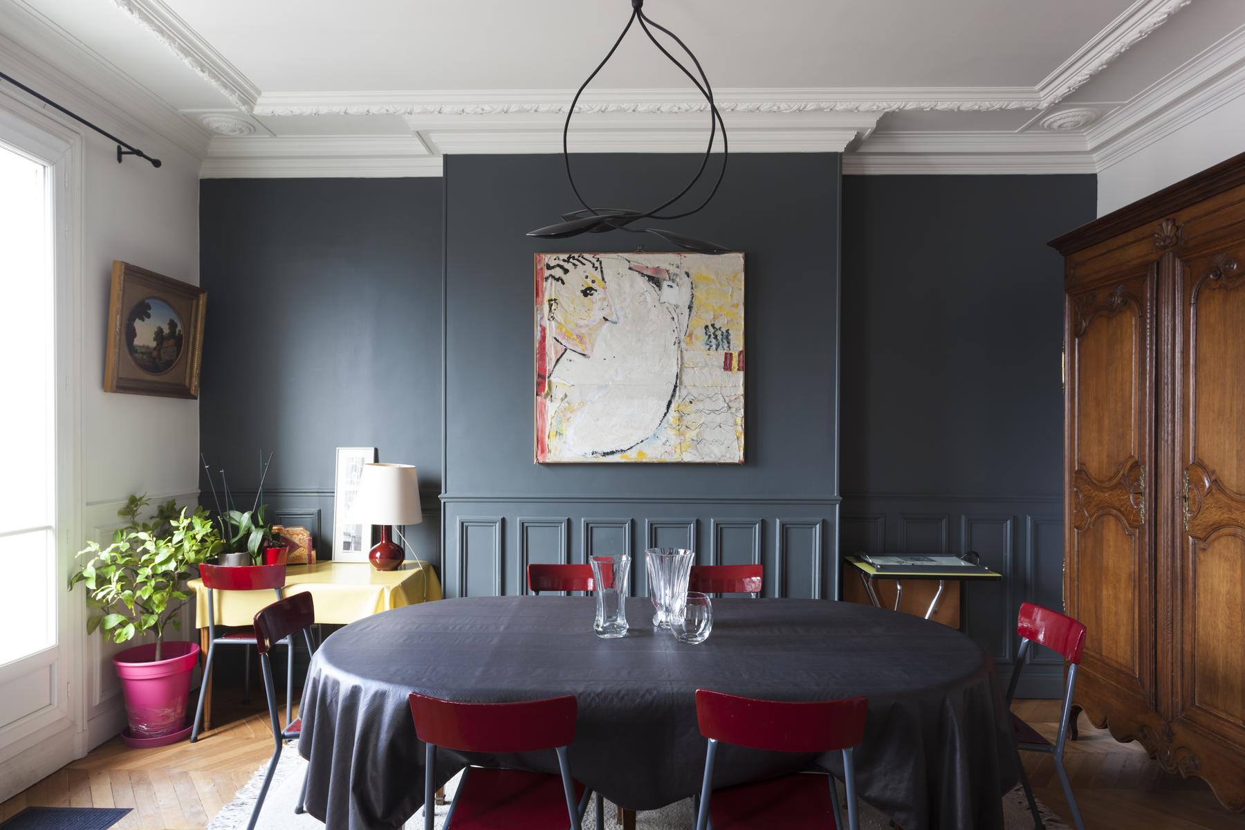 De retour dans le hall d’entrée, le salon est droit devant. D’un côté, il y a un coin salon bordé de livres, où un canapé et plusieurs fauteuils anciens s’assoient autour d’une table basse en verre et métal. Au-delà, sous une œuvre d’art moderne, il y a une table à manger avec des chaises rouges. Il y a aussi un balcon avec vue sur le Sacré-Coeur. Et puis, à côté, il y a la chambre des maîtres verte, qui a un lit queen-size et une salle de bain avec baignoire et douche.