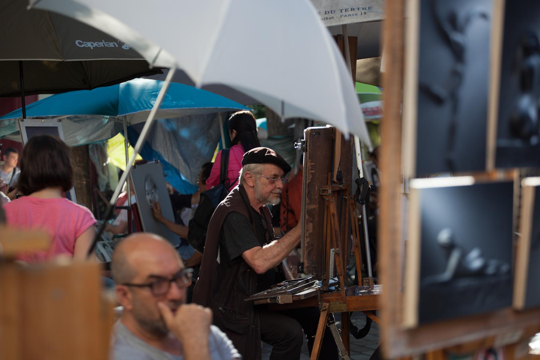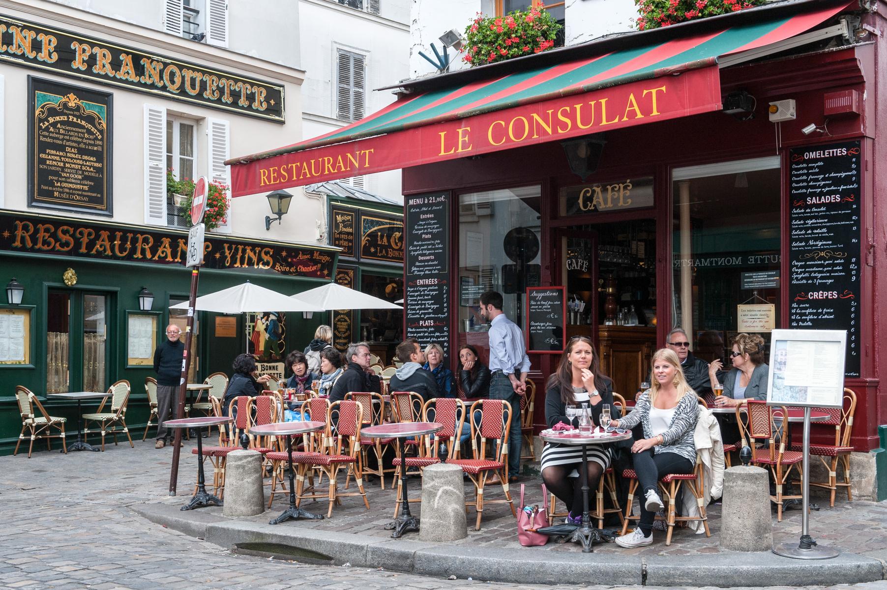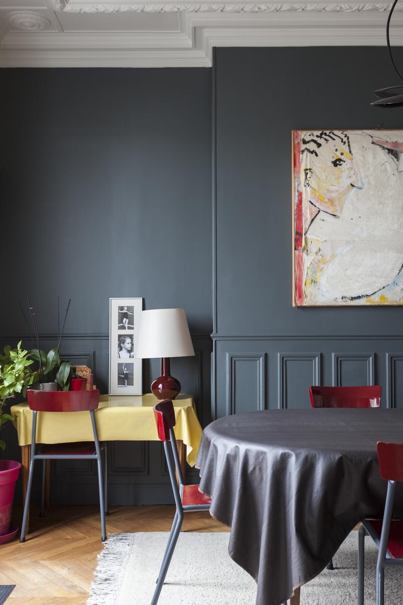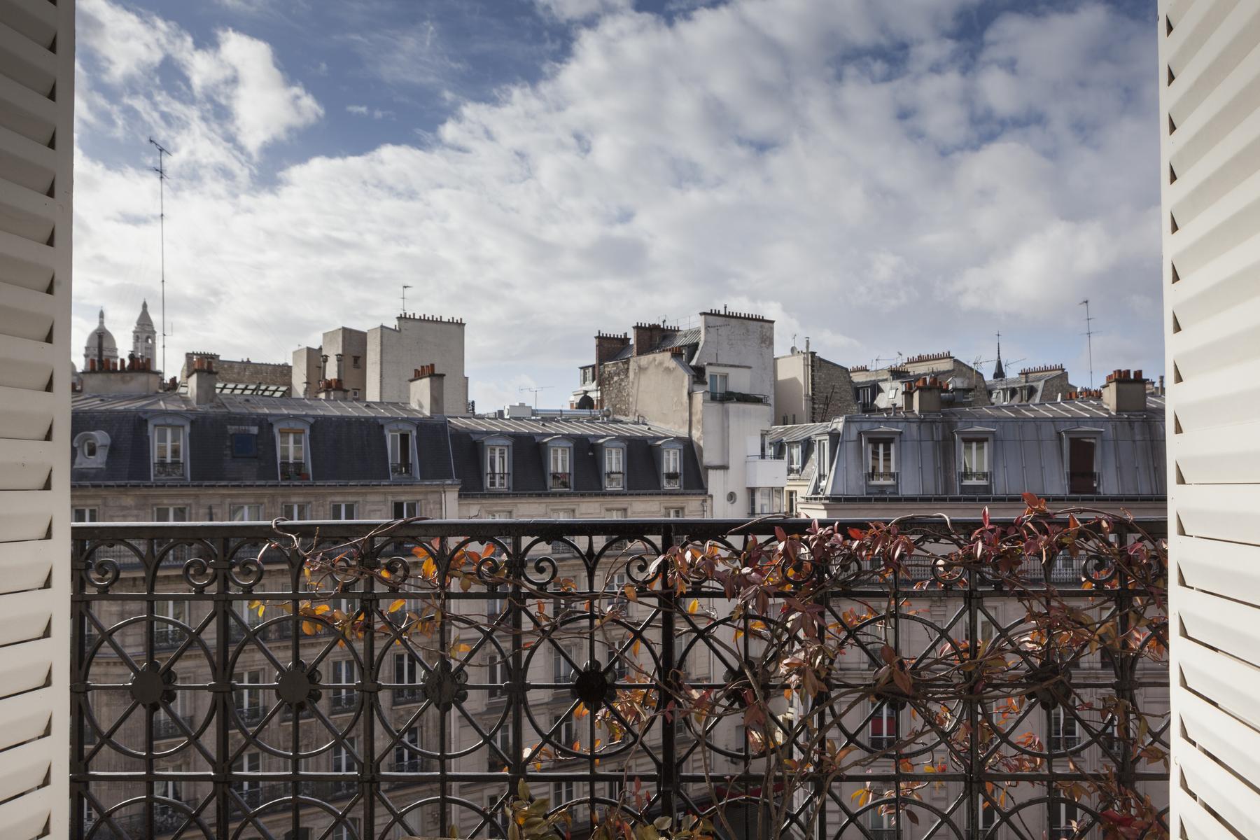 De retour dans le hall d’entrée, le salon est droit devant. D’un côté, il y a un coin salon bordé de livres, où un canapé et plusieurs fauteuils anciens s’assoient autour d’une table basse en verre et métal. Au-delà, sous une œuvre d’art moderne, il y a une table à manger avec des chaises rouges. Il y a aussi un balcon avec vue sur le Sacré-Coeur. Et puis, à côté, il y a la chambre des maîtres verte, qui a un lit queen-size et une salle de bain avec baignoire et douche.