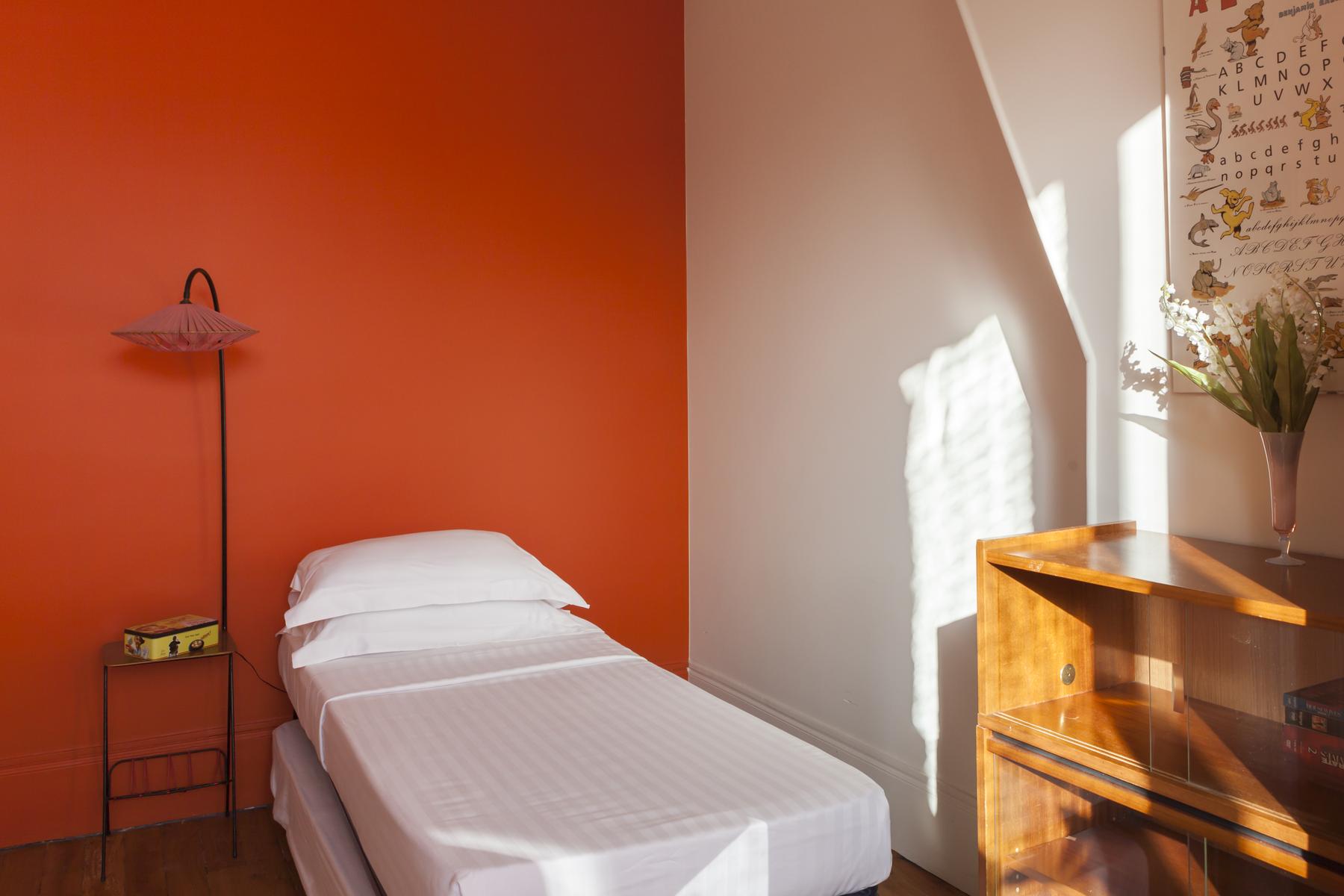 Boulevard Ornano a plus qu’un soupçon d’énergie de Montmartre – l’énergie de Pigalle Sud. La porte d’entrée (au cinquième étage) s’ouvre sur un couloir, où vous trouverez un passage juste à droite. Cela mène d’abord à la cuisine – une pièce rétro décorée en rouge et blanc – puis à une salle de toilette et à la deuxième chambre à coucher orange-orange, qui a un petit bureau et un lit simple (avec trundle).