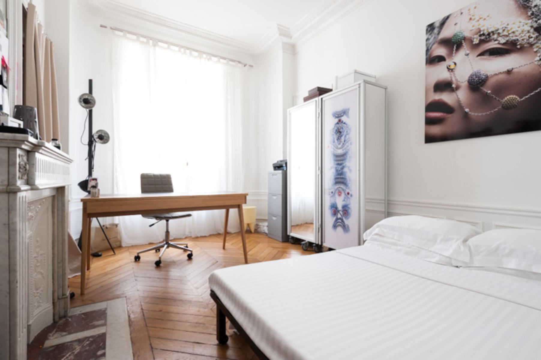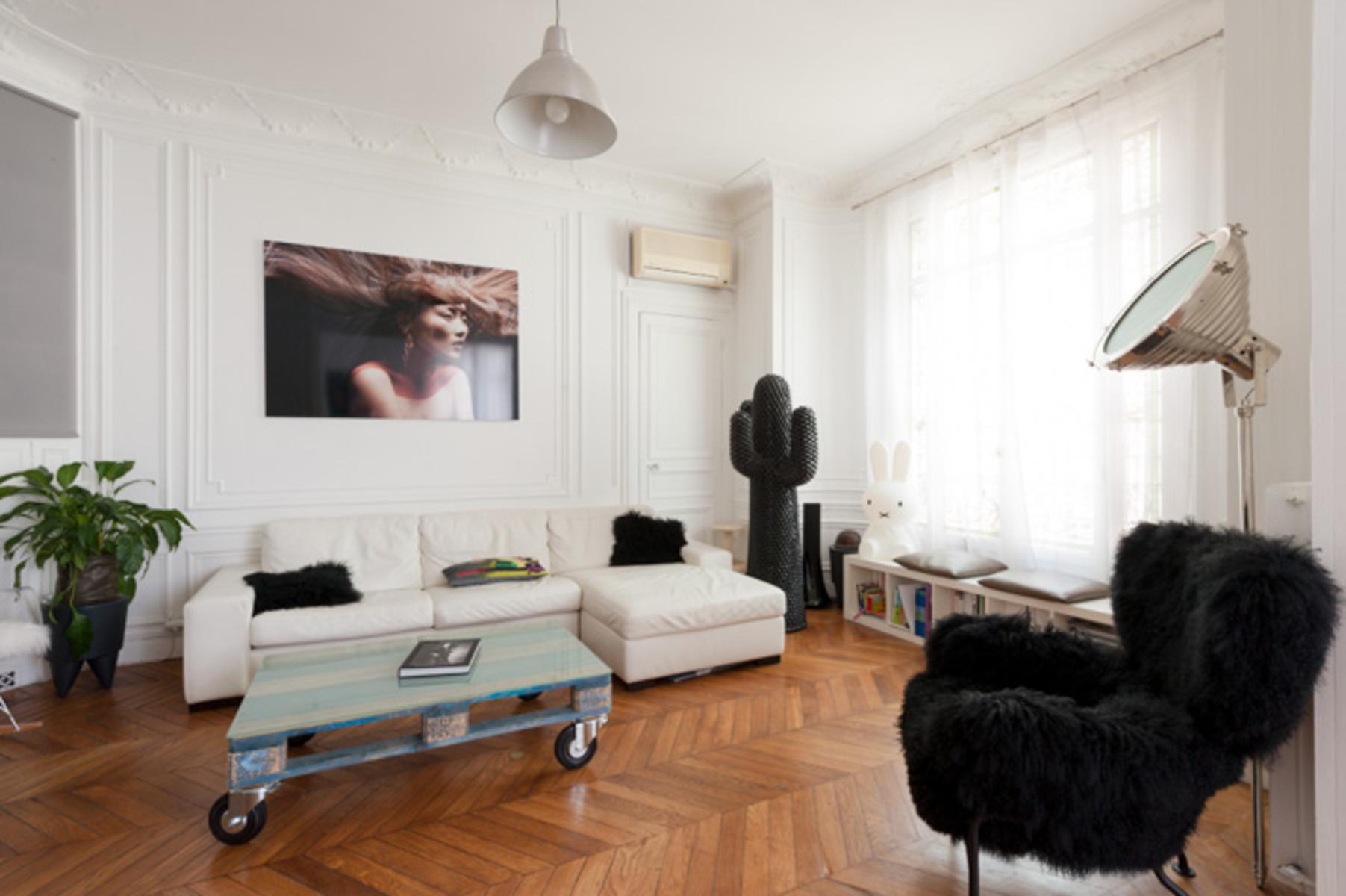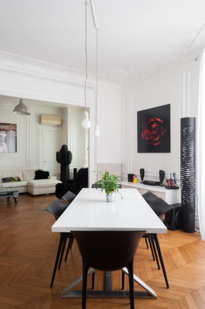 En flânant dans les brasseries et les boutiques du centre-ville de Saint-Germain-des-Prés, vous découvrirez cette maison du deuxième étage en retrait d’un boulevard classique. À l’intérieur, le salon et la salle à manger sont tout droit devant. Les plafonds en cornique et les parquets de cette chambre sont un charmant contrepoint à son ameublement kooky. Il y a un long canapé en cuir, un fauteuil en fourrure et une lampe de studio dans le coin salon, et une table blanche angulaire dans la salle à manger en face.