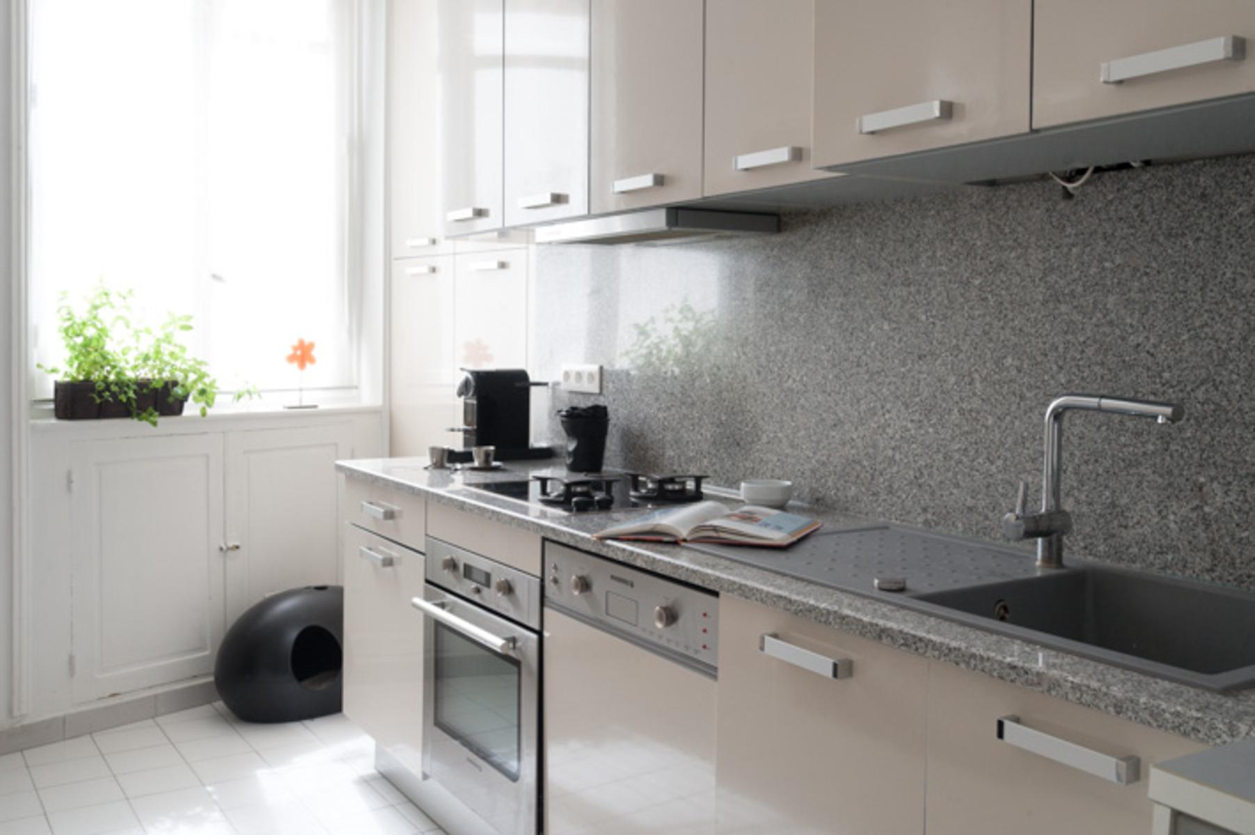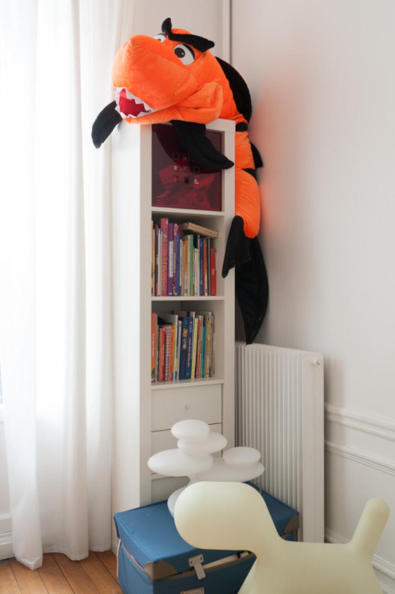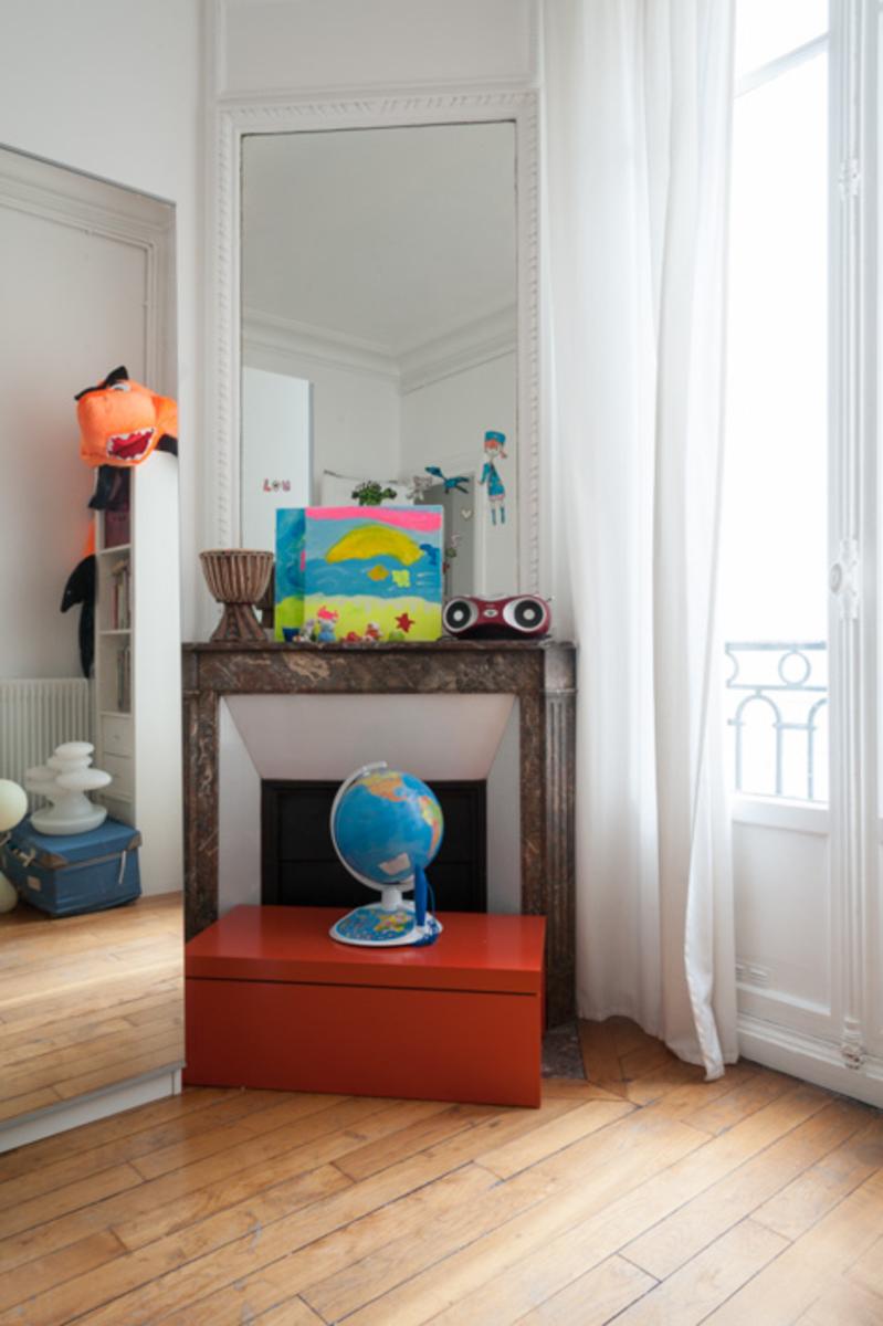 En flânant dans les brasseries et les boutiques du centre-ville de Saint-Germain-des-Prés, vous découvrirez cette maison du deuxième étage en retrait d’un boulevard classique. À l’intérieur, le salon et la salle à manger sont tout droit devant. Les plafonds en cornique et les parquets de cette chambre sont un charmant contrepoint à son ameublement kooky. Il y a un long canapé en cuir, un fauteuil en fourrure et une lampe de studio dans le coin salon, et une table blanche angulaire dans la salle à manger en face.
