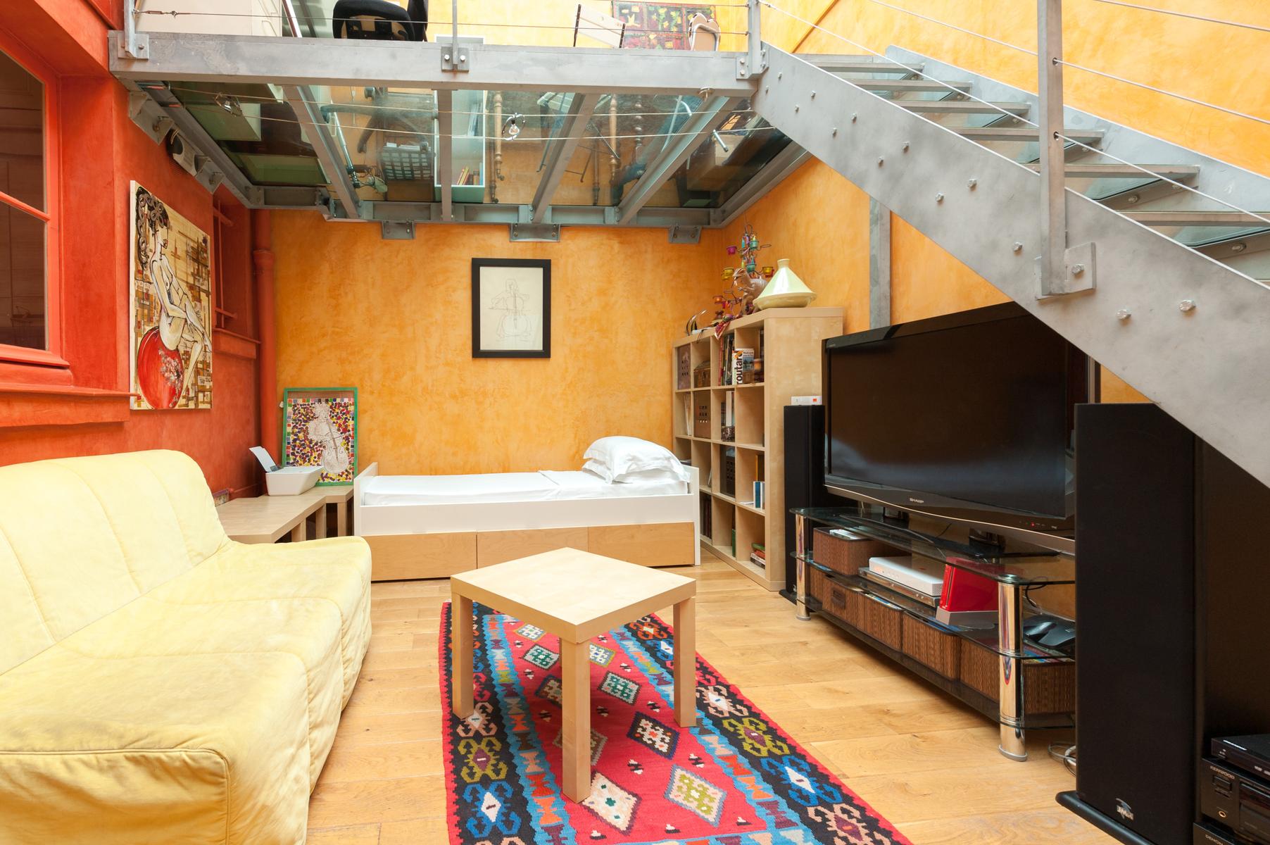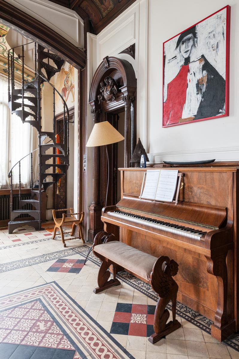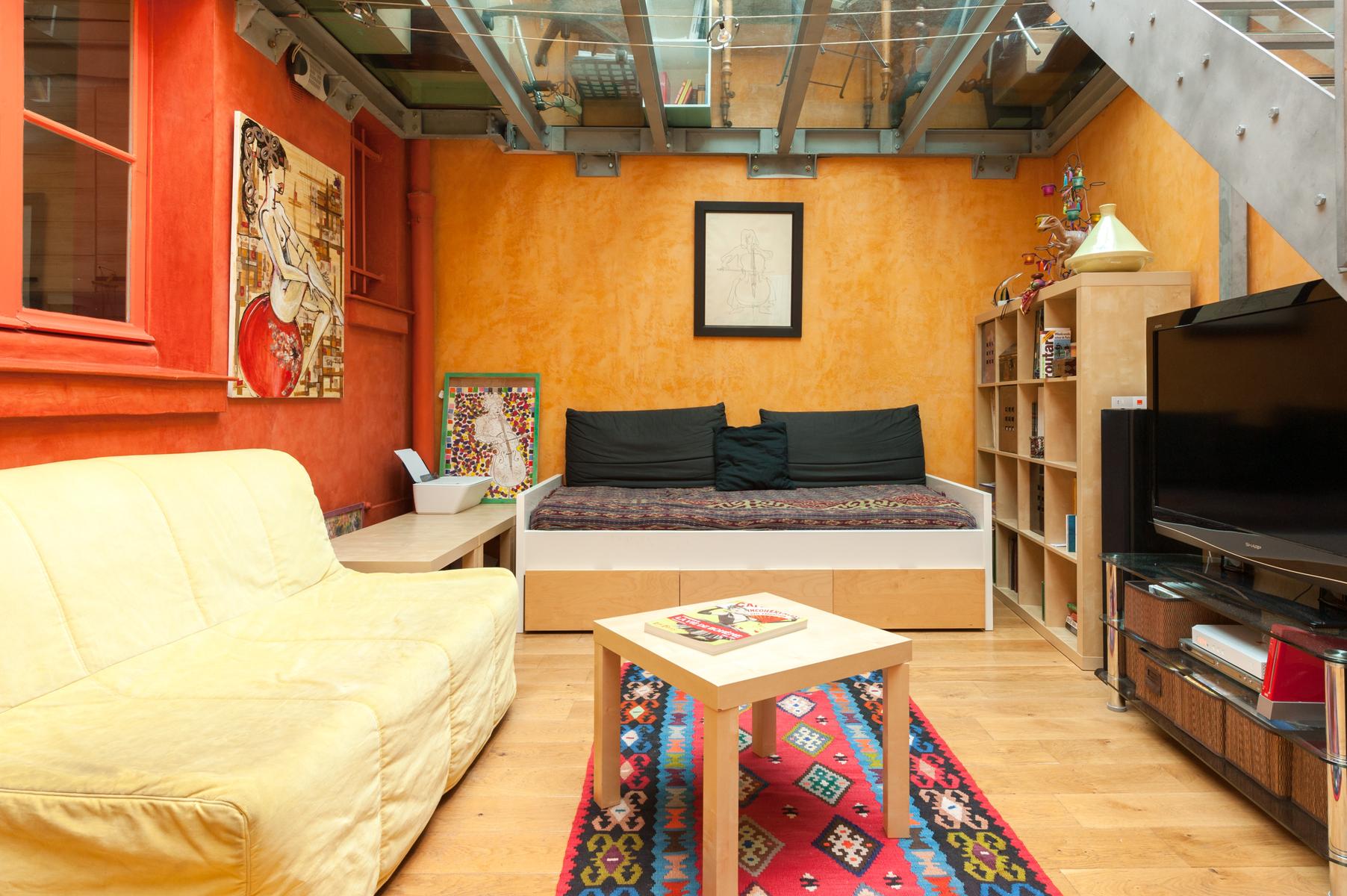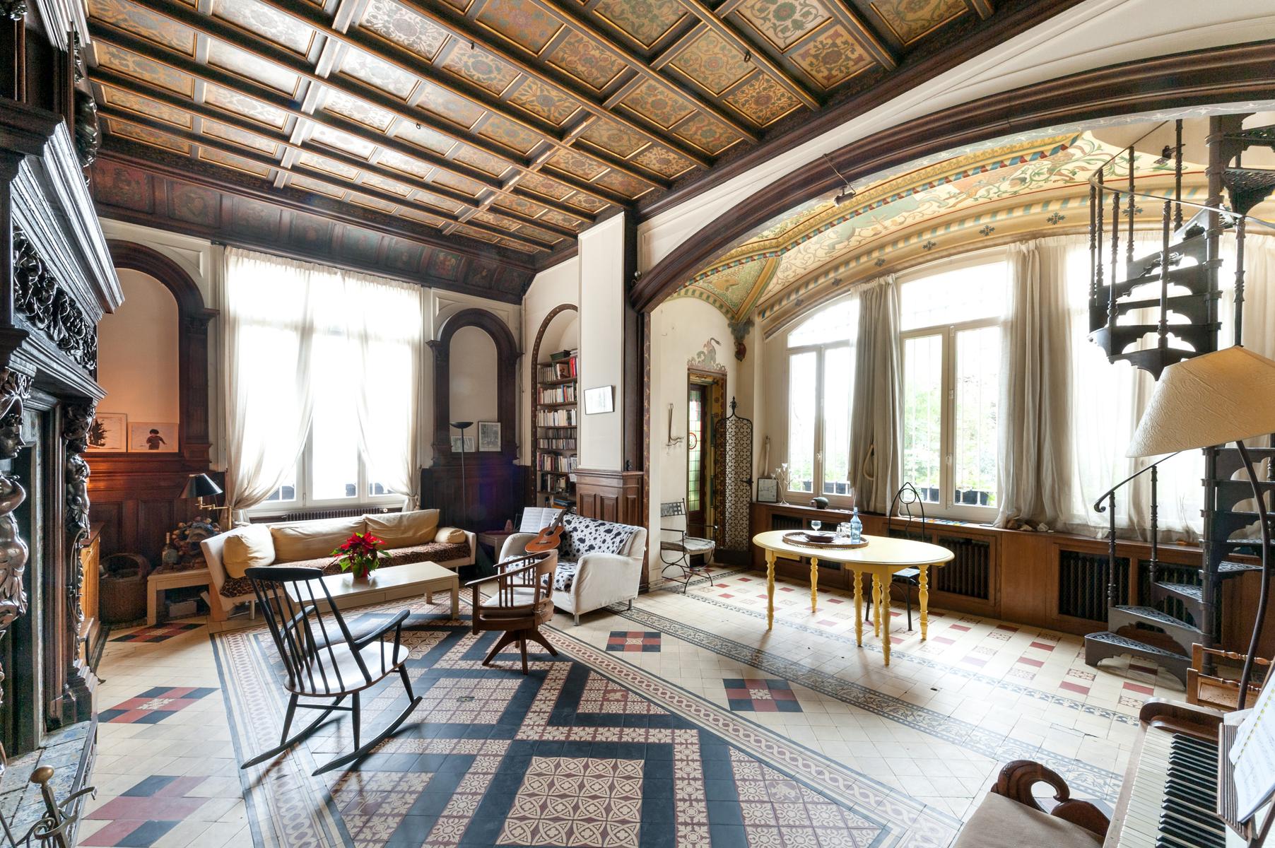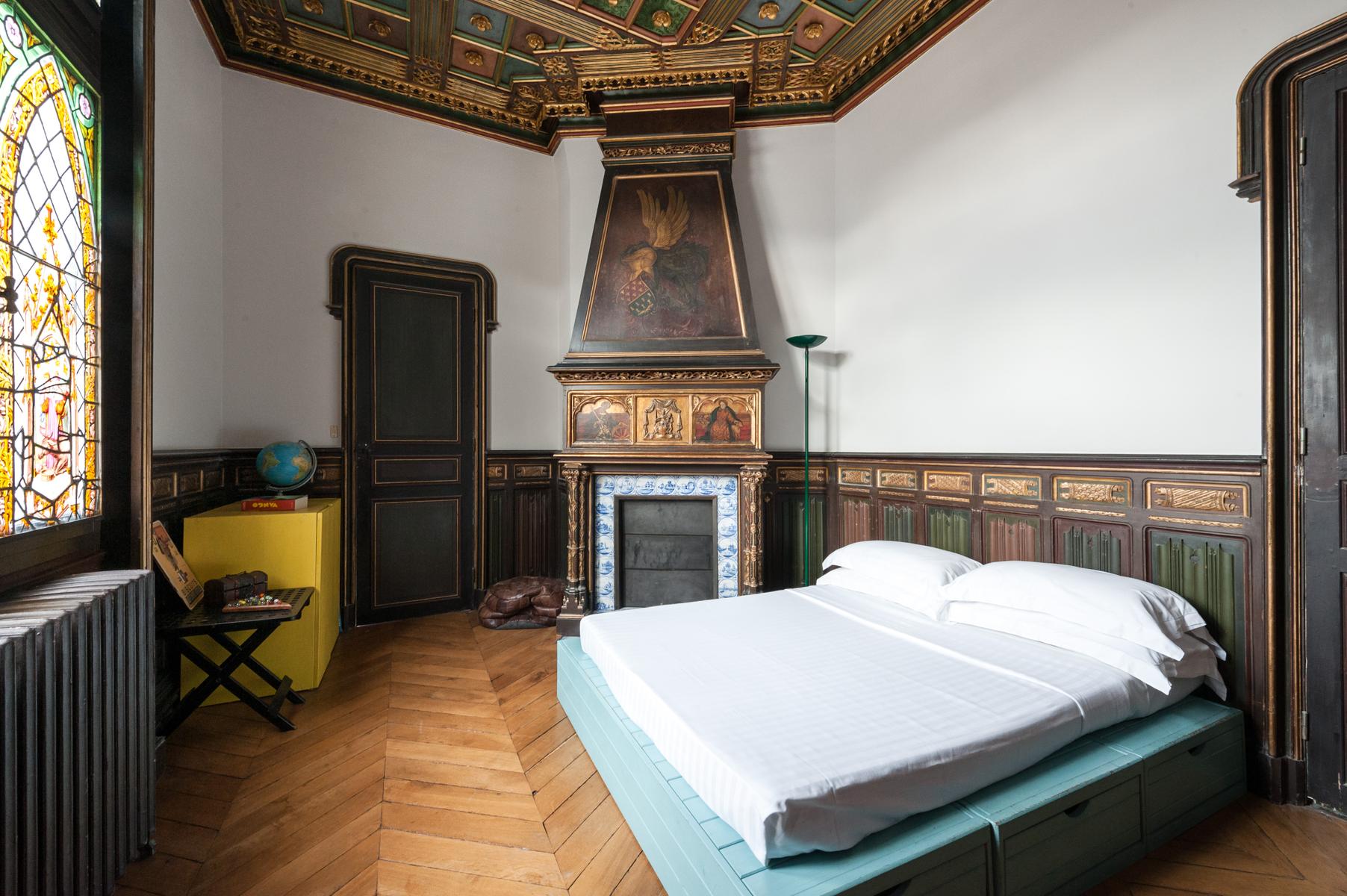 Des carreaux de sol ornés de motif-ornement, un plafond à panneaux délicatement peint et des sculptures en bois complexes – le salon de l’Impasse Marie Blanche crée toute une impression. Cette maison néo-gothique unique au cœur de Montmatre est l’une des sept seules du genre à Paris et a été soigneusement préservée par vos hôtes. Un couloir de style médiéval mène à la cuisine, où un haut plafond surplombe une cheminée en pierre sculptée. Derrière la cuisine se trouve le seul ajout moderne – un bureau peint en tons orange vif avec un escalier industriel en acier menant à une mezzanine en verre.
