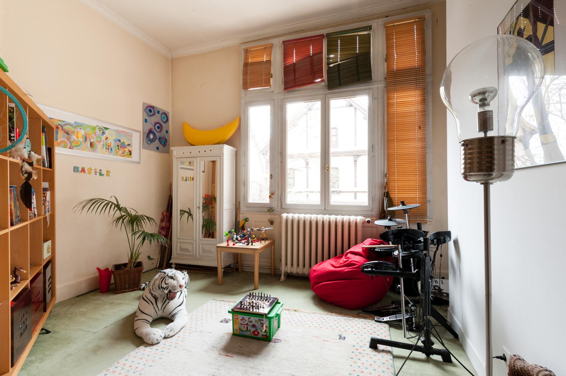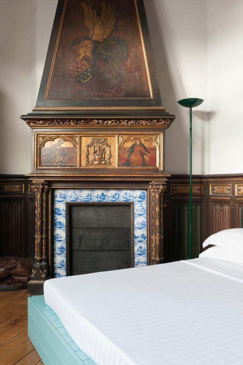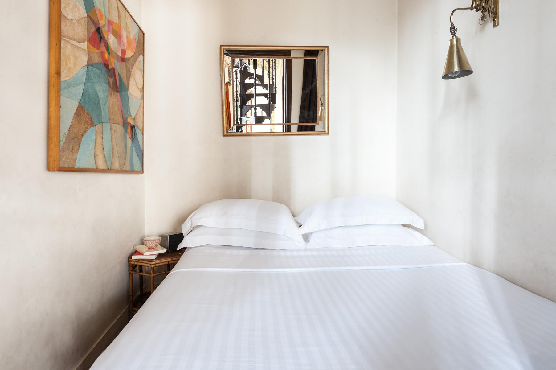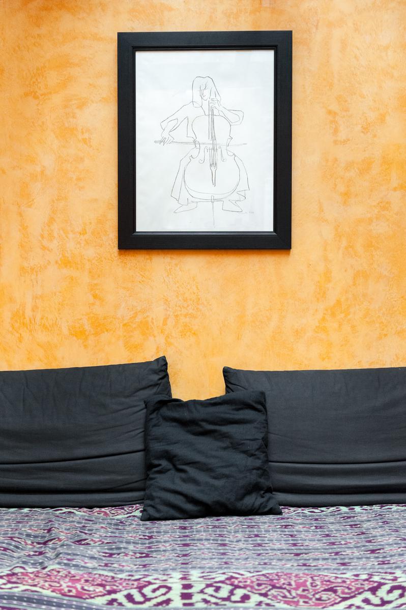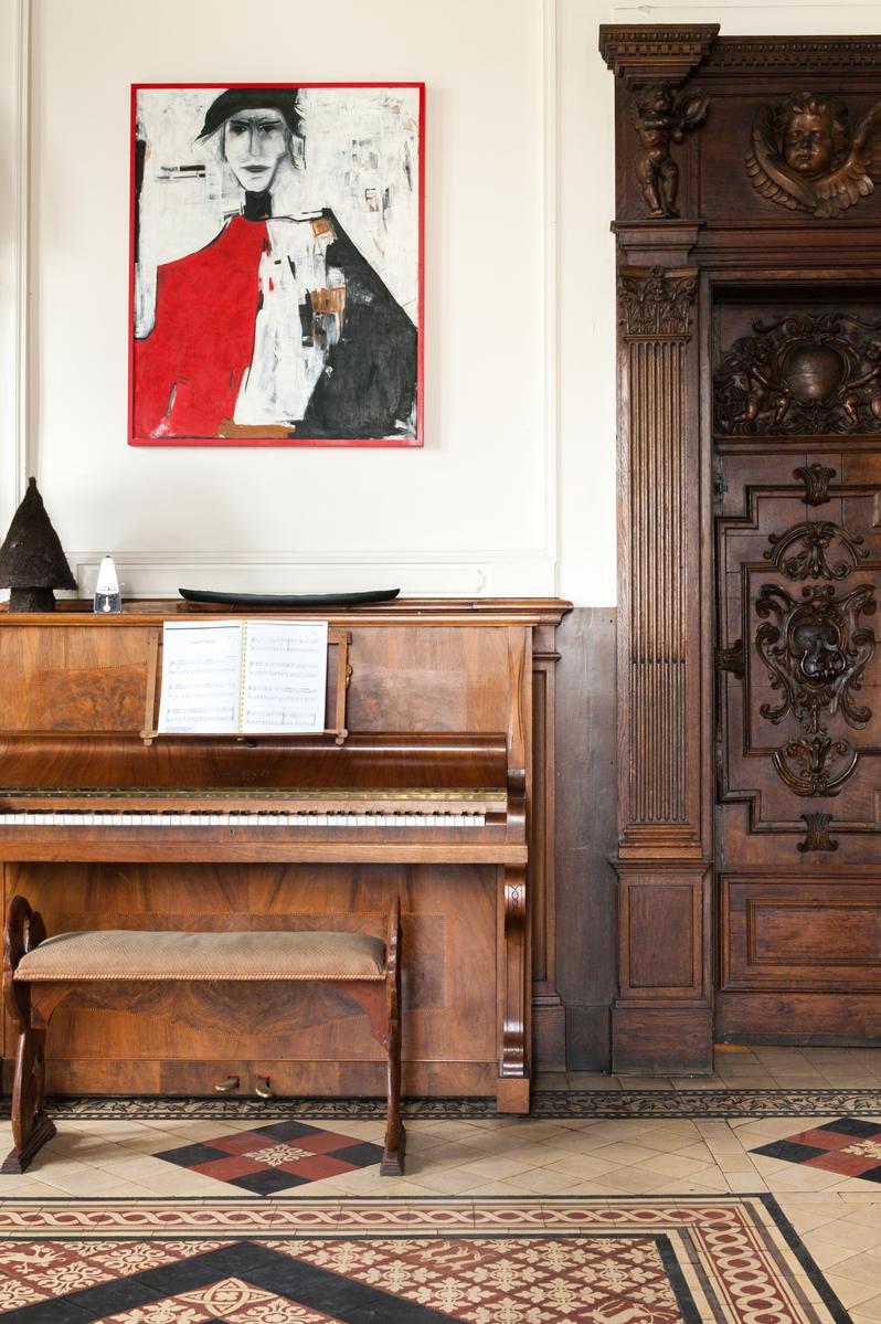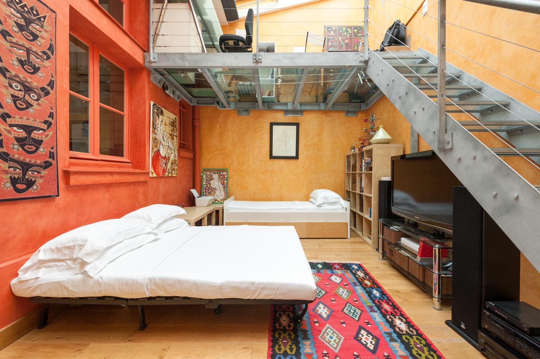 Des carreaux de sol ornés de motif-ornement, un plafond à panneaux délicatement peint et des sculptures en bois complexes – le salon de l’Impasse Marie Blanche crée toute une impression. Cette maison néo-gothique unique au cœur de Montmatre est l’une des sept seules du genre à Paris et a été soigneusement préservée par vos hôtes. Un couloir de style médiéval mène à la cuisine, où un haut plafond surplombe une cheminée en pierre sculptée. Derrière la cuisine se trouve le seul ajout moderne – un bureau peint en tons orange vif avec un escalier industriel en acier menant à une mezzanine en verre.