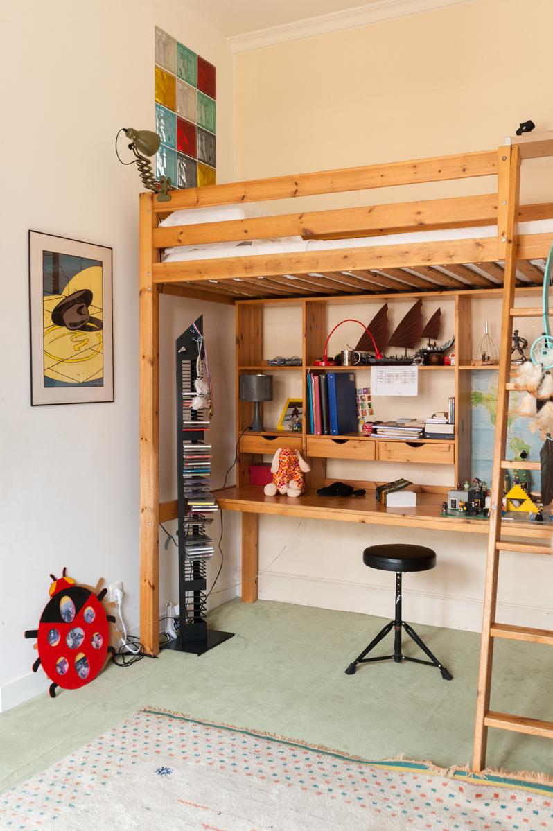 En haut de l’escalier en fonte du salon se trouvent les deux chambres du premier étage. Dans la chambre des maîtres, un vitrail surplombe le lit et une salle de bains blanche est un luxe moderne. Au rez-de-chaussée, à côté du salon, se trouve la salle de bains principale avec un plafond en dôme et une chambre double compacte. Et il y a aussi une salle de jeux au sous-sol.
