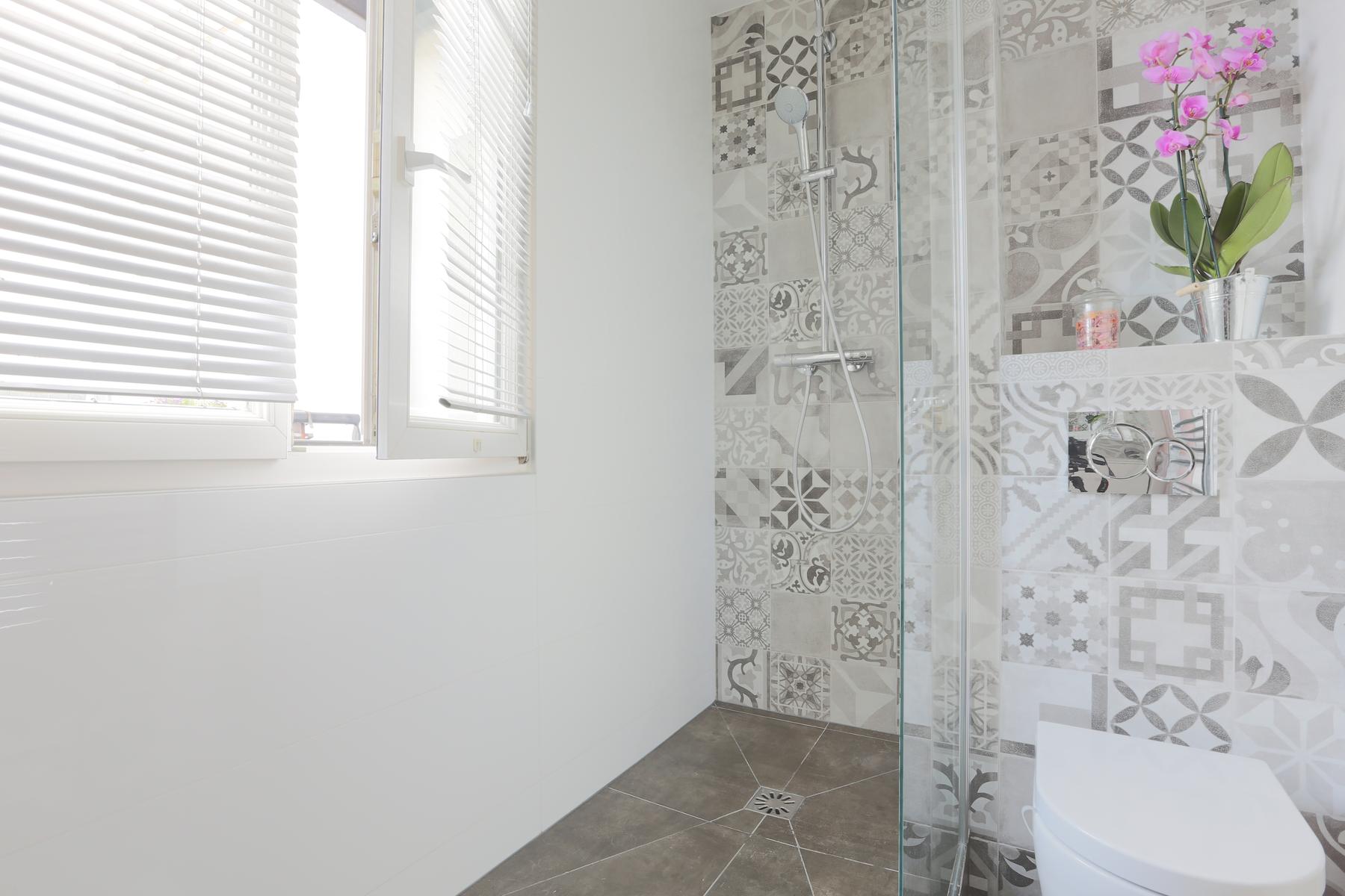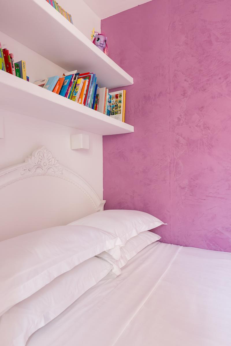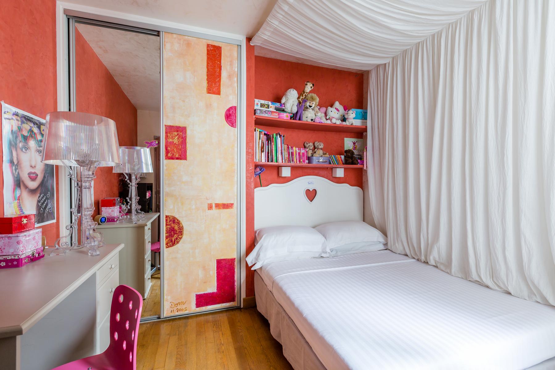 L’affirmation la plus audacieuse de cette maison est la cuisine, où les carreaux rouges brillants sont assortis aux lampes suspendues, et le bar du petit déjeuner est orné de trois tabourets contemporains. Au même niveau, vous trouverez la chambre principale, brossée de teintes plus calmes. Une fenêtre pleine longueur encadre la terrasse joliment plantée à l’extérieur et il y a une douce alcôve décorée d’œuvres d’art. Et il y a deux autres chambres lumineuses qui conviennent bien aux plus jeunes : la chambre double est suspendue avec un charmant auvent et la chambre simple a un lit de style princesse et des étagères rose vif.