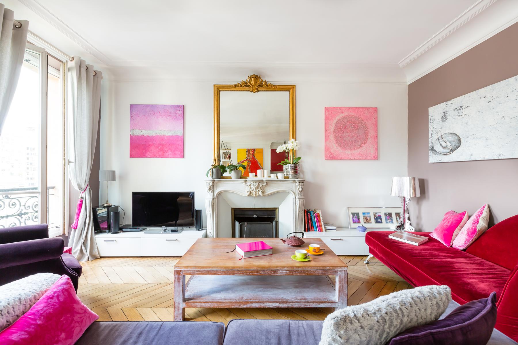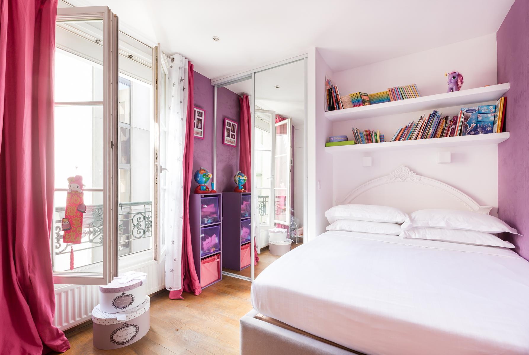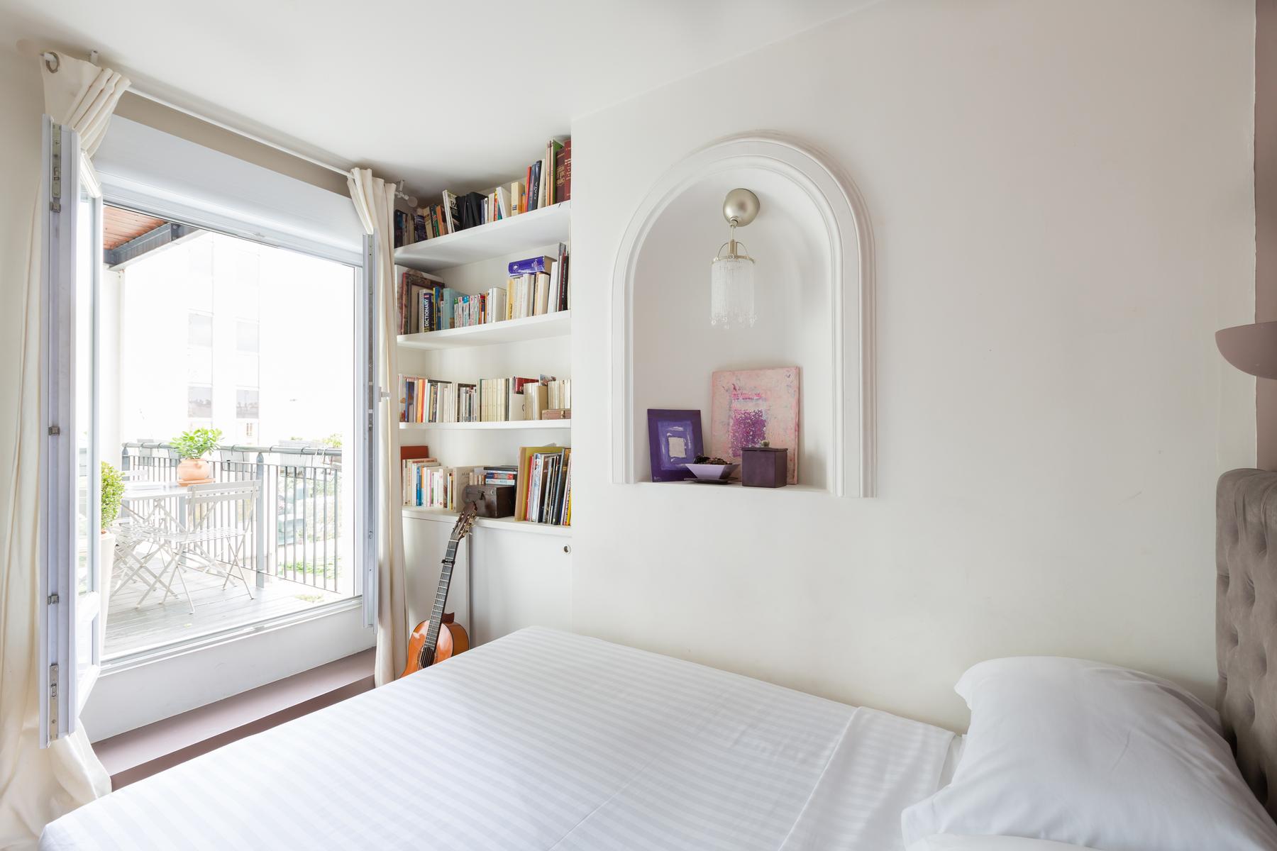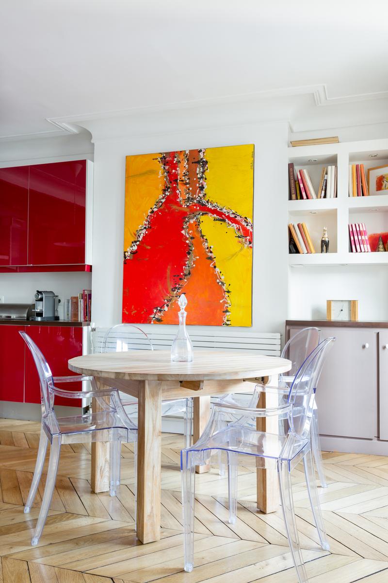 Le joli Jardin du Luxembourg, les grandes boutiques de Saint-Germain-des-Prés, la Closerie des Lilas, la Closerie des Lilas, tout est là pour stimuler l’imagination à Montparnasse. A l’intérieur de Place Bienvenüe, les œuvres d’art abstrait complètent l’ameublement – des peintures roses et des chaises en velours longues dans le salon à la dramatique toile orange à côté des armoires rouges de la cuisine. Vous trouverez la table de salle à manger entre les deux – elle est disposée avec quatre chaises en plexiglas et se trouve à côté des étagères modulaires empilées avec la collection de titres de vos hôtes.