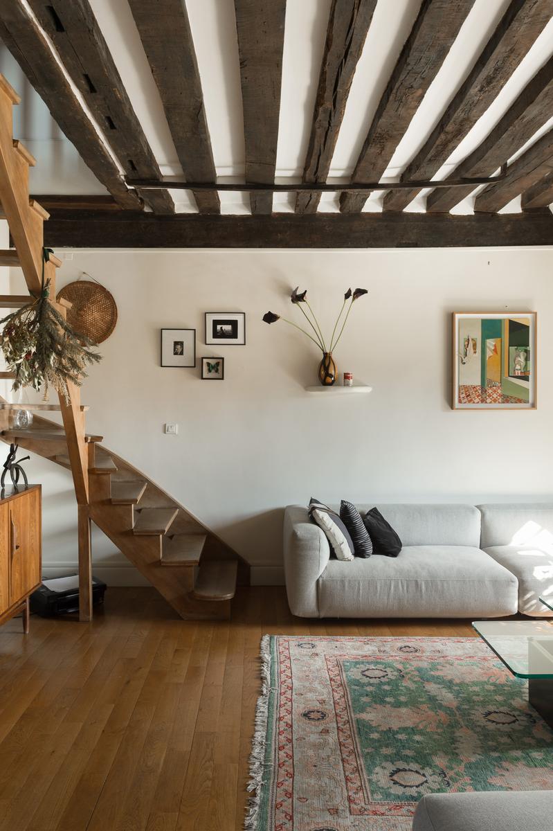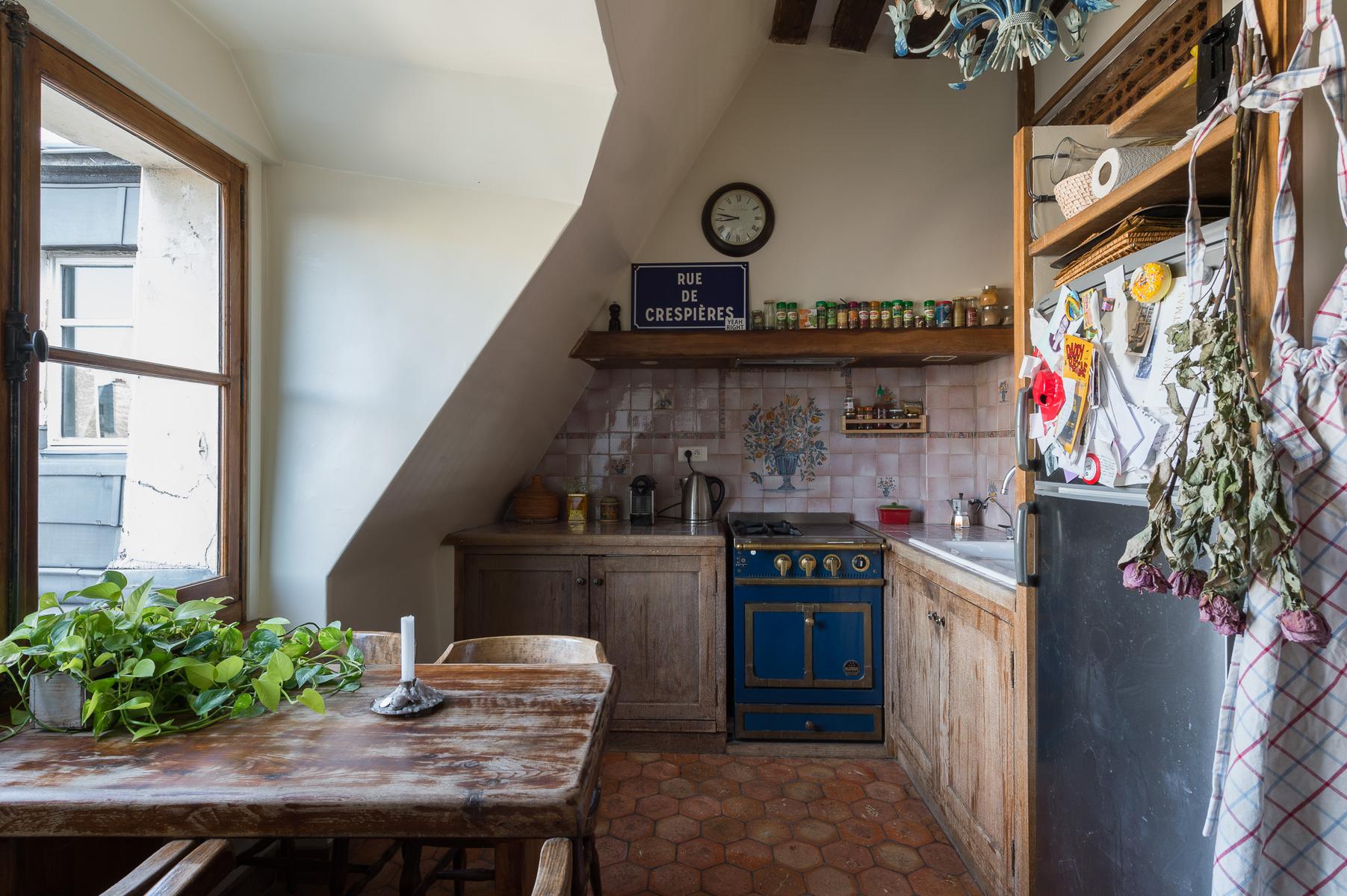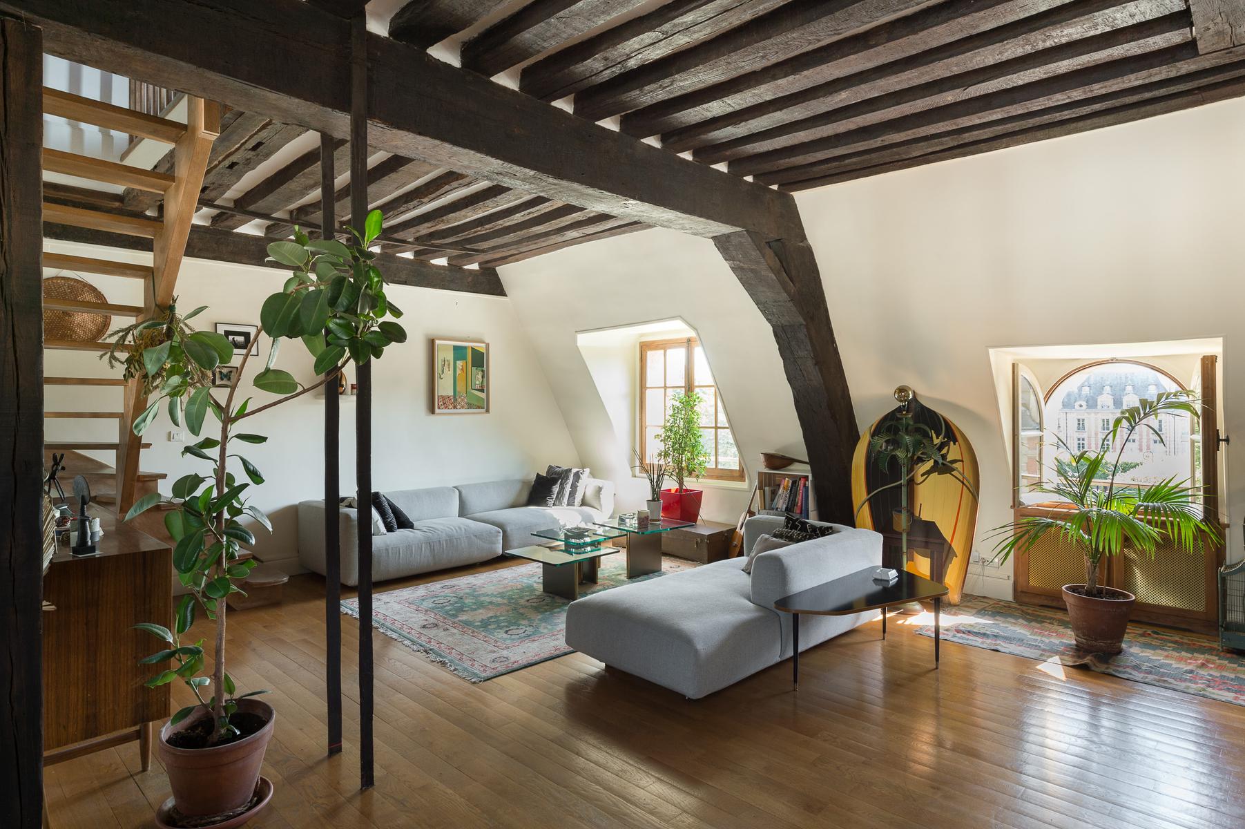 Avec ses poutres sombres et ses vues sur les fontaines et les châtaigniers, la Place des Vosges semble plus provençale que parisienne. En entrant au troisième étage, la salle de bains au sol en terre cuite se trouve à gauche, et tout droit devant vous arriverez au salon. Les plantes en pot complètent un buffet en bois et des poutres brutes, et il y a de la place pour quatre personnes dans la cuisine de style maison de ferme, à gauche.