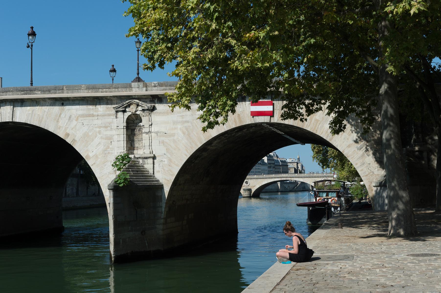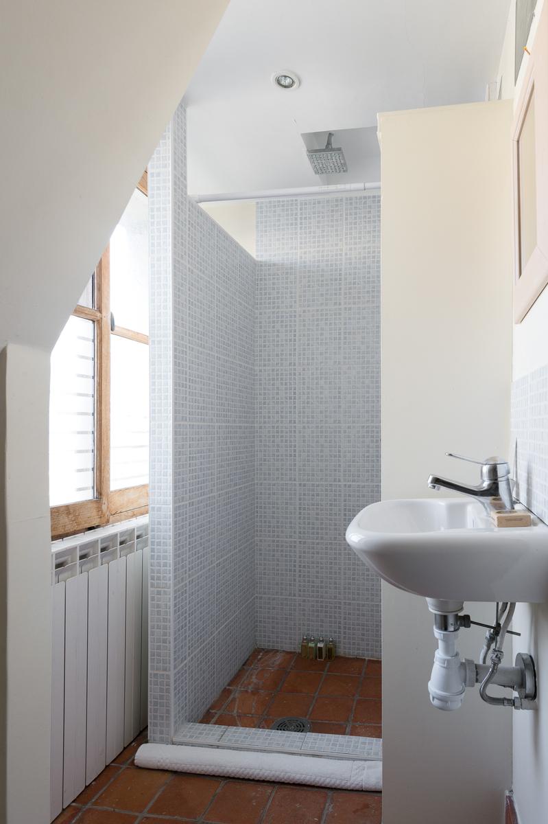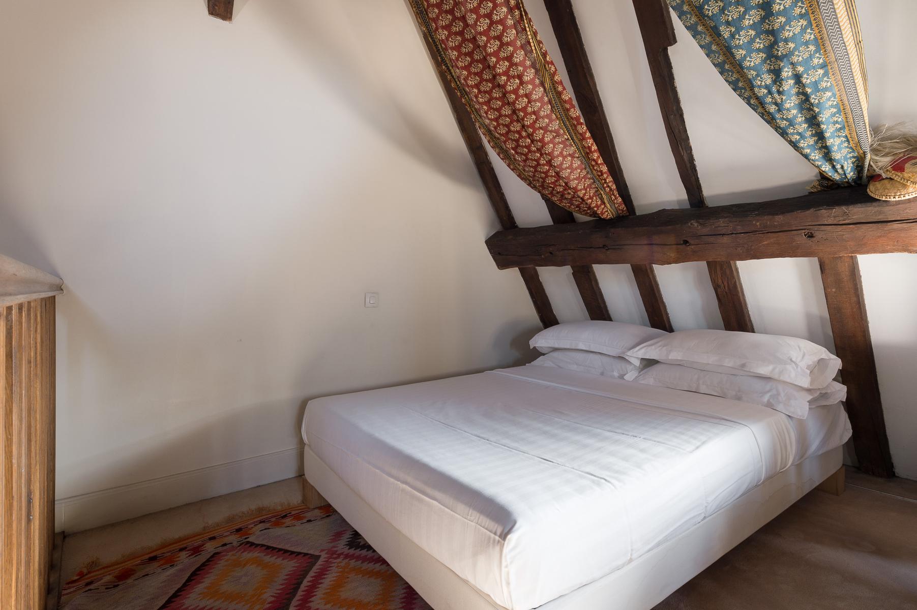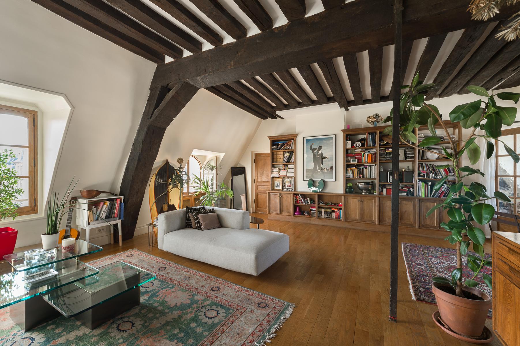 Avec ses poutres sombres et ses vues sur les fontaines et les châtaigniers, la Place des Vosges semble plus provençale que parisienne. En entrant au troisième étage, la salle de bains au sol en terre cuite se trouve à gauche, et tout droit devant vous arriverez au salon. Les plantes en pot complètent un buffet en bois et des poutres brutes, et il y a de la place pour quatre personnes dans la cuisine de style maison de ferme, à gauche.