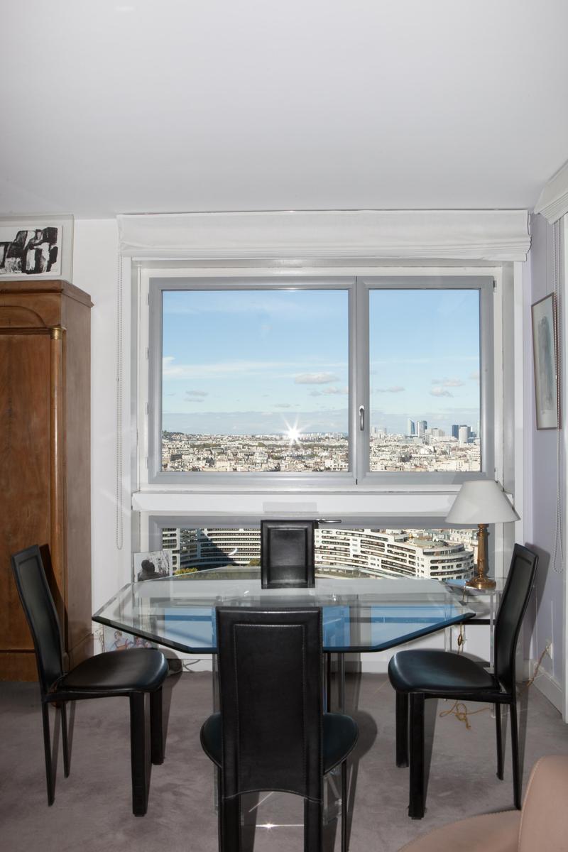 Dans le haut Quai de Grenelle II, l’agitation de la ville semble lointaine. Des teintes douces – jaune dans la chambre des maîtres, bleu ciel dans la salle de bains – ombragent les murs et des meubles raffinés sont disposés dans chaque pièce. Des miroirs ornés et des coffres antiques à une table de salle à manger octogonale en verre, il y a beaucoup de choses à voir à l’intérieur. Mais dehors, il y en a d’autres. Cette maison a une vue enviable à 180 degrés sur Paris : la Tour Eiffel, le Trocadéro et le Sacré-Cœur sont tous en vue. La Tour Eiffel scintille à l’heure tous les soirs et l’appartement offre le meilleur point de vue pour admirer ce spectacle de lumière. Les cafés et boutiques de Beaugrenelle sont à portée de main. 0A