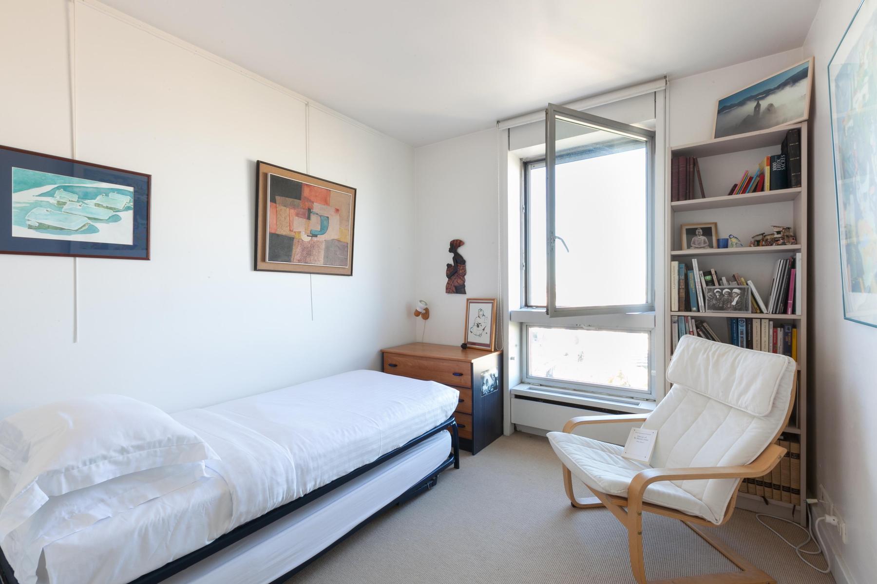 Quai de Grenelle II a une esthétique agréable, avec des tons complémentaires et des meubles élégants. Mais sa caractéristique la plus charmante est sa collection de peintures frappantes. De la table de la cuisine, on peut voir des abstracts brillants, tandis qu’une large pièce paysagère décore le salon, où des sièges de baignoire en cuir taupe se dressent à côté de fauteuils à dossier haut. Et à gauche des deux, vous trouverez le pot-pourri d’œuvres d’art contemporain et traditionnel de la chambre double, et la commode ornée du maître – au-delà des fenêtres orientées vers l’ouest des deux, se trouvent certains des plus hauts grimpeurs de Paris.