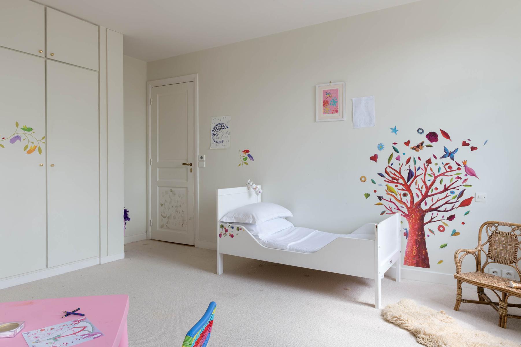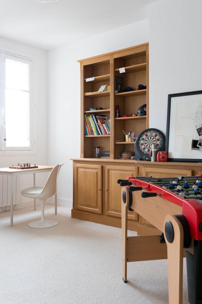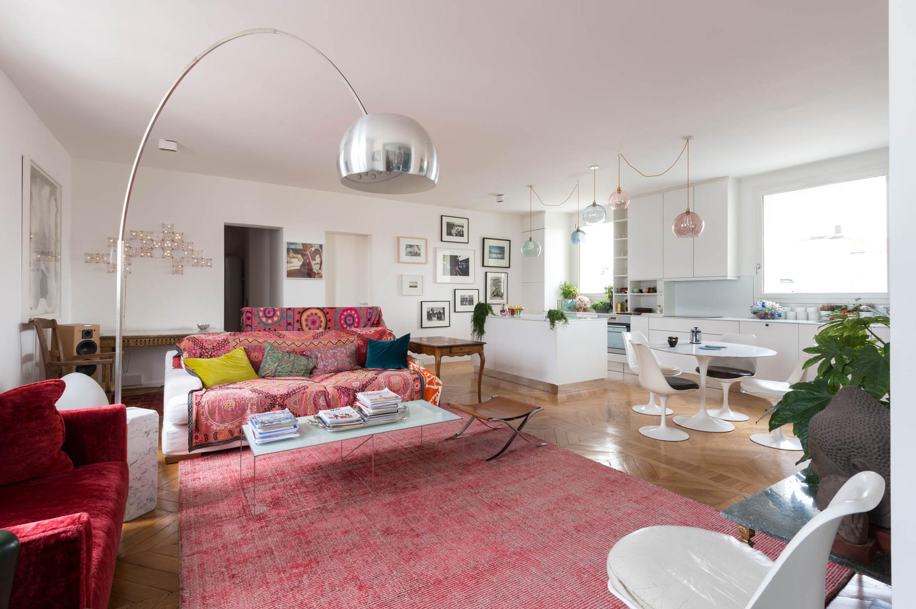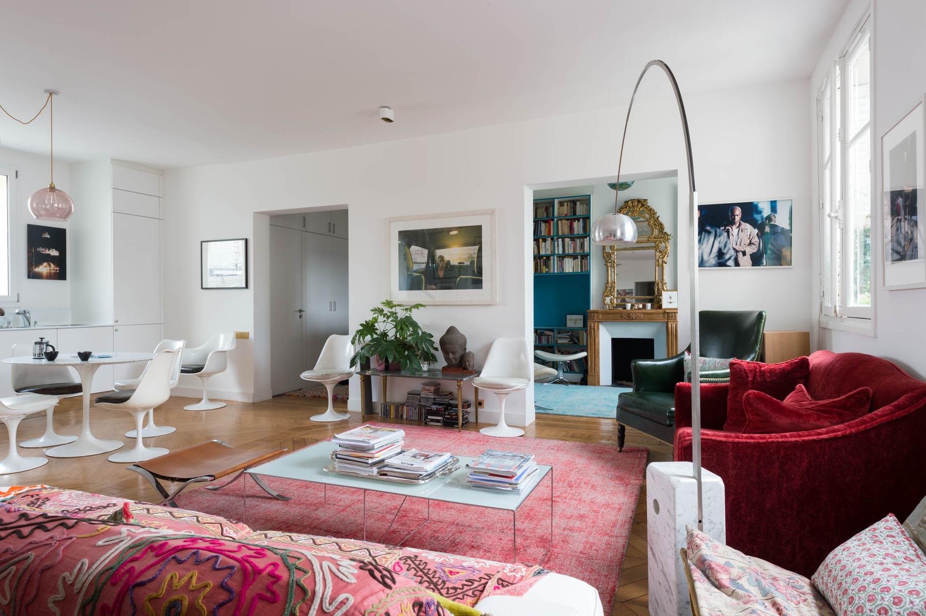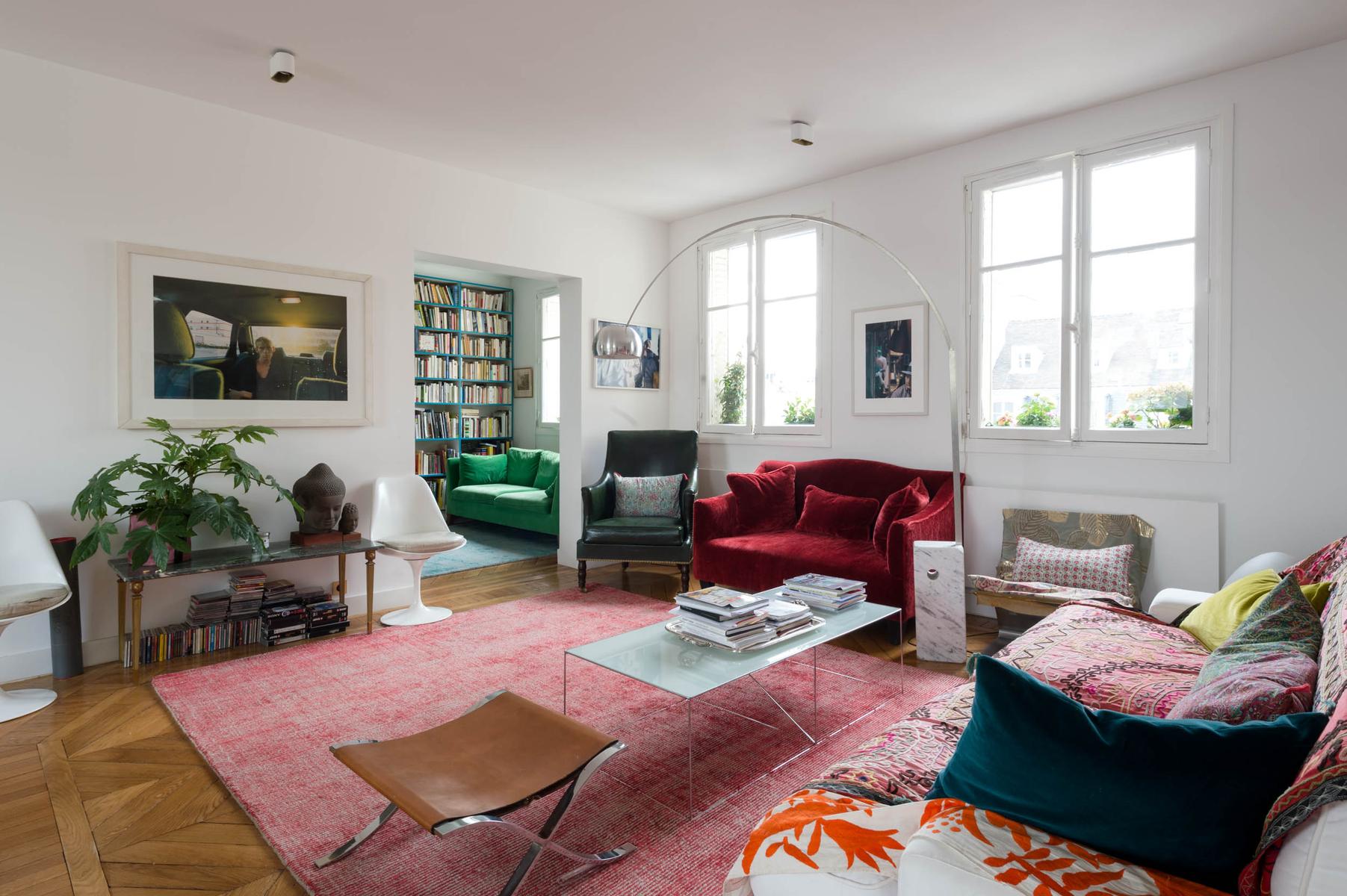Cette maison a toute l’élégance de Saint-Germain-des-Prés, plus un peu de zeste. Le hall d’entrée passe devant un cabinet de toilette et mène directement au salon ouvert. À droite, un coin cuisine blanc élégant avec une table à manger contemporaine et des lampes pastel ombragées. Puis, à gauche, un coin salon aux couleurs contrastées, où des canapés et des fauteuils au rembourrage brillant sont posés sur un tapis rose pâle. Par la porte, vous trouverez ici le deuxième salon – encore plus richement décoré en turquoise et vert, avec une cheminée ornementale classique et des murs tapissés de livres.