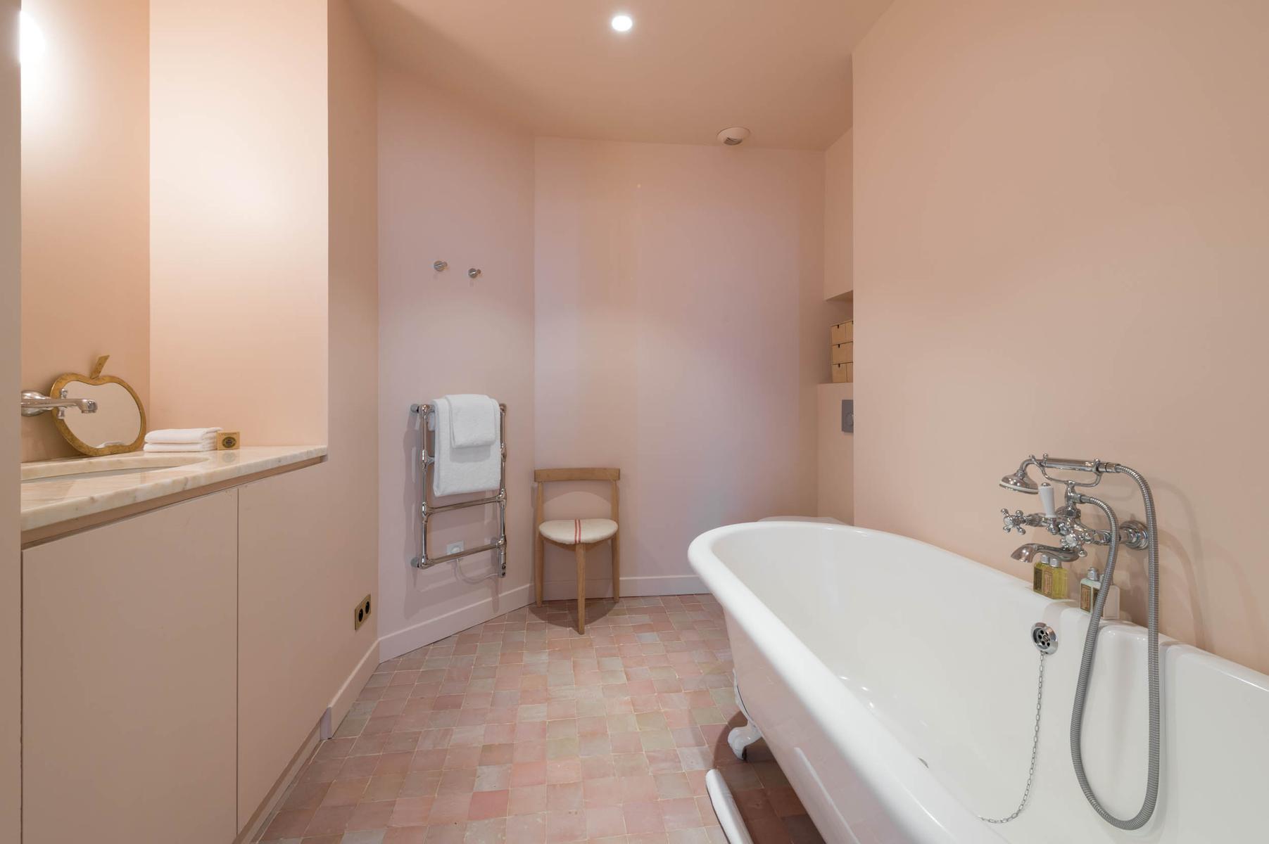 A l’extrême droite du salon, une porte s’ouvre sur la chambre principale. Elle est peinte en blanc et parquetée, agrémentée d’antiquités et d’œuvres d’art insolites, ainsi que d’une suite peinte en rose. Enfin, vous trouverez la salle de bain principale et trois autres chambres à coucher de caractère, la dernière avec une salle de bain aux carreaux jaunes.