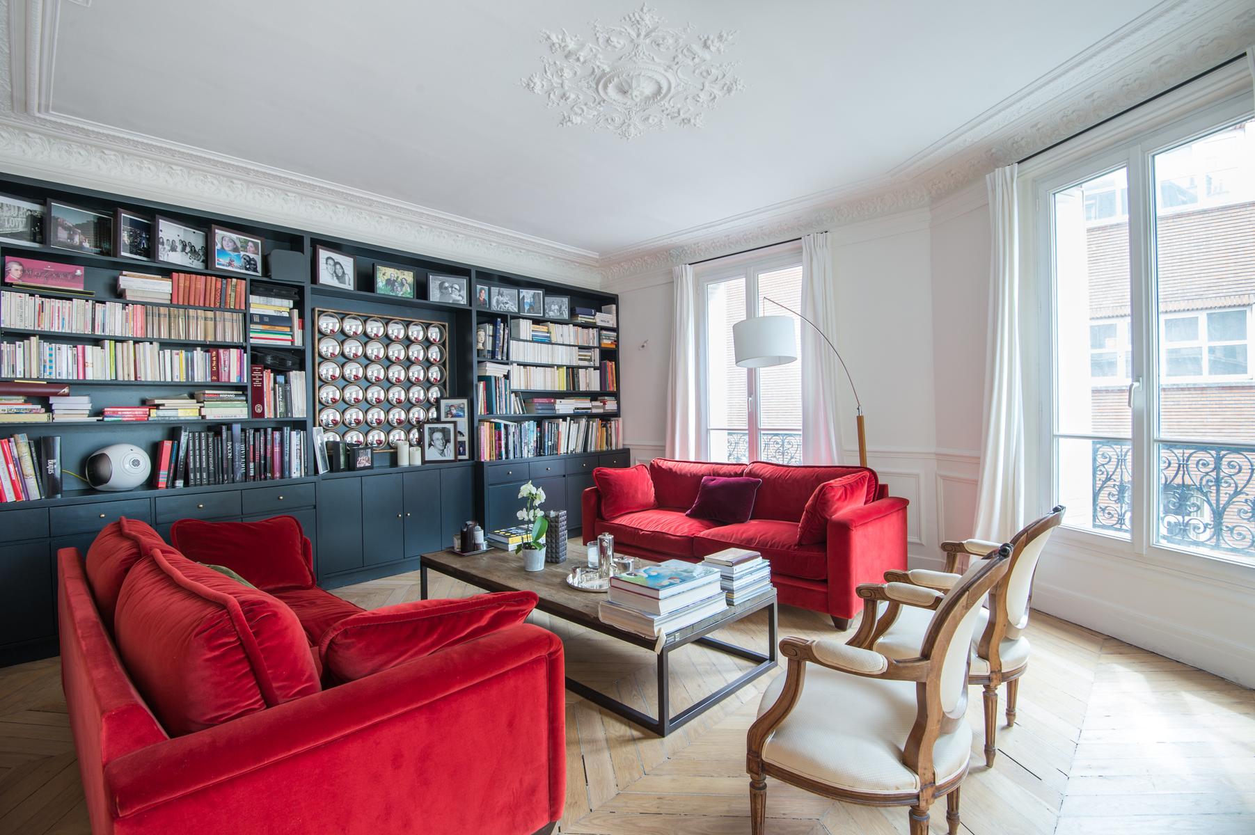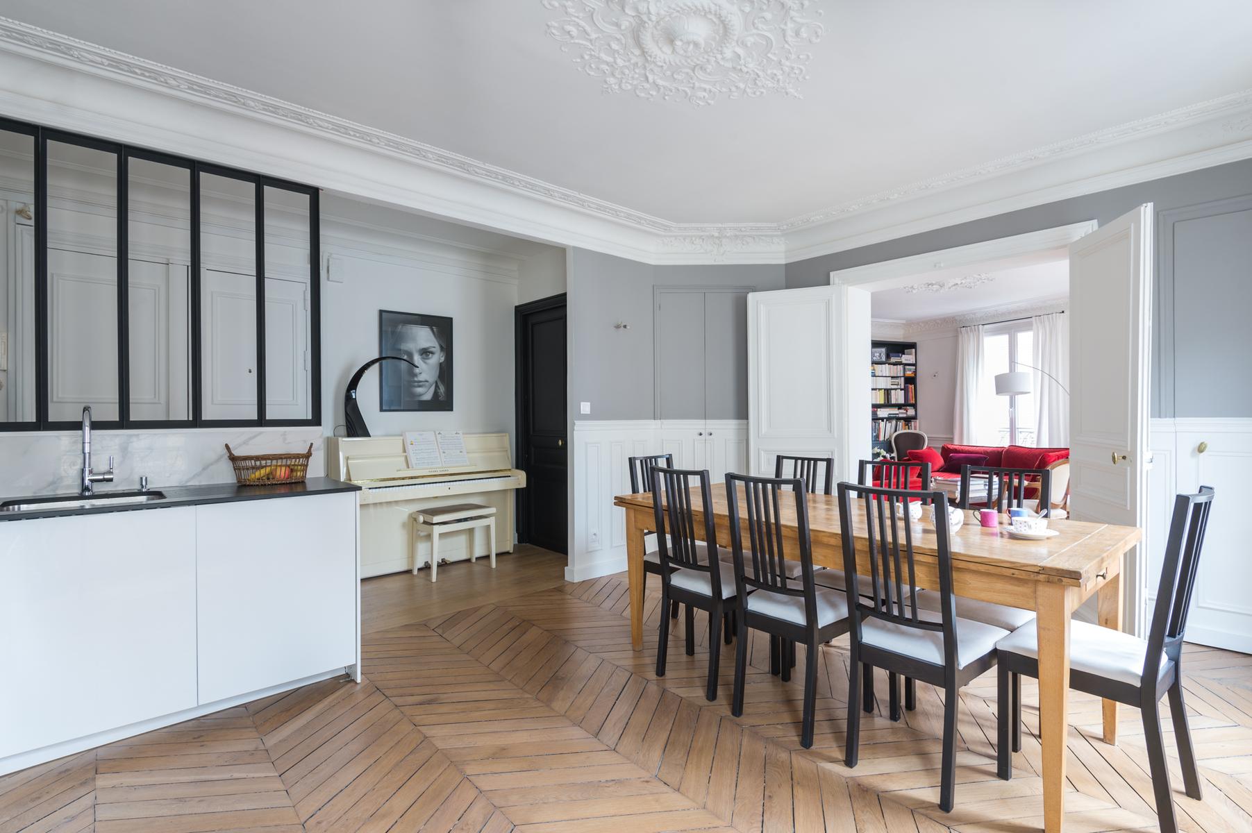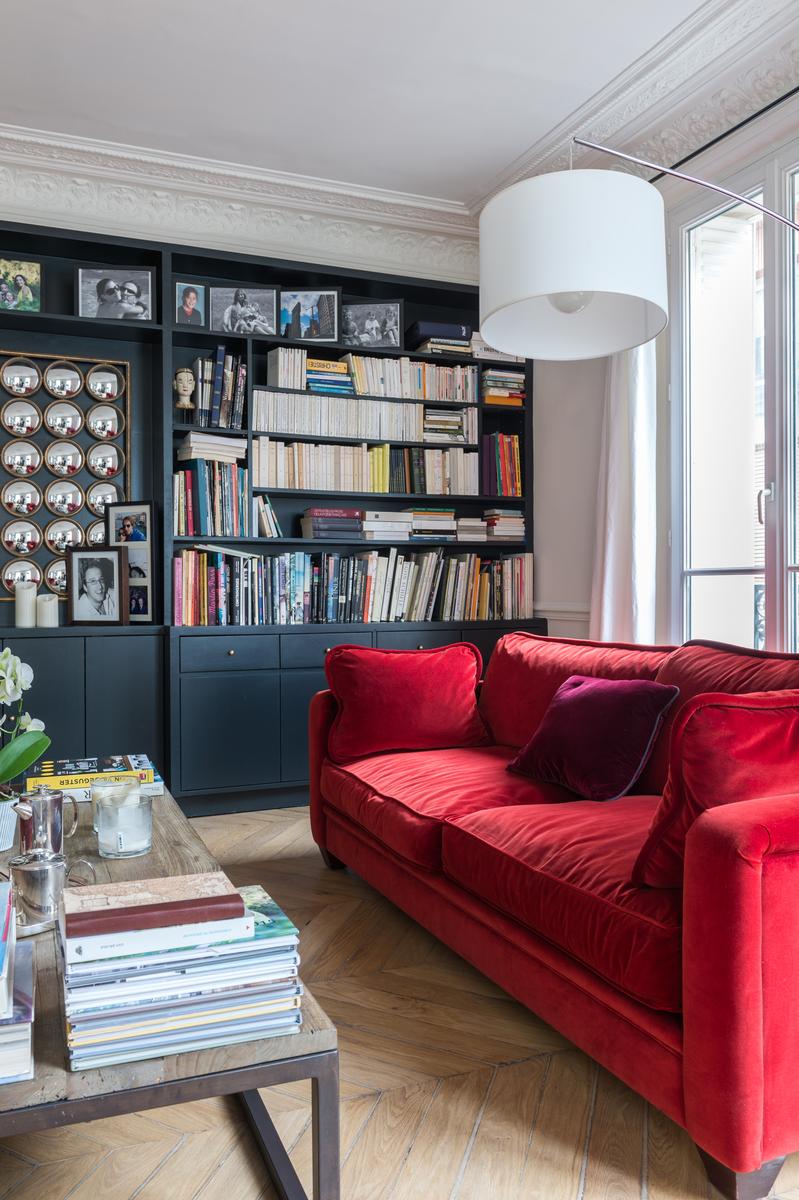 Dans un grand bâtiment haussmannien, la rue Bayre va de l’ancien au nouveau et vice versa. En entrant dans la cuisine, vous trouverez du cornique d’époque au plafond et un parquet contemporain. Huit personnes peuvent s’asseoir à la table à manger – en face d’un grand dosseret en marbre – et à gauche, il y a des meubles traditionnels et une bibliothèque moderne dans le salon. Une rangée de portes-fenêtres donne sur des balustrades en fer forgé, tandis que les deux canapés en velours rouge attirent aussi l’attention.