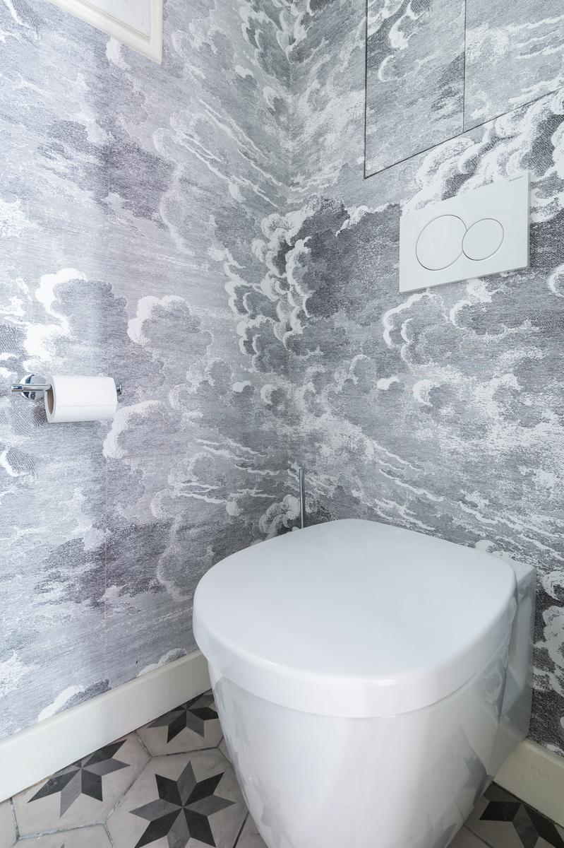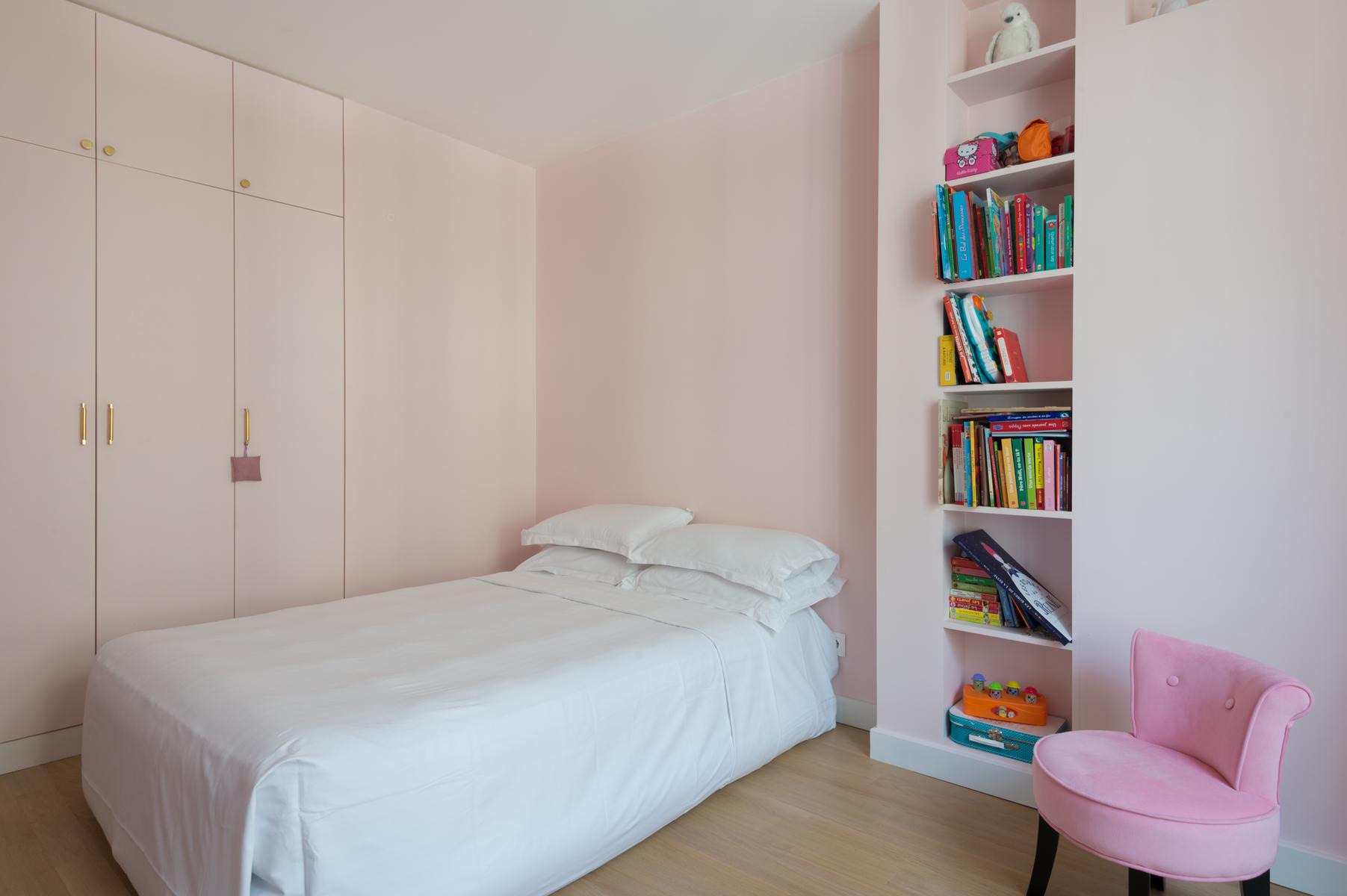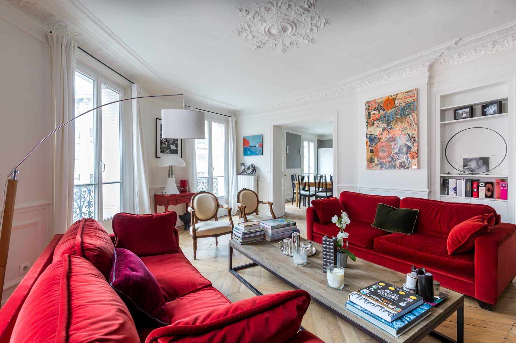 Dans un grand bâtiment haussmannien, la rue Bayre va de l’ancien au nouveau et vice versa. En entrant dans la cuisine, vous trouverez du cornique d’époque au plafond et un parquet contemporain. Huit personnes peuvent s’asseoir à la table à manger – en face d’un grand dosseret en marbre – et à gauche, il y a des meubles traditionnels et une bibliothèque moderne dans le salon. Une rangée de portes-fenêtres donne sur des balustrades en fer forgé, tandis que les deux canapés en velours rouge attirent aussi l’attention.