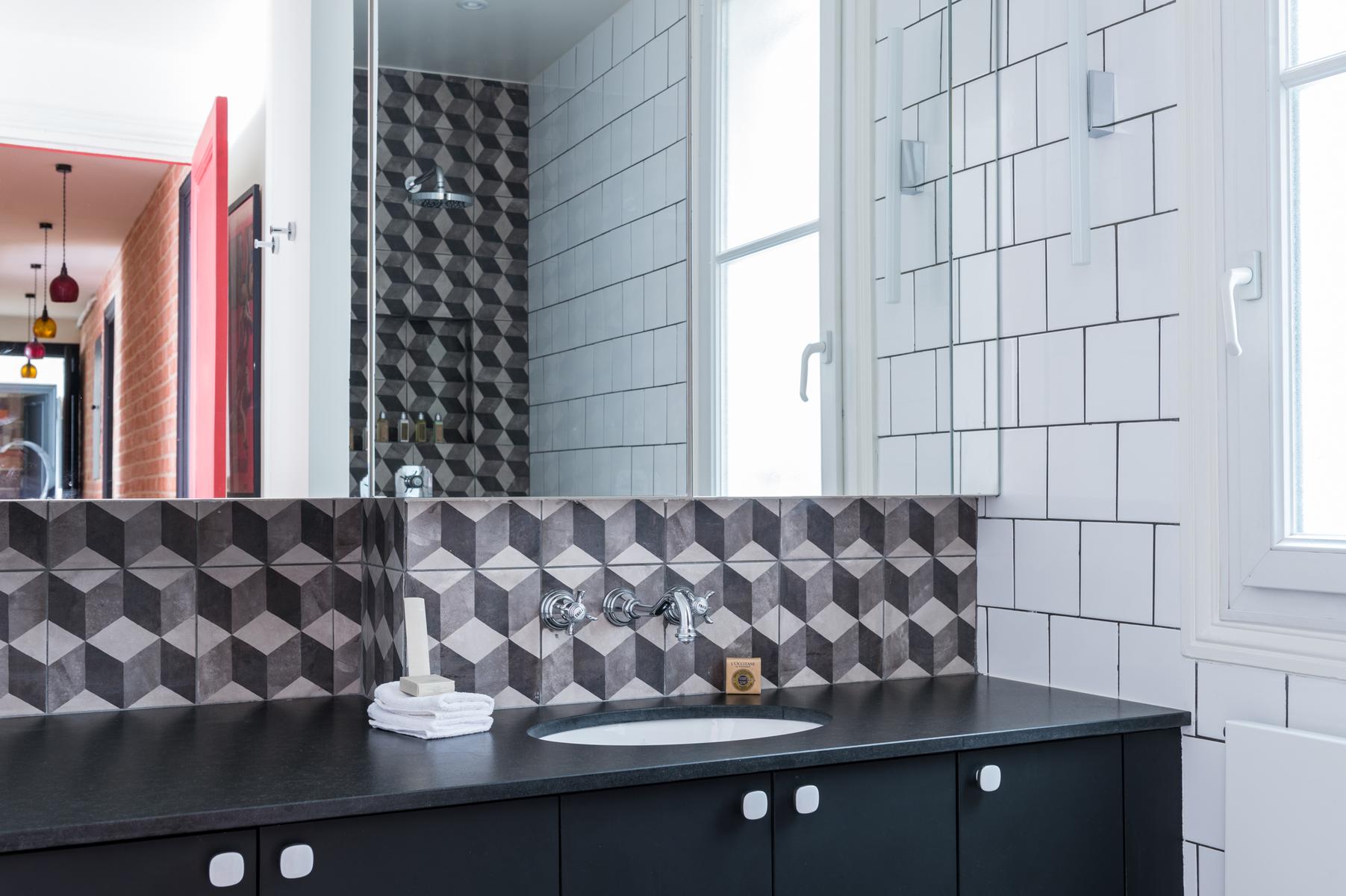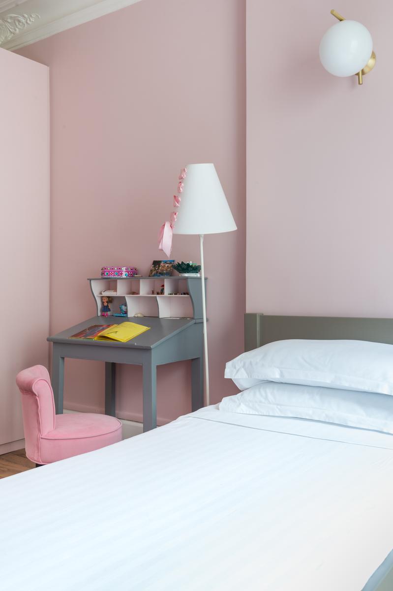 En allant à droite à l’entrée, vous trouverez un couloir bordé de briques nues. La salle de bains en carrelage blanc est à droite, et il y a un soupçon de rose dans la troisième chambre à coucher, à gauche. À côté, la deuxième chambre à coucher (avec un lit simple) est encore plus rose, et il y a un lit queen-size et un mur gris audacieux dans la chambre principale, au-delà. Au bout du couloir, la salle d’eau a des carreaux d’accent géométrique.