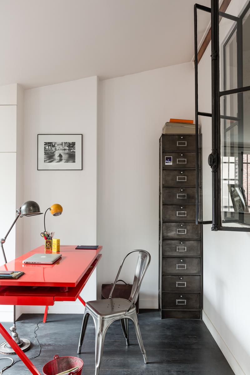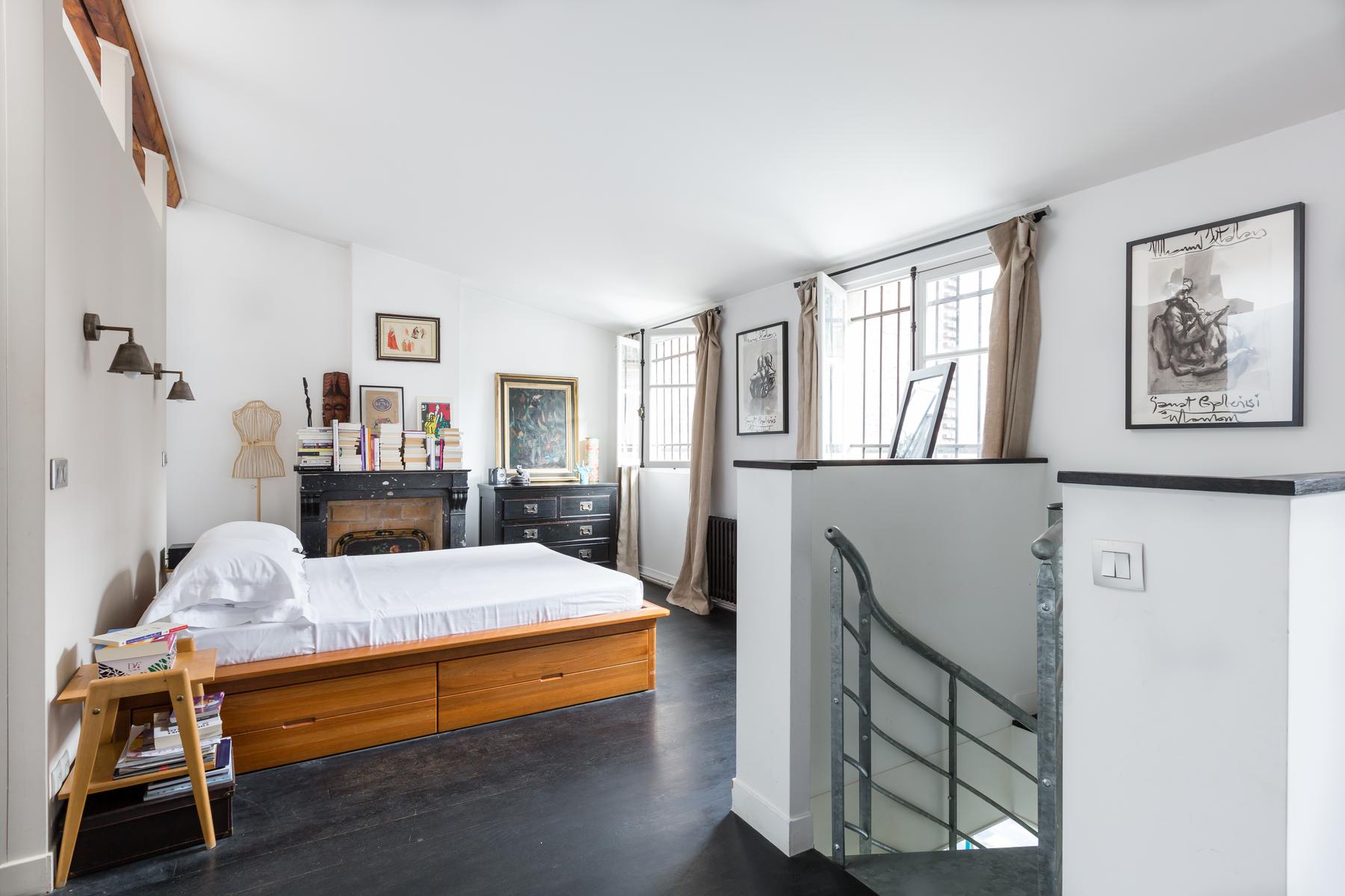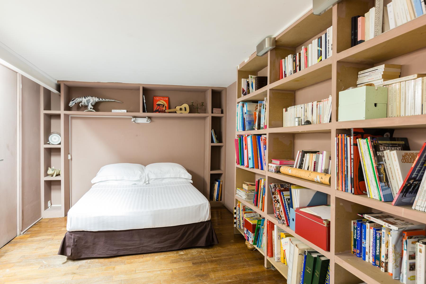 En haut de l’escalier, vous trouverez la suite des maîtres, un lieu d’art avec des marches menant à la deuxième terrasse de cette maison avec vue sur les Batignolles. Il y a aussi un sous-sol, en bas de l’escalier de la cuisine, où il y a une chambre double moelleuse et des étagères de livres.