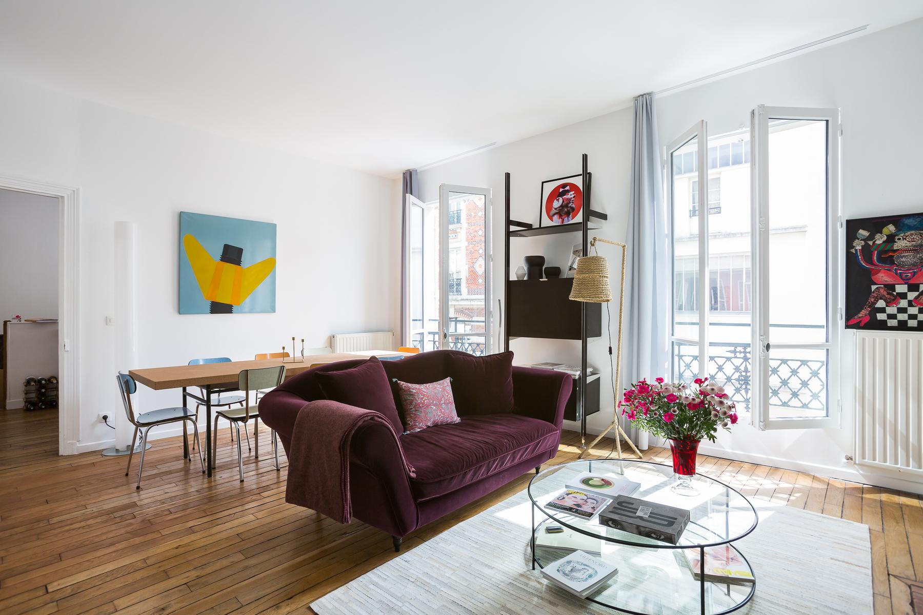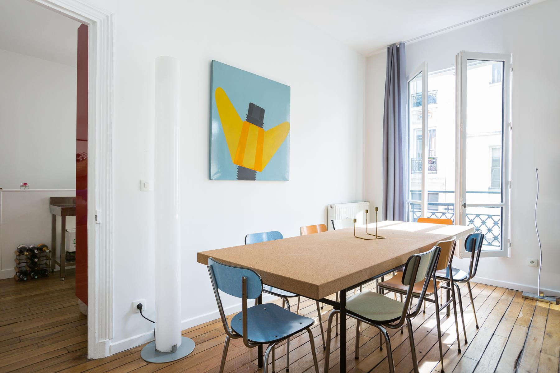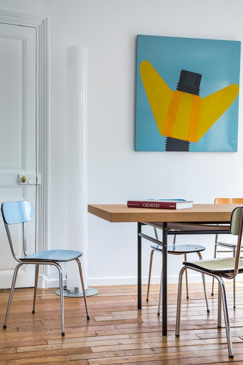 Située dans un bâtiment qui remonte à l’Exposition Universelle de 1900, la rue Boissonade est fraîche et colorée. À l’intérieur, la cuisine est équipée de planchers en bois et d’armoires laquées cramoisi. A droite, vous trouverez une table rétro pour huit personnes dans le salon, et juste au-delà, un canapé en velours surplombé par l’art moderne.