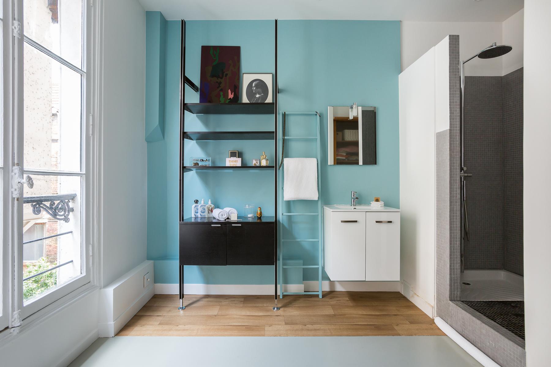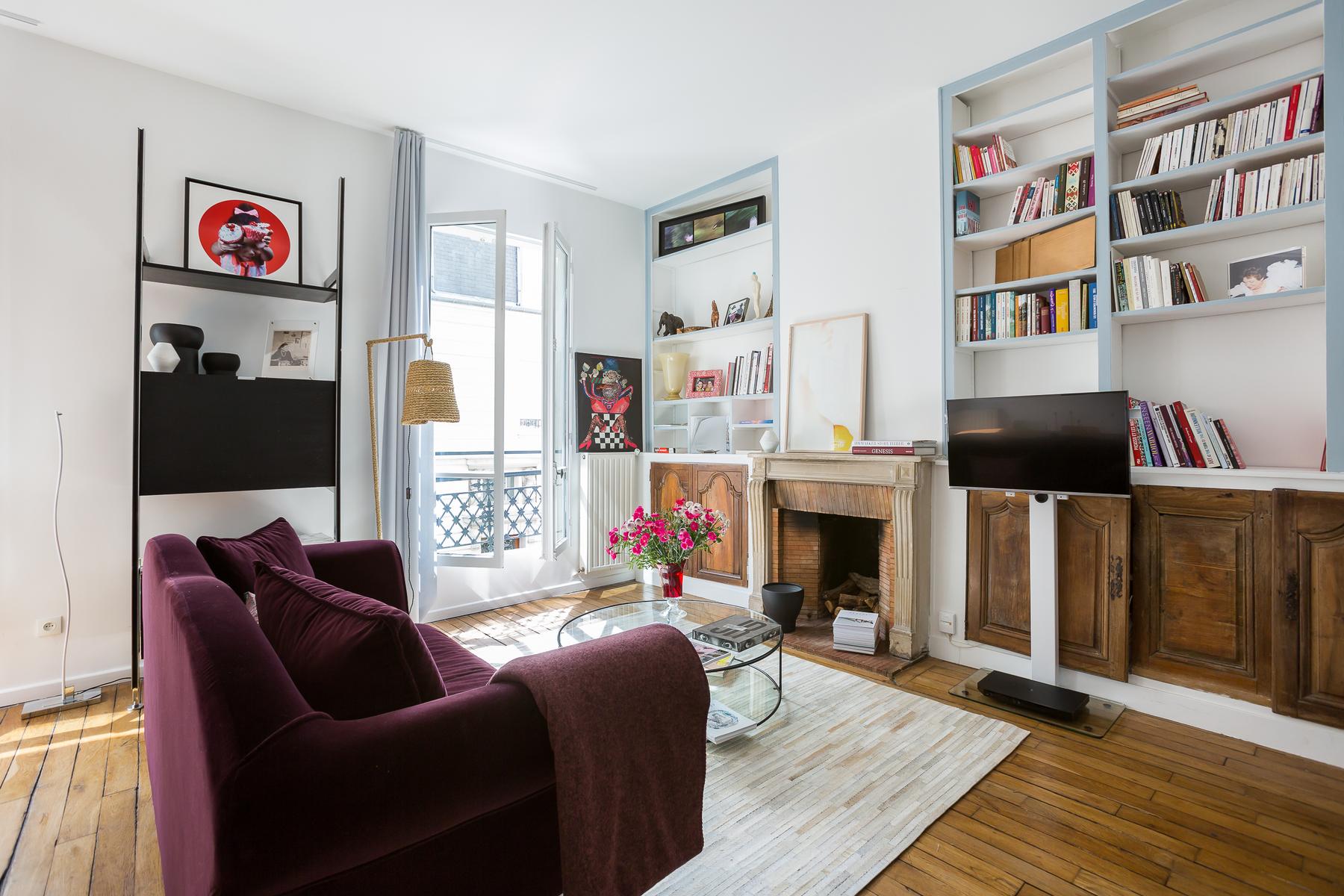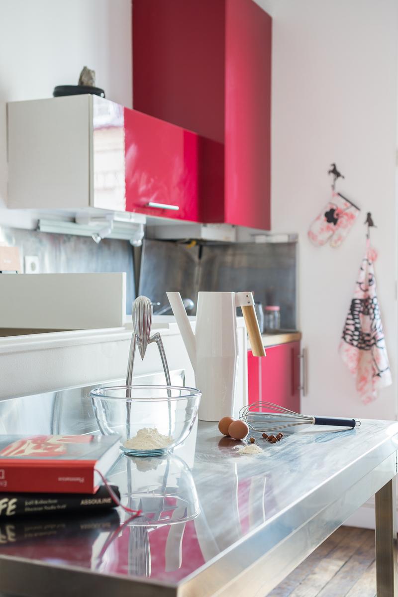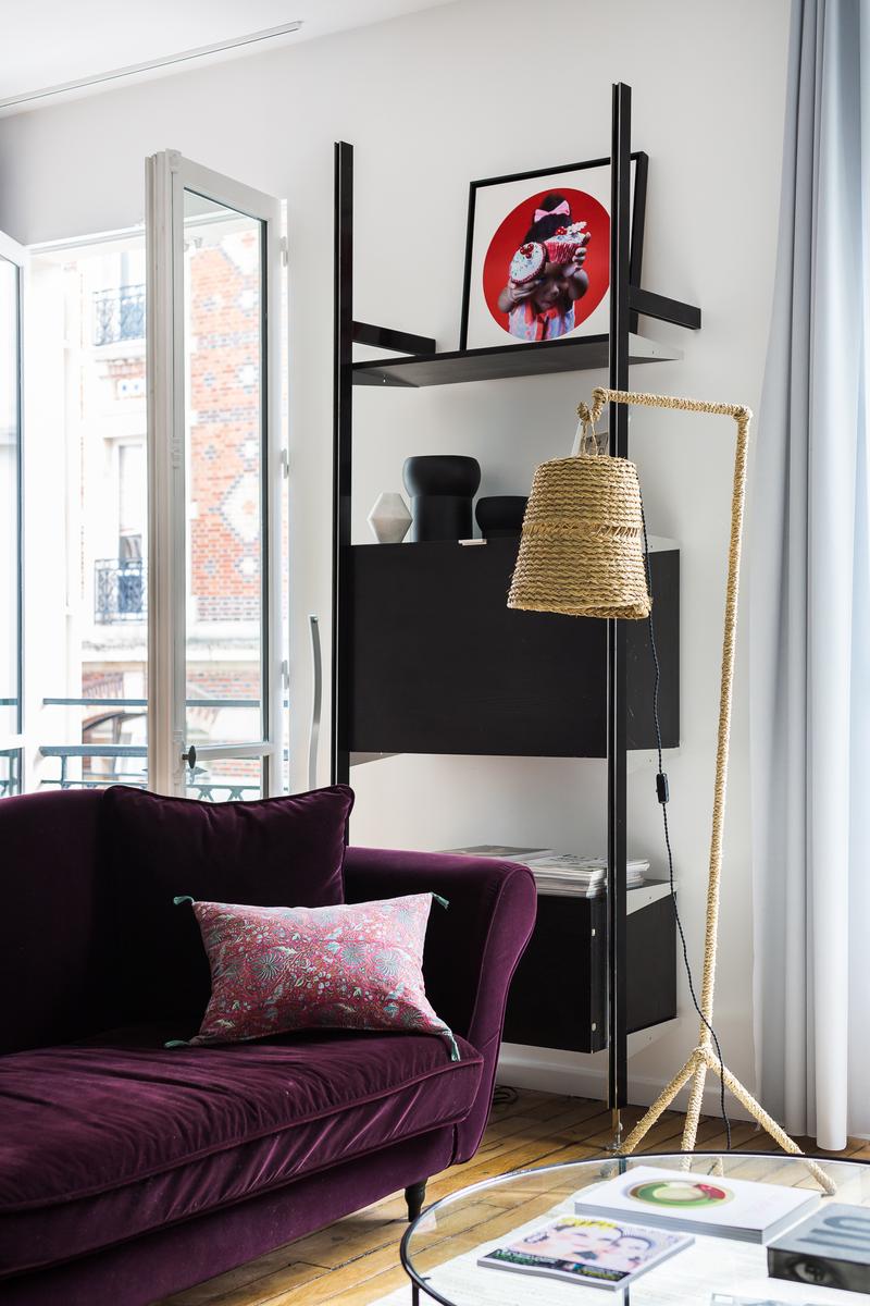 Située dans un bâtiment qui remonte à l’Exposition Universelle de 1900, la rue Boissonade est fraîche et colorée. À l’intérieur, la cuisine est équipée de planchers en bois et d’armoires laquées cramoisi. A droite, vous trouverez une table rétro pour huit personnes dans le salon, et juste au-delà, un canapé en velours surplombé par l’art moderne.