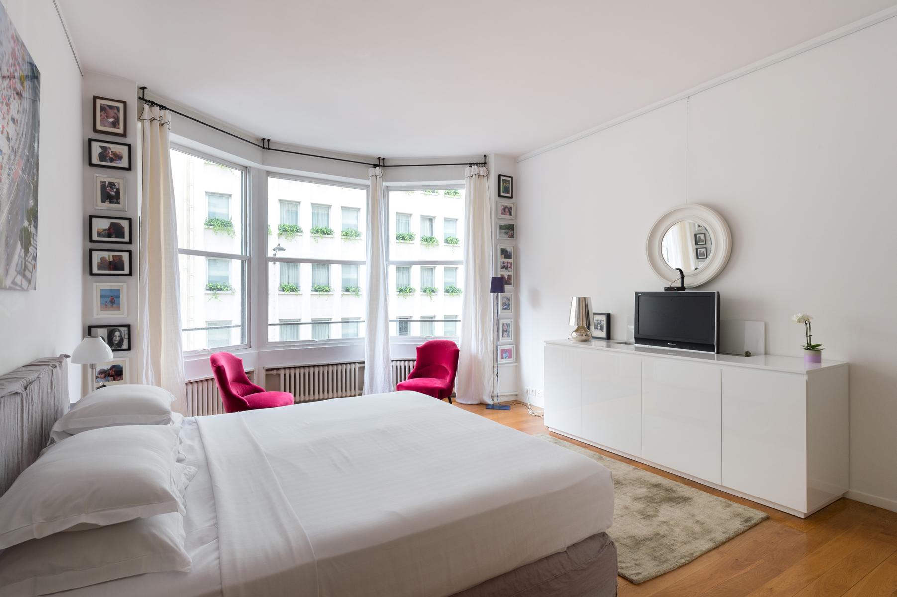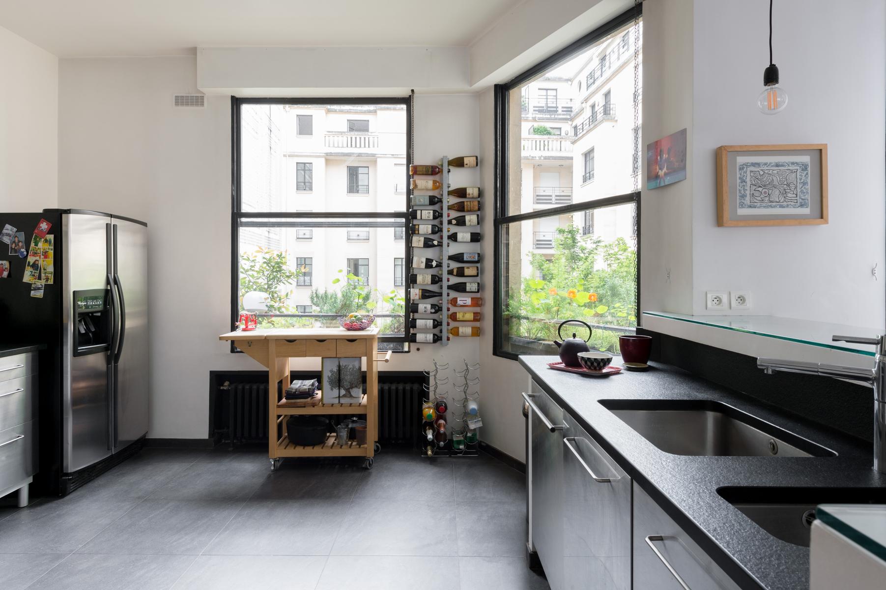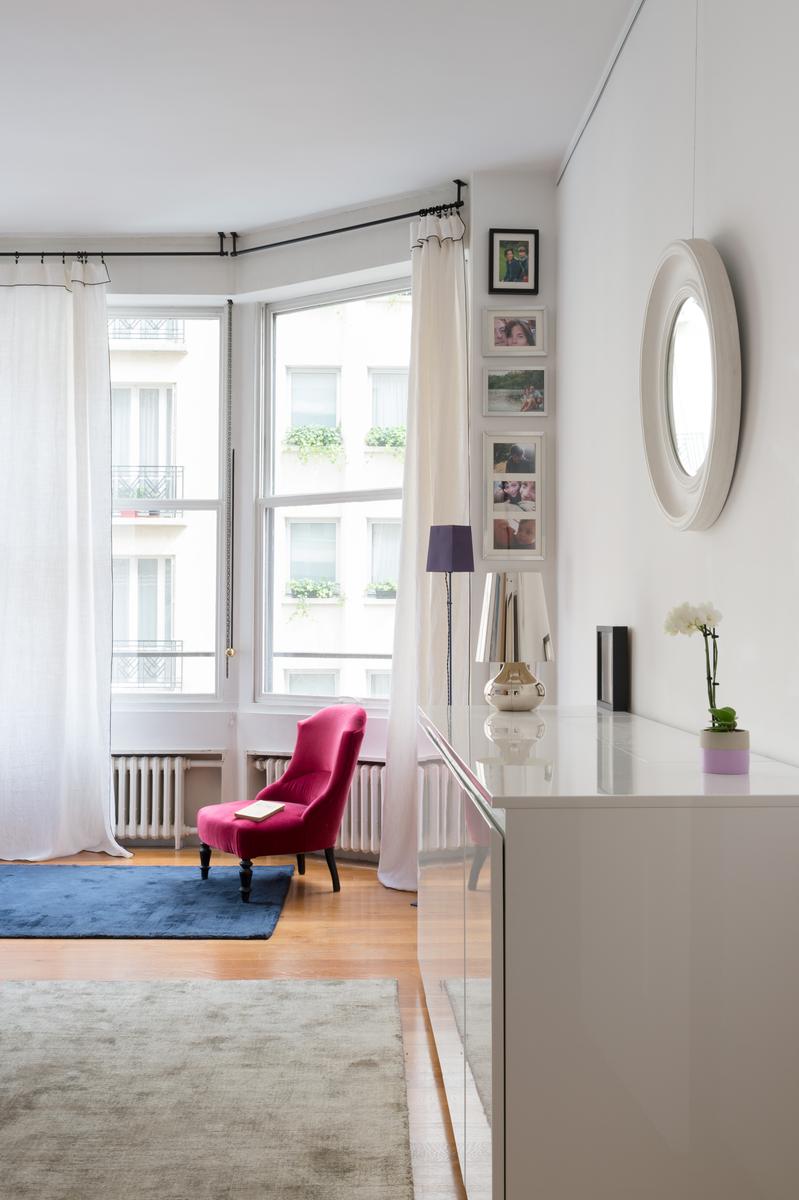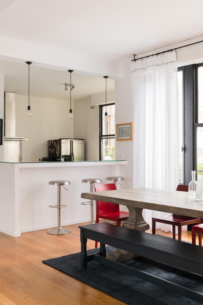 Cette maison au bord de la Seine a l’air décontracté. Vous entrez dans un couloir, où vous trouverez la chambre principale sur la gauche. Elle dispose d’un lit king size (sur lequel est suspendue une toile de bord de mer), de deux fauteuils roses et d’une salle de bain super-style. Ensuite, tout droit devant la porte, se trouve un confortable coin bibliothèque qui s’ouvre sur le salon. À l’extrémité proche, des canapés et des fauteuils discrets sont entourés d’œuvres d’art absorbantes. Il y a aussi une table à manger antique à côté des fenêtres, avec des chaises et des bancs colorés. Dans le coin le plus éloigné, vous apercevrez la cuisine attenante, avec son bar à déjeuner vitré et ses armoires argentées aux lignes épurées.