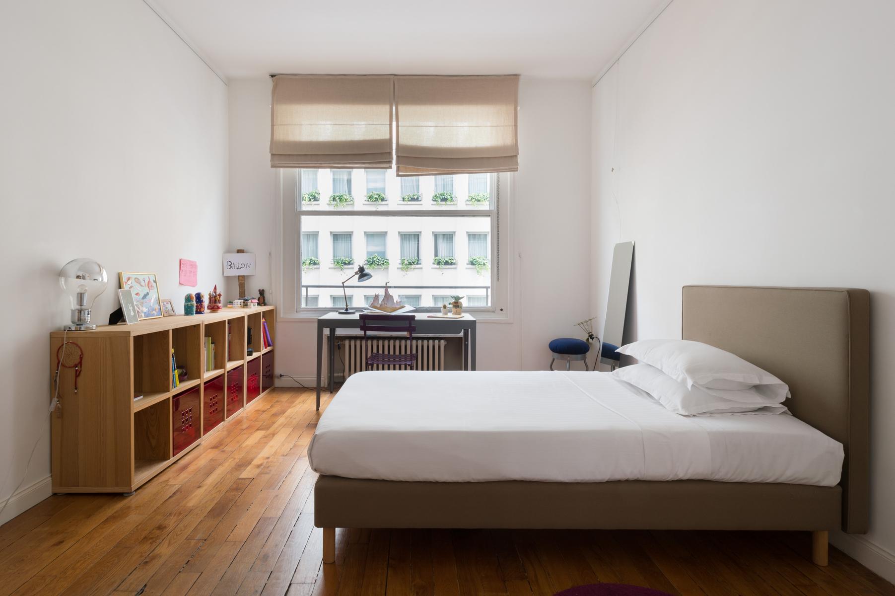 Juste au-delà, un couloir mène à la deuxième chambre à coucher – peinte en blanc et plancher de bois, avec un lit double et un lit simple taupe. Ensuite se trouve la troisième chambre à coucher, plus ludique, avec une paire de lits simples, une baie vitrée et un bureau fait de deux établis. Après cette pièce, vous trouverez une salle de bain gris et blanc. Enfin, vous arriverez à la quatrième chambre à coucher, un espace simple avec des murs blancs et un lit simple.