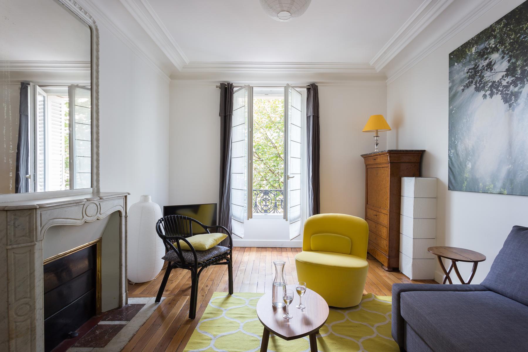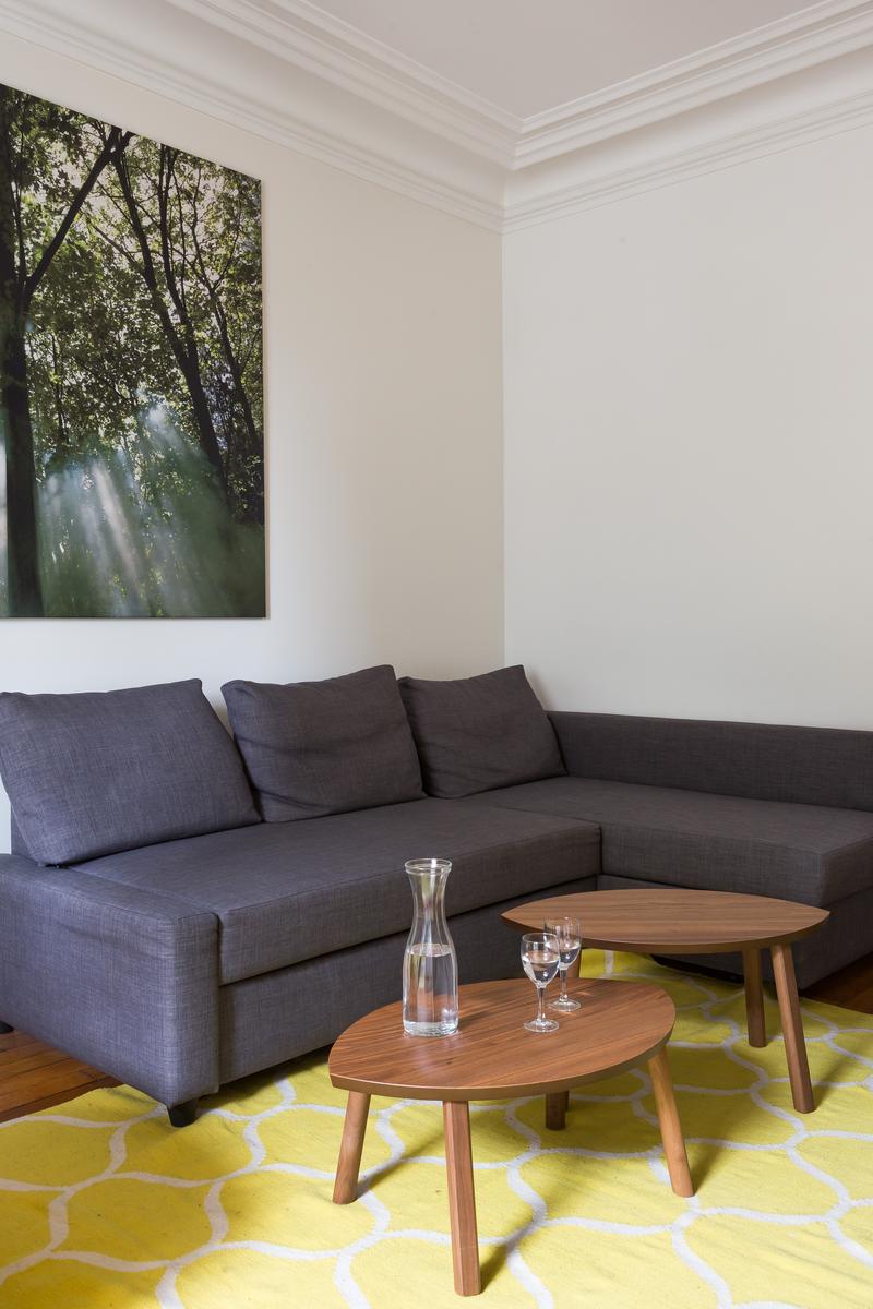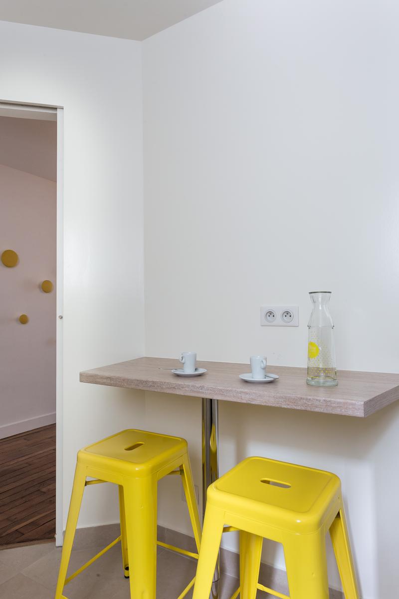 Des pops de couleurs vives et des pièces modernes rendent cette maison par ailleurs classique aussi vivante que le Louvre – Opéra lui-même. Vous entrez dans un couloir, où vous trouverez la cuisine immédiatement à droite. Il est doté d’armoires blanches, de comptoirs en bois blond et d’un bar à déjeuner assorti, le tout agrémenté de deux tabourets jaune vif. Le salon est directement en face – une pièce au sol en bois peint en blanc avec une cheminée décorative pour une pièce maîtresse. Il dispose d’un canapé et de deux fauteuils élégants, qui se tiennent sur un tapis vert chaux et sous une œuvre d’art frappante.