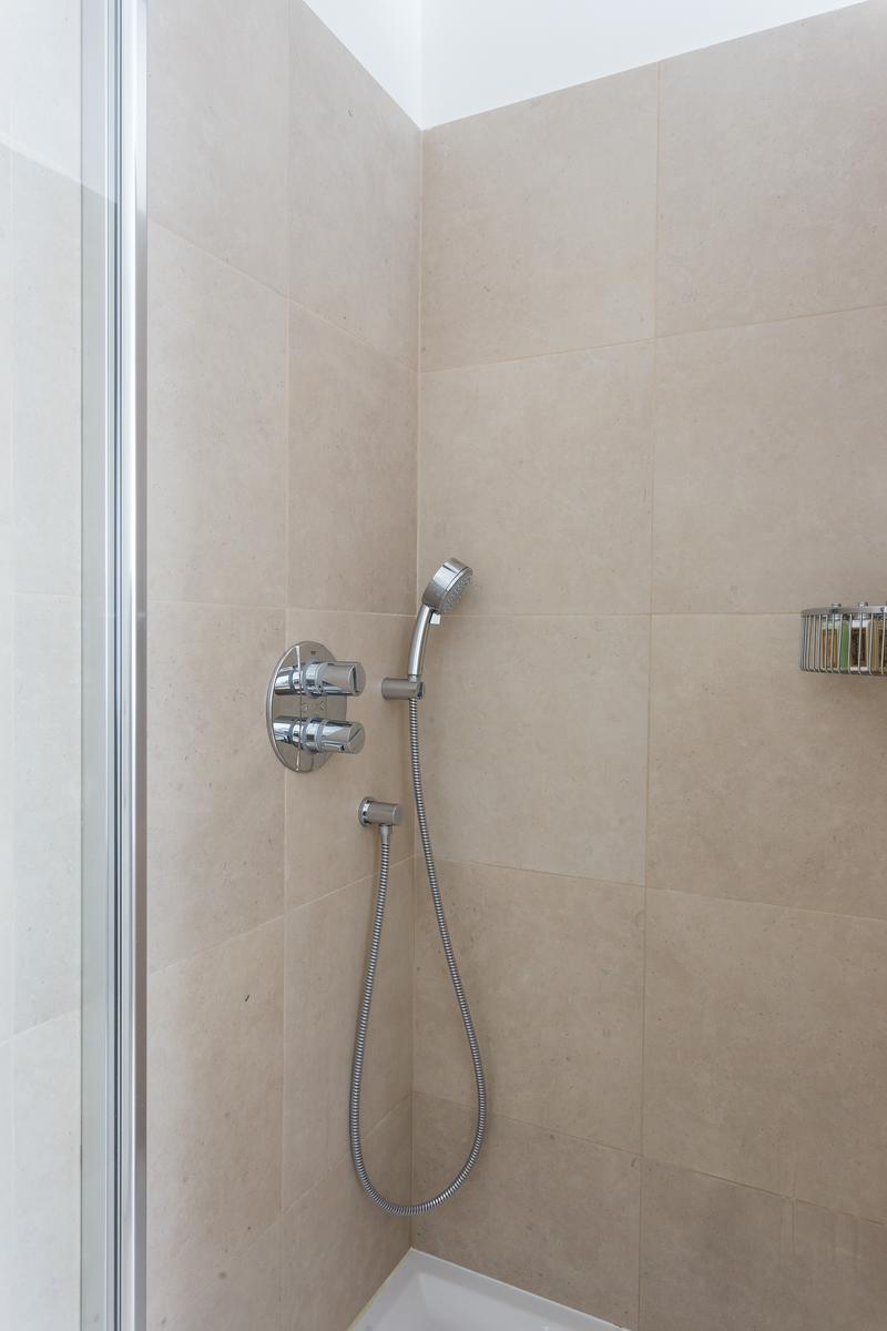 Un peu plus loin dans le couloir, vous trouverez une salle de toilettes et une salle de bains aux couleurs douces. Et puis à gauche, par la dernière porte, il y a la chambre principale. C’est un espace simple, avec quelques accessoires vifs et un paysage urbain en noir et blanc qui se trouve au-dessus du grand lit.