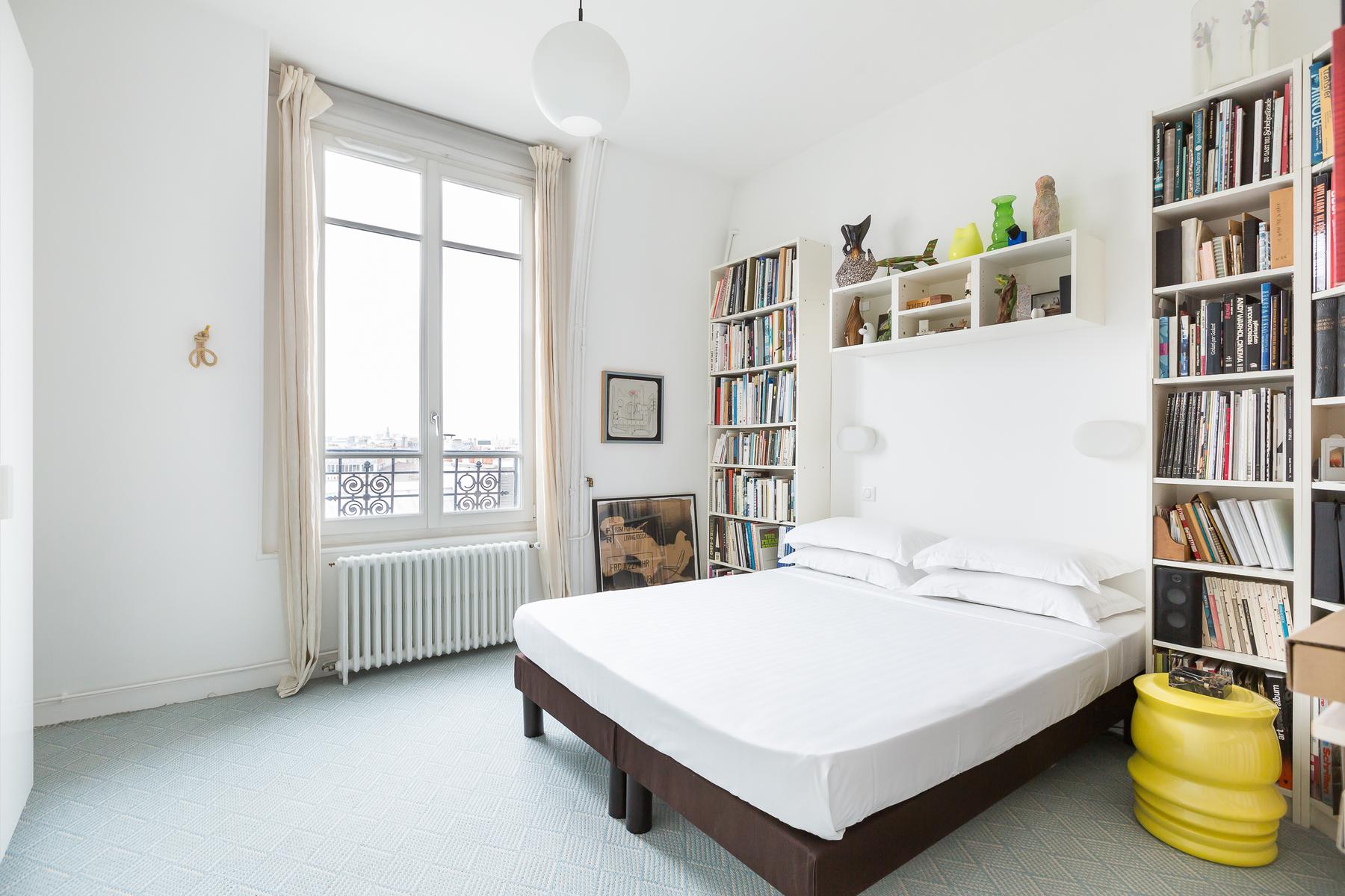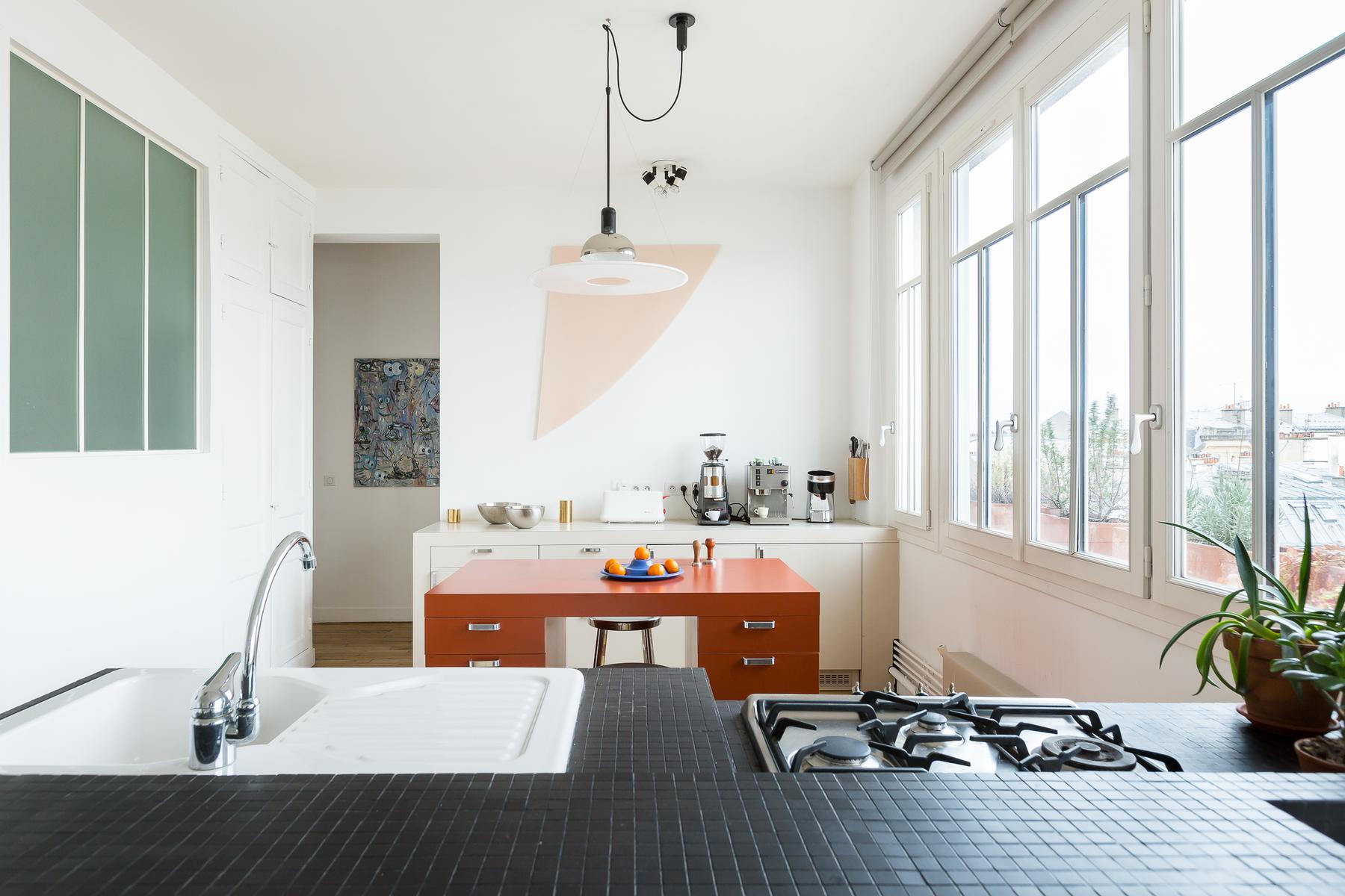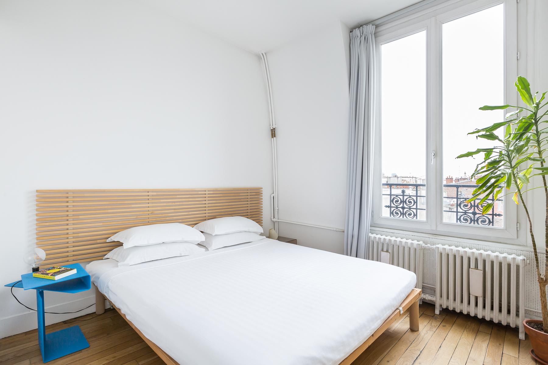 Rue de Bretagne II est un appartement de deux chambres à coucher, une salle de bain au Marais. De grandes fenêtres avec vue sur les toits parisiens s’étendent le long de la cuisine ouverte et du salon, où il y a un canapé en cuir noir, des œuvres d’art contemporain et une table à manger de sept places. Dans la chambre principale, il y a un lit king et de grandes fenêtres et la deuxième chambre a un lit double flanqué d’étagères bien empilées. La salle de bains est équipée d’une douche intégrée et d’une salle de toilette séparée. Au cœur du quartier juif historique, cette maison est proche des stands delis et falafel, ainsi que du plus ancien marché couvert de Paris. Des boutiques de mode vintage et haut de gamme sont également à proximité. Le 2ème arrondissement, qui abrite l’Opéra de Paris doré et le quartier japonais animé, est à l’est et une marche rapide vers le sud vous emmène sur les rives paisibles de la Seine. La station de métro Filles du Calvaire est à environ cinq minutes à pied.