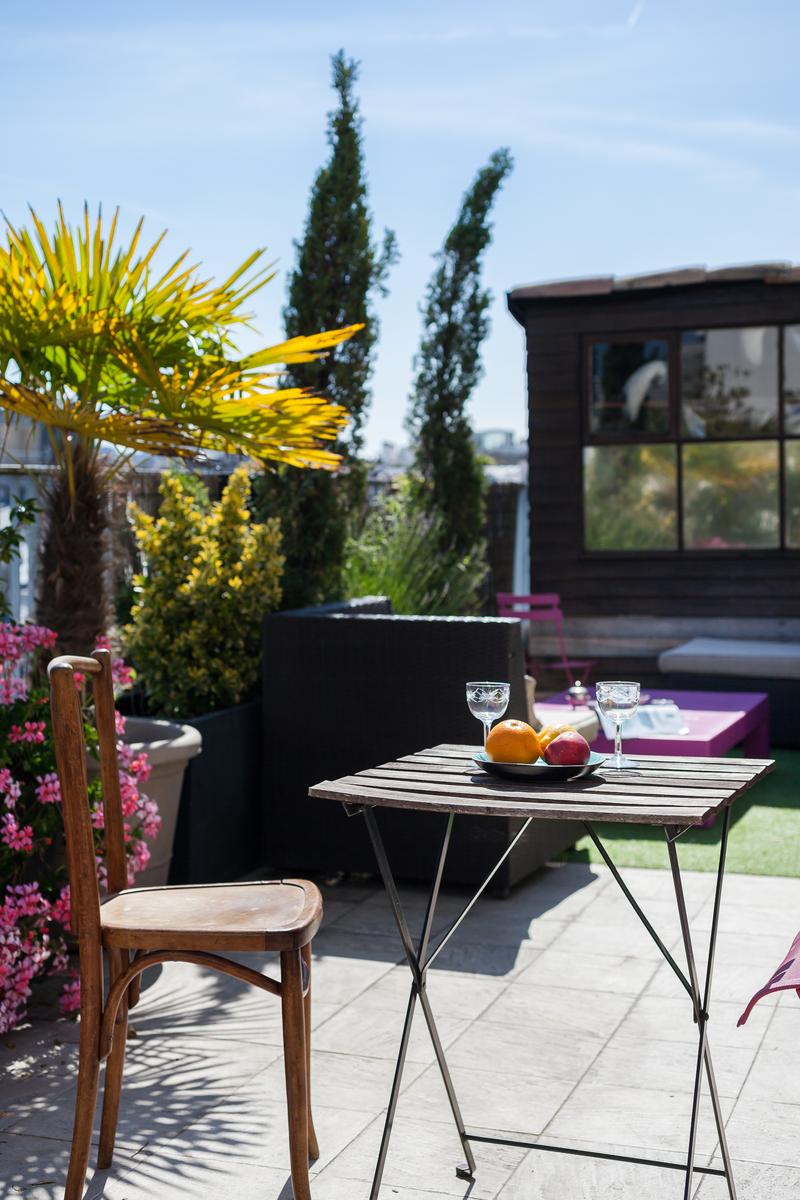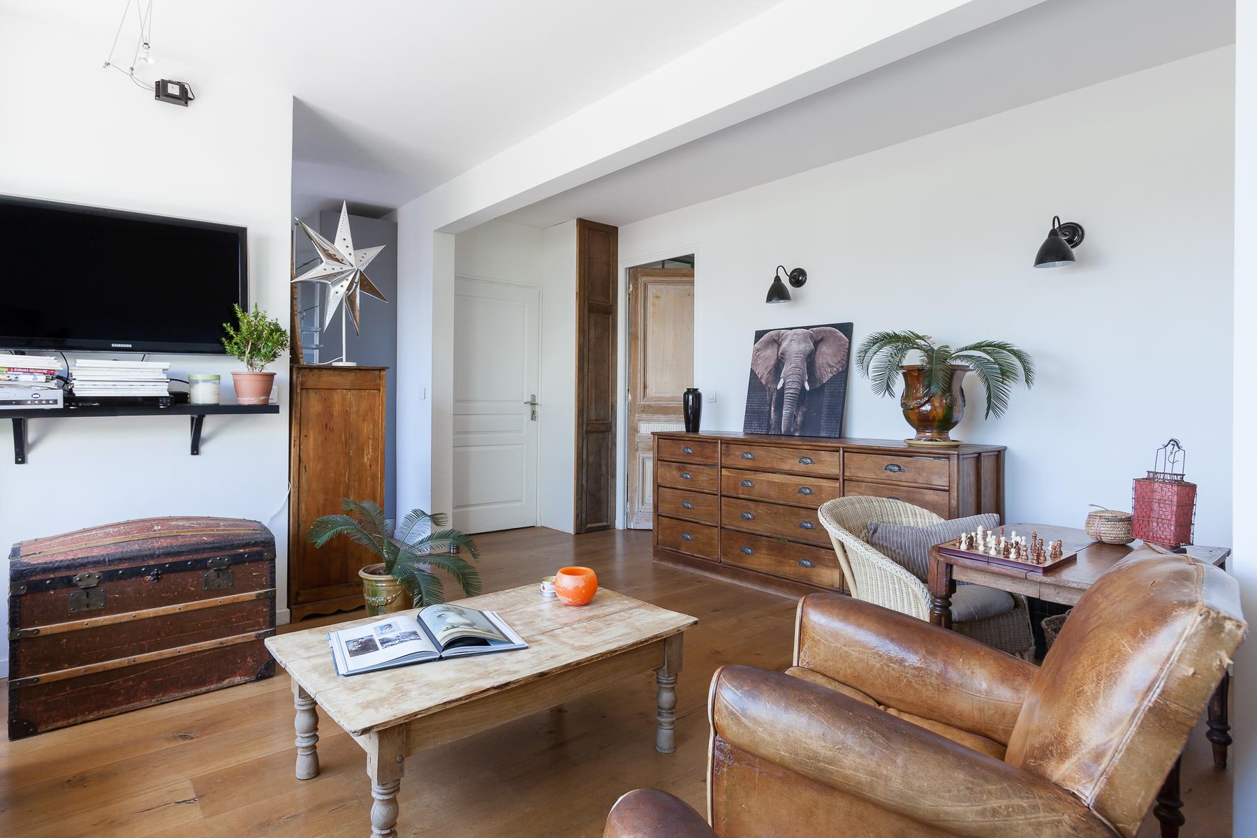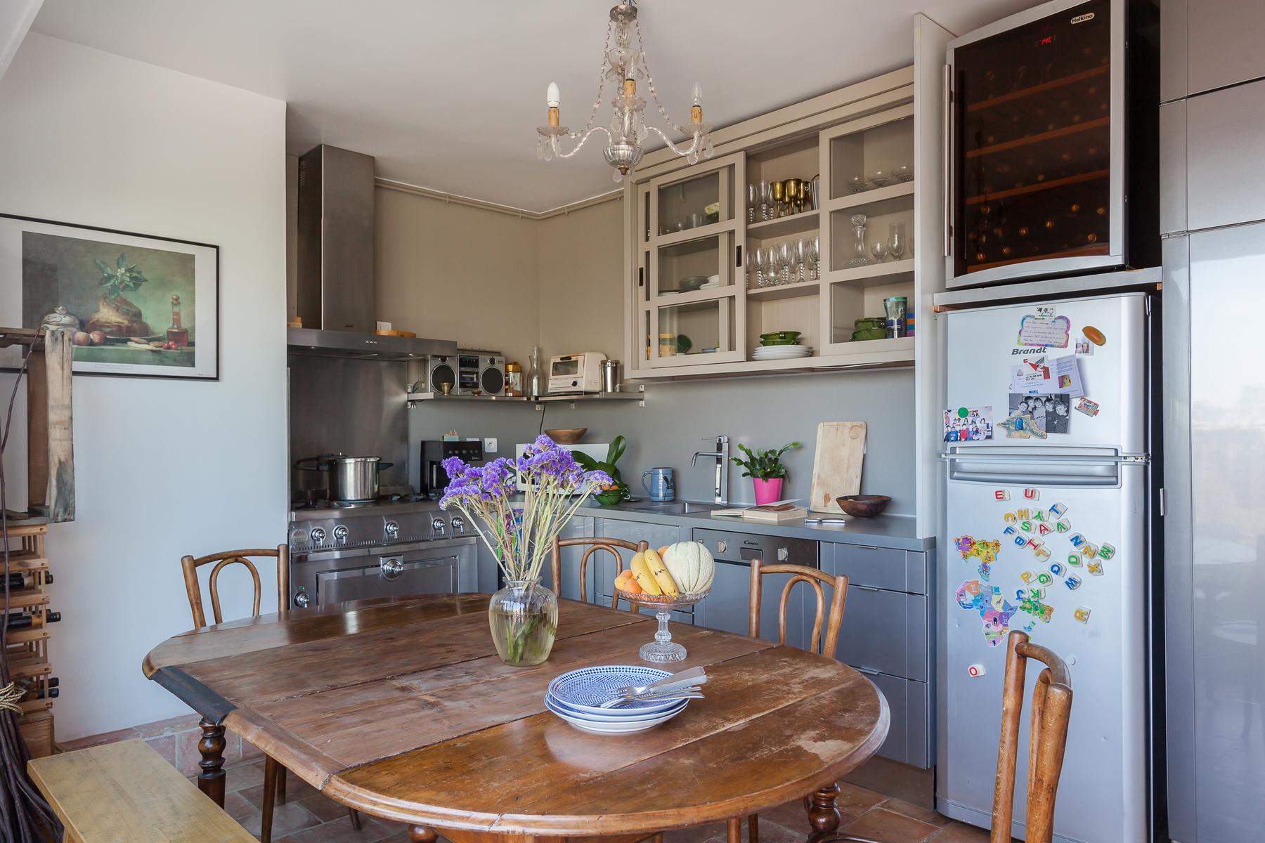 La rue de la Convention II est située à huit étages au-dessus de Vaugirard. Vous entrez dans un couloir, au bout duquel se trouve le salon. Des antiquités de caractère (nous avons trouvé le coffre en bois particulièrement charmant), des fauteuils en cuir adouci et des tapis et coussins en fourrure donnent à cette chambre une atmosphère détendue. Elle jouxte la cuisine tout aussi accueillante – peinte au pastel, avec une table familiale classique – à droite. Dans les deux pièces, de larges fenêtres s’ouvrent sur la terrasse surélevée de cette maison, où vous trouverez un canapé en osier, entouré de plantes florissantes, et une vue de Paris d’en haut.