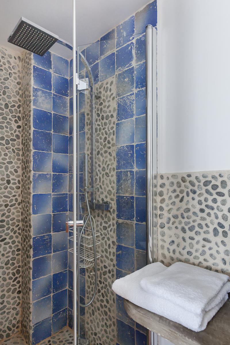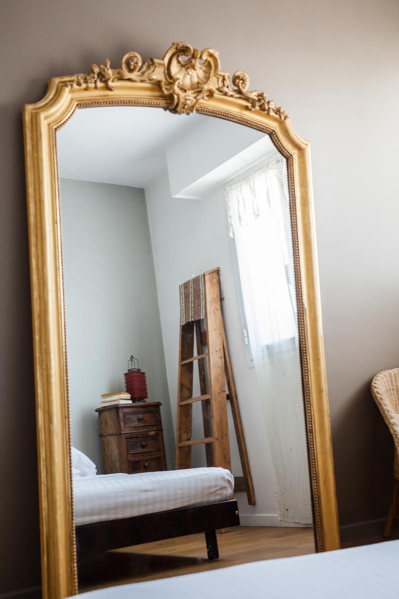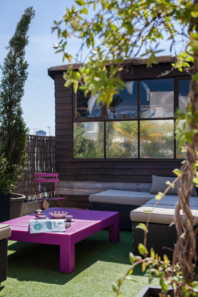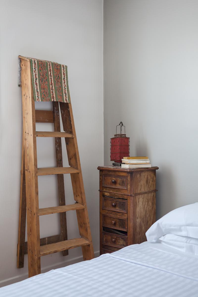 La rue de la Convention II est située à huit étages au-dessus de Vaugirard. Vous entrez dans un couloir, au bout duquel se trouve le salon. Des antiquités de caractère (nous avons trouvé le coffre en bois particulièrement charmant), des fauteuils en cuir adouci et des tapis et coussins en fourrure donnent à cette chambre une atmosphère détendue. Elle jouxte la cuisine tout aussi accueillante – peinte au pastel, avec une table familiale classique – à droite. Dans les deux pièces, de larges fenêtres s’ouvrent sur la terrasse surélevée de cette maison, où vous trouverez un canapé en osier, entouré de plantes florissantes, et une vue de Paris d’en haut.