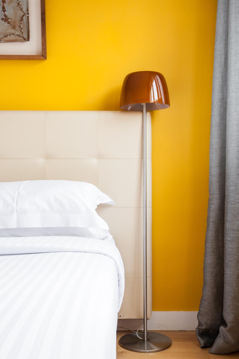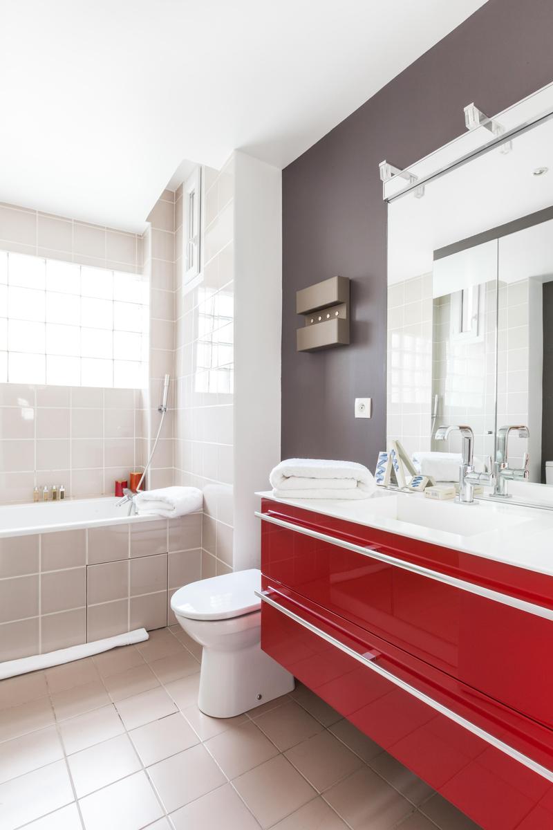 Les deux salles de bains sont toutes neuves dans un rouge fascinant, et la cuisine moderne est élégante avec du chrome poli. Et tandis que le balcon est luxuriant avec des éclats orange juteux, la chambre principale est toute rougeoyante dans un jaune soleil glorieux.